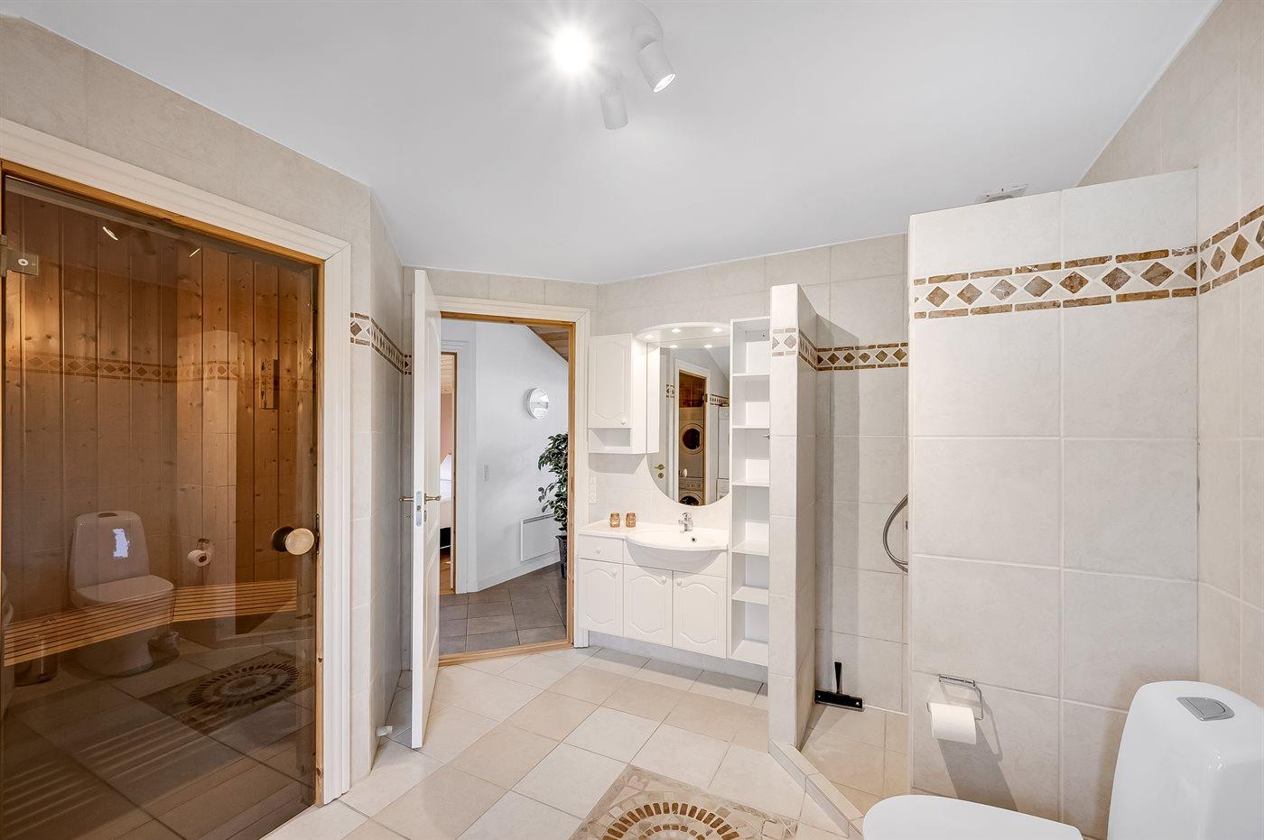 Es gibt 1 Badezimmer mit Duschnische und 2 Toiletten, davon 1 Gästetoilette. Fußbodenheizung in 1 Badezimmer. Es steht eine Sauna zur Verfügung in der Sie sich so richtig entspannen können.