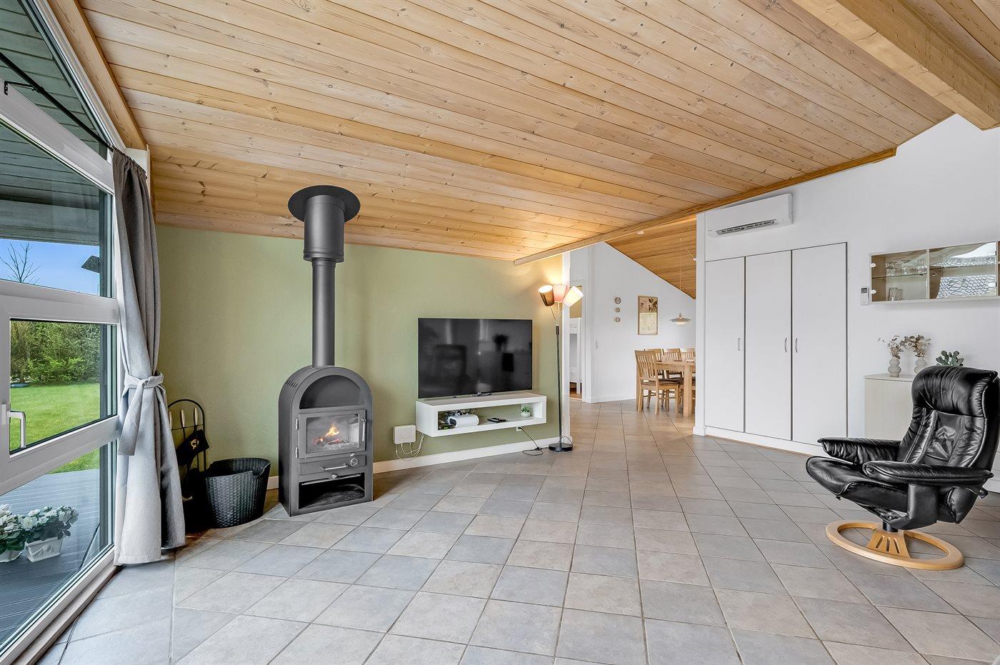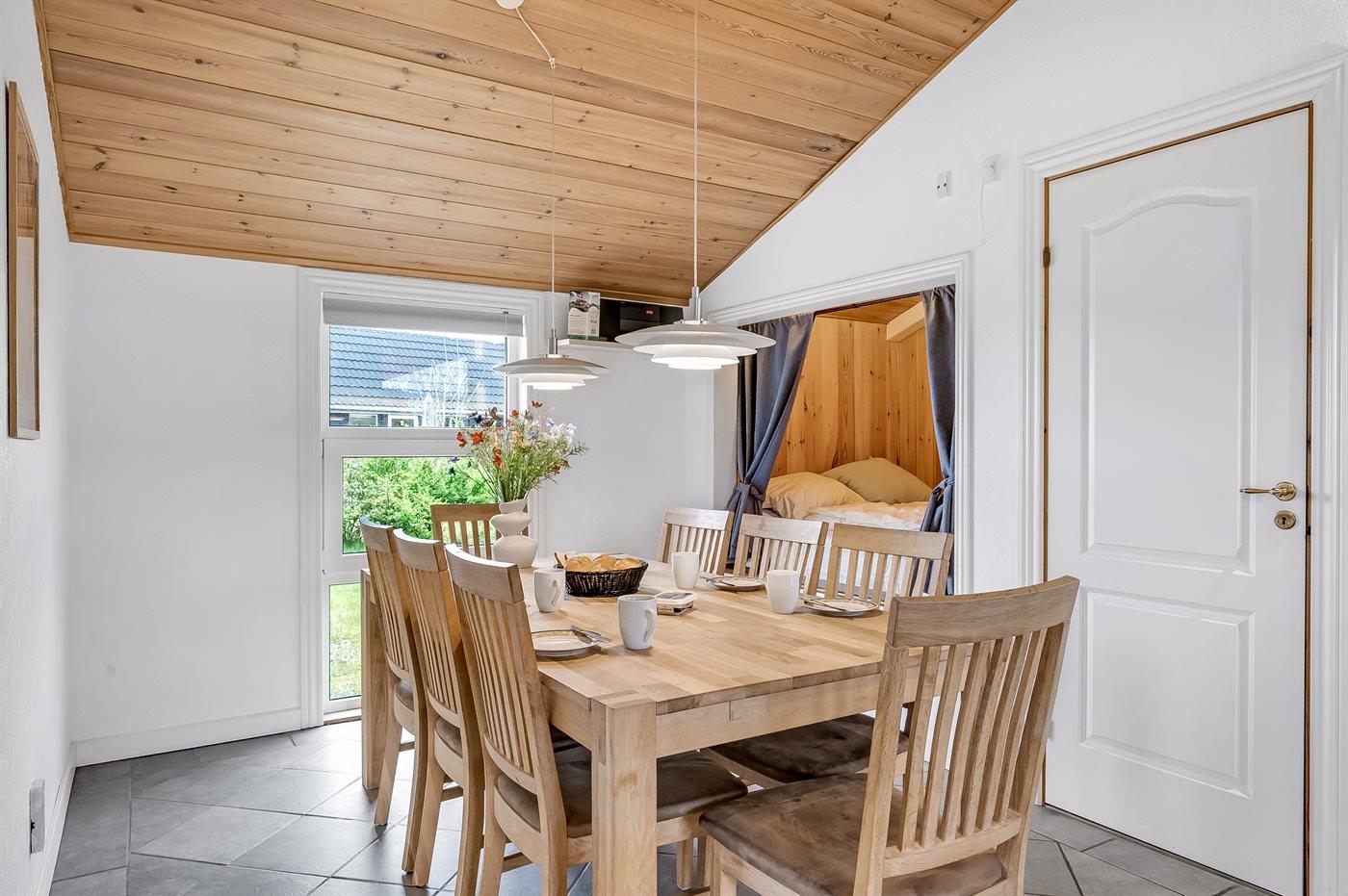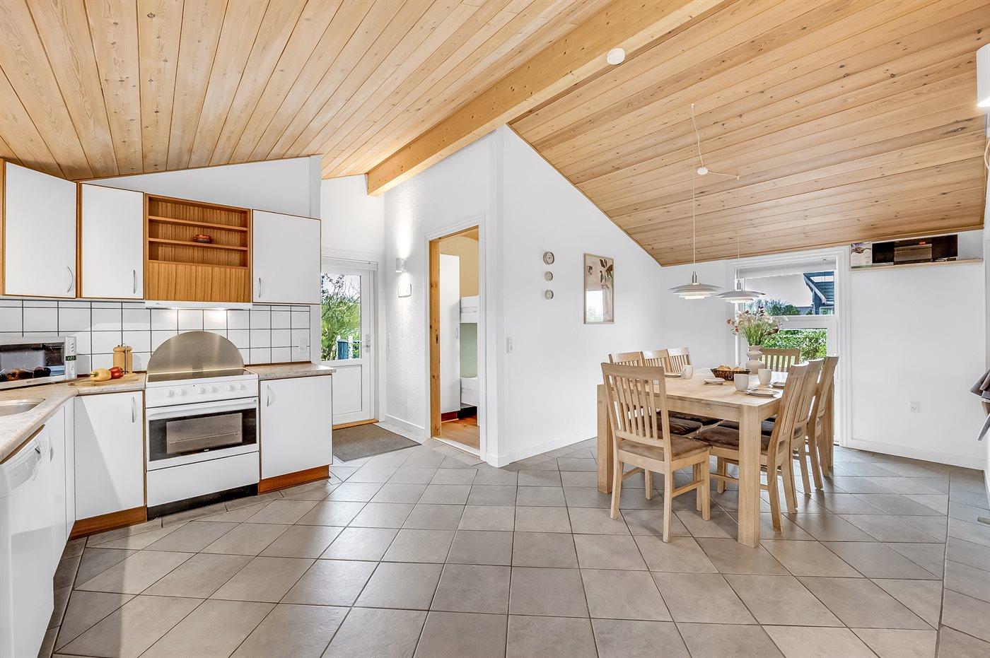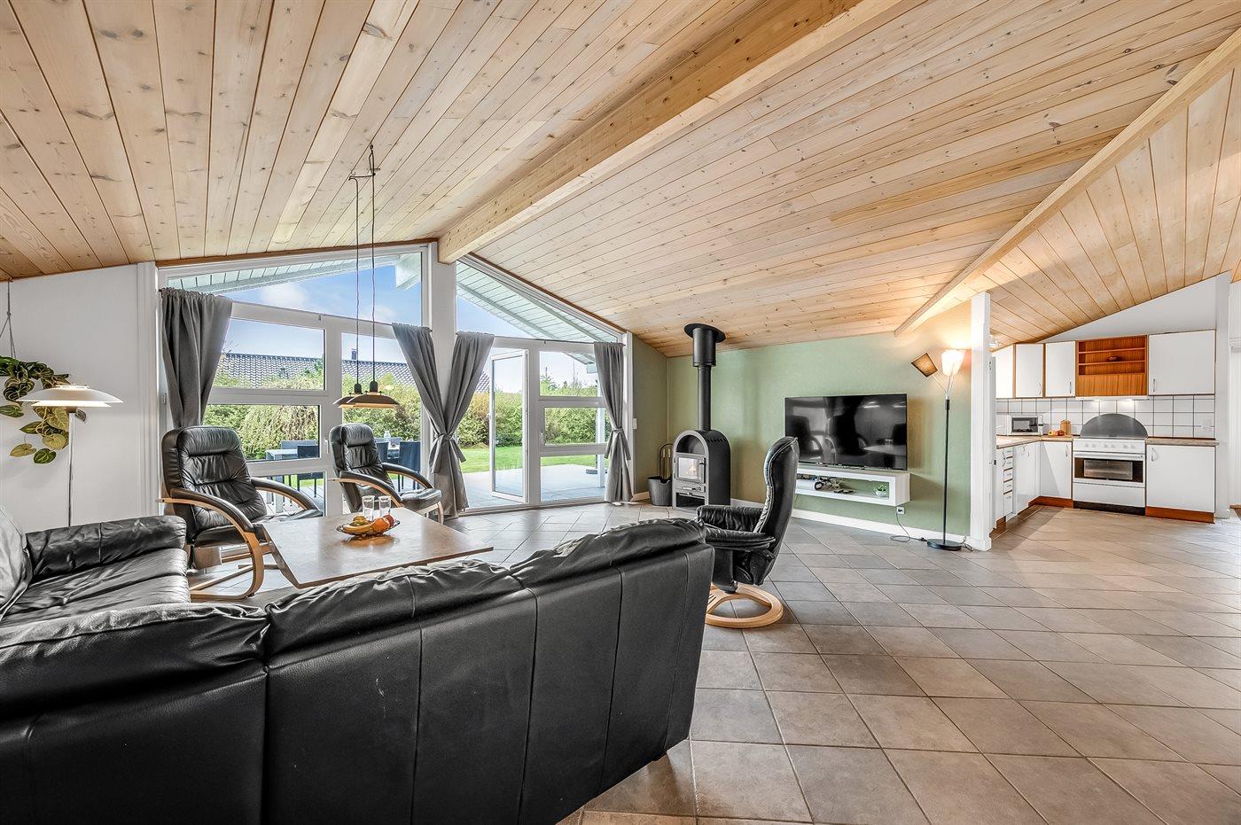 Der Mittelpunkt in diesem geräumigen Ferienhaus ist der große Wohn-Küchenbereich, wo die großen Fenster für ein gutes Lichteinfall sorgen. Hier kannst du es dir mit einem guten Buch auf der Couch gemütlich machen mit dem Knistern des Kaminofens im Hintergrund. Oder mache es dir mit einem Brettspiel am großen Esstisch gemütlich. Direkt neben dem Esstisch findest du den gemütlichen Alkoven – perfekt, um sich ein bisschen zurückzuziehen und trotzdem Teil des Geschehens zu bleiben.