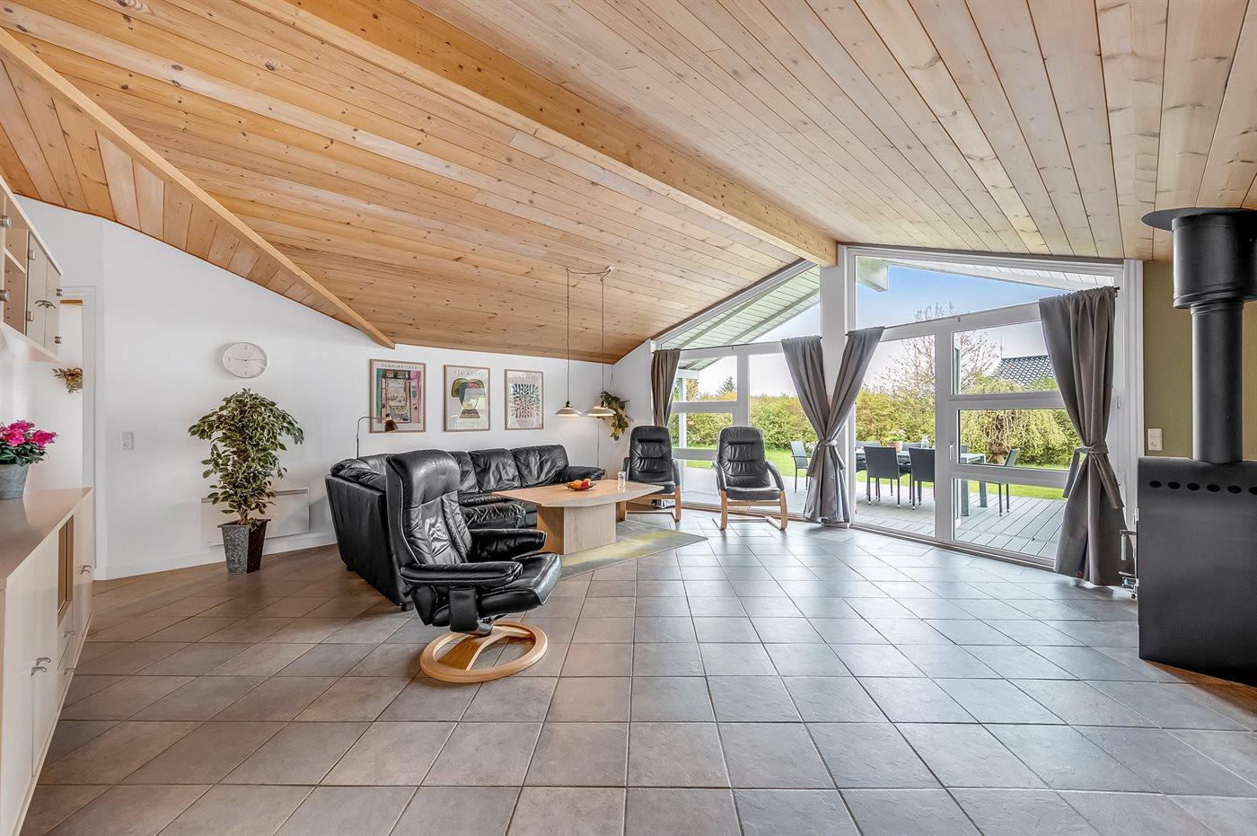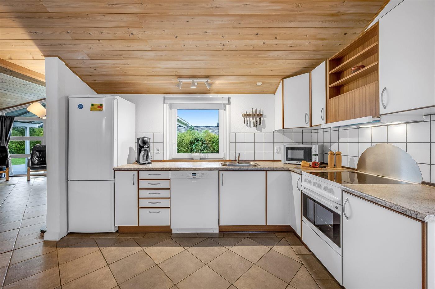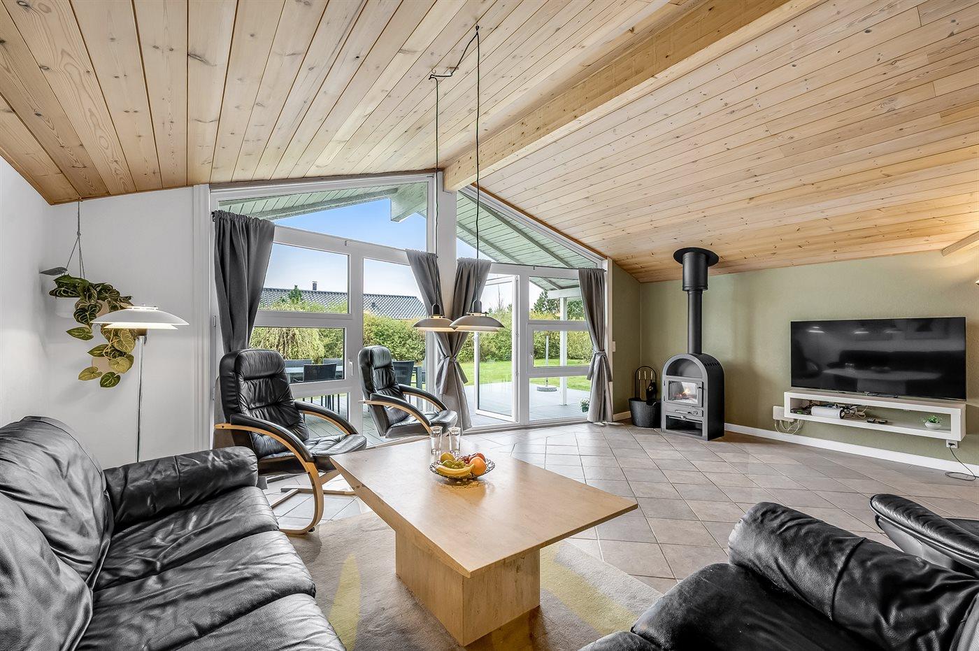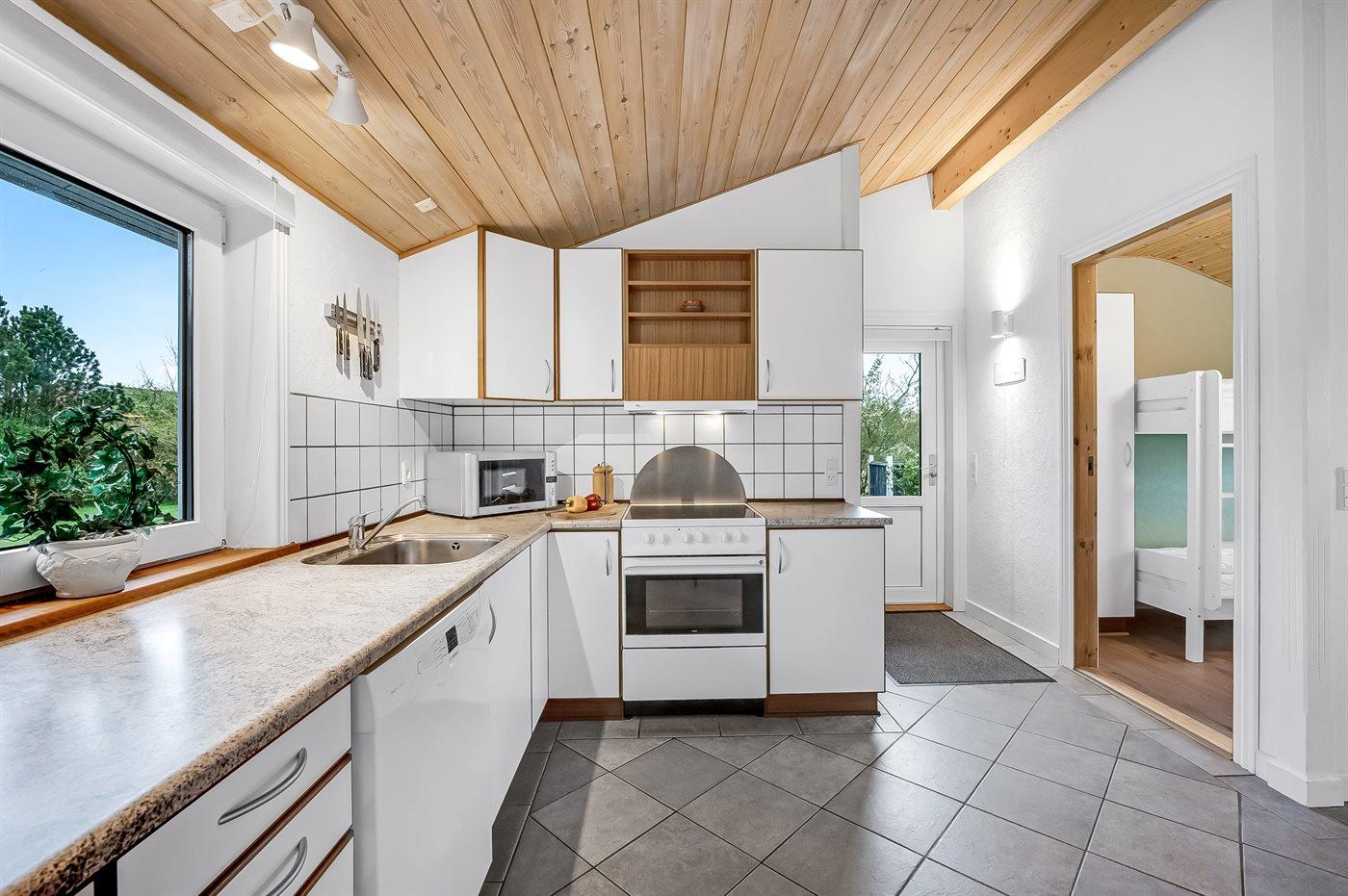 Der Mittelpunkt in diesem geräumigen Ferienhaus ist der große Wohn-Küchenbereich, wo die großen Fenster für ein gutes Lichteinfall sorgen. Hier kannst du es dir mit einem guten Buch auf der Couch gemütlich machen mit dem Knistern des Kaminofens im Hintergrund. Oder mache es dir mit einem Brettspiel am großen Esstisch gemütlich. Direkt neben dem Esstisch findest du den gemütlichen Alkoven – perfekt, um sich ein bisschen zurückzuziehen und trotzdem Teil des Geschehens zu bleiben.