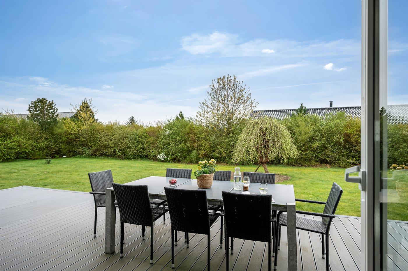 Vom Wohn-Küchenbereich gelangst du direkt auf die Holzterrasse und in den Garten – hier gibt es reichlich Platz für Ballspiele und zum herumtollen für Kinder und Hunde. Bist du Angler, steht dir ein Fischreinigungsplatz, ein Grill und ein Räucherofen zur Verfügung – außerdem gibt es Stauraum für Angelzubehör.