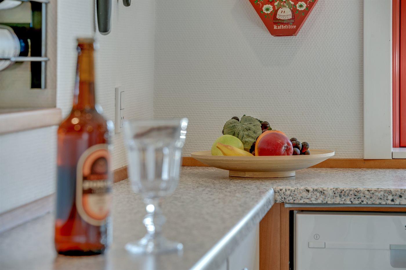 Die Küche ist mit Kühlschrank ausgestattet. Außerdem gibt es 4 Induktions-Kochzonen, Umluftofen, Mikrowelle sowie Geschirrspüler.