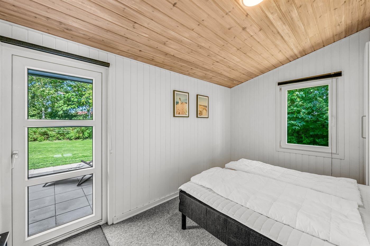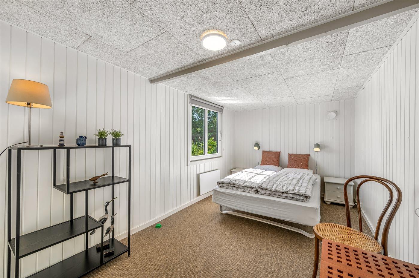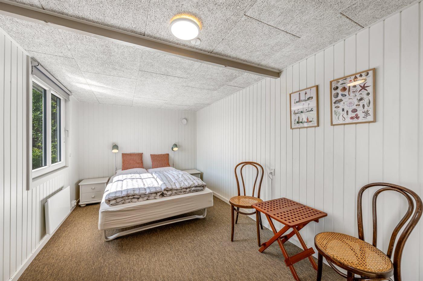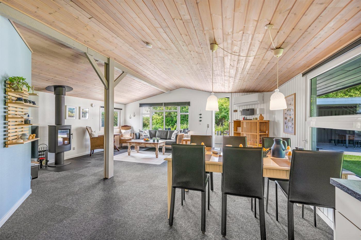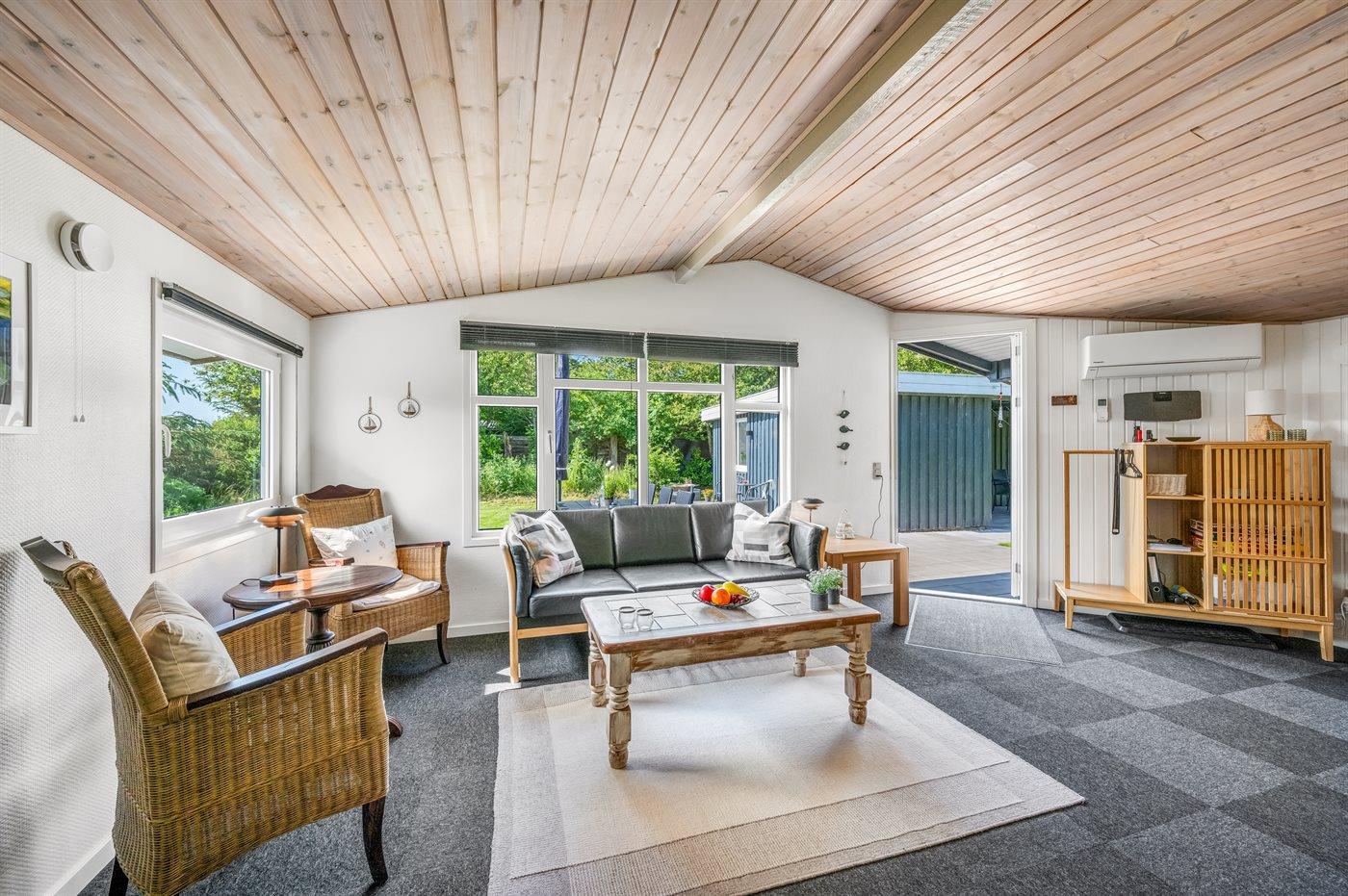 Das Sofa lädt zum Entspannen ein – mit dem Knistern des Kaminofens im Hintergrund. Zum Ferienhaus gehört auch ein gemütliches Gästehaus mit Doppelbett und viel Platz. Es ist der perfekte Ort für Teenager oder auch ein idealer Rückzugsort mit einem guten Buch, wenn du mal eine kleine Pause vom Beisammensein brauchst.