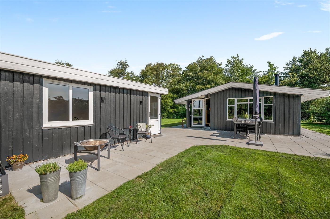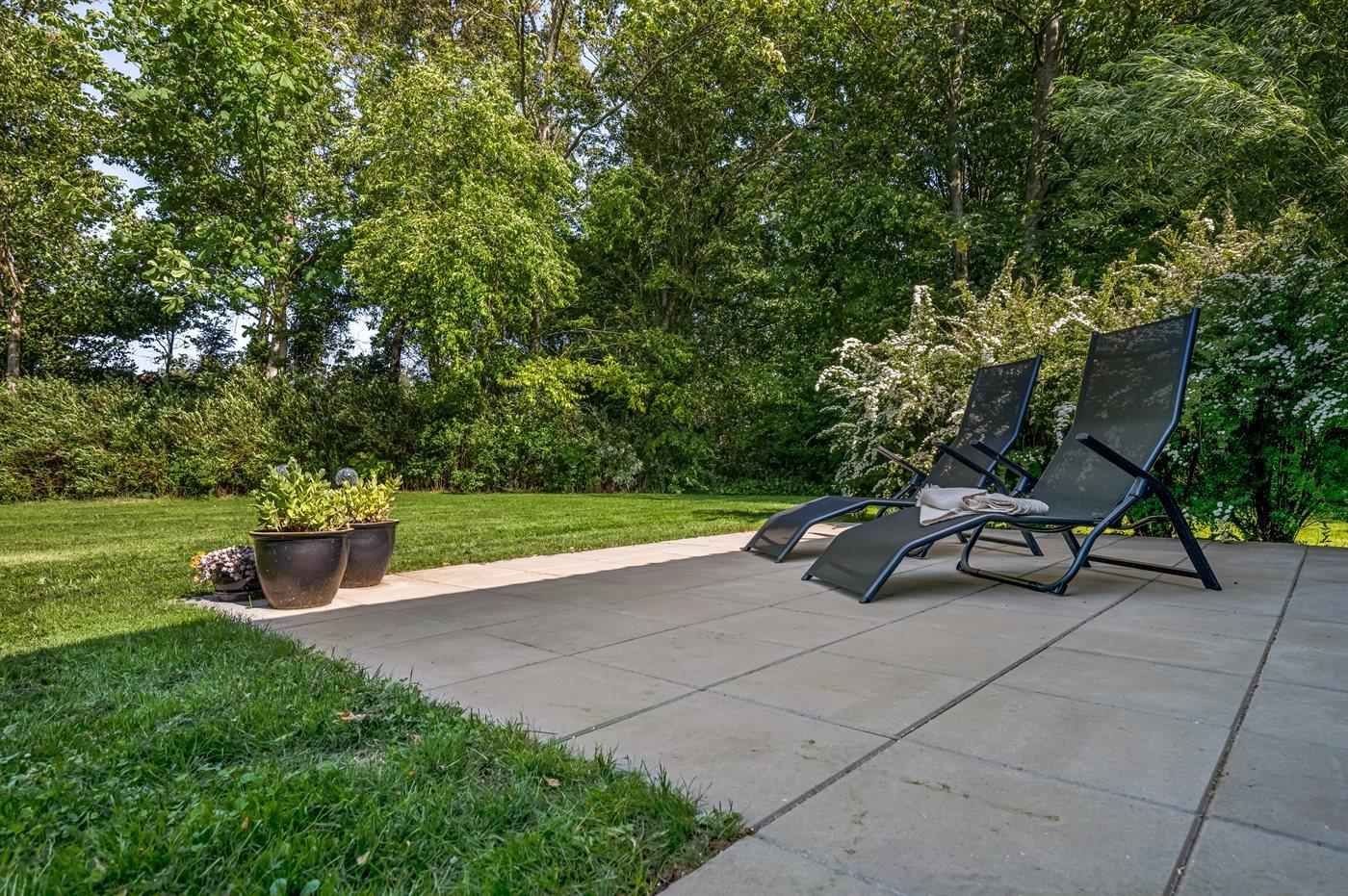 Draußen auf den Terrassen gibt es viele windgeschützte Ecken, und du kannst hier viele Stunden verbringen, während Kinder und Hund auf der großen Rasenfläche spielen oder toben.