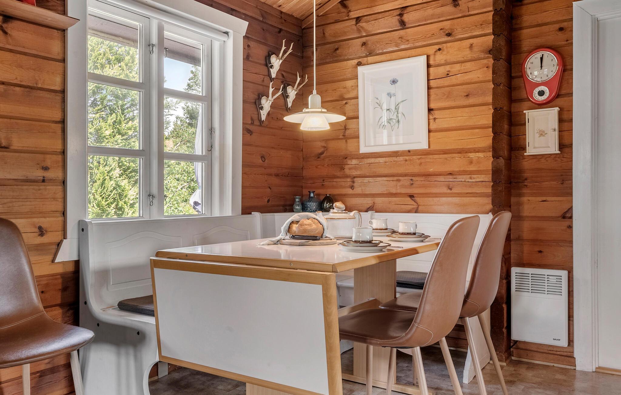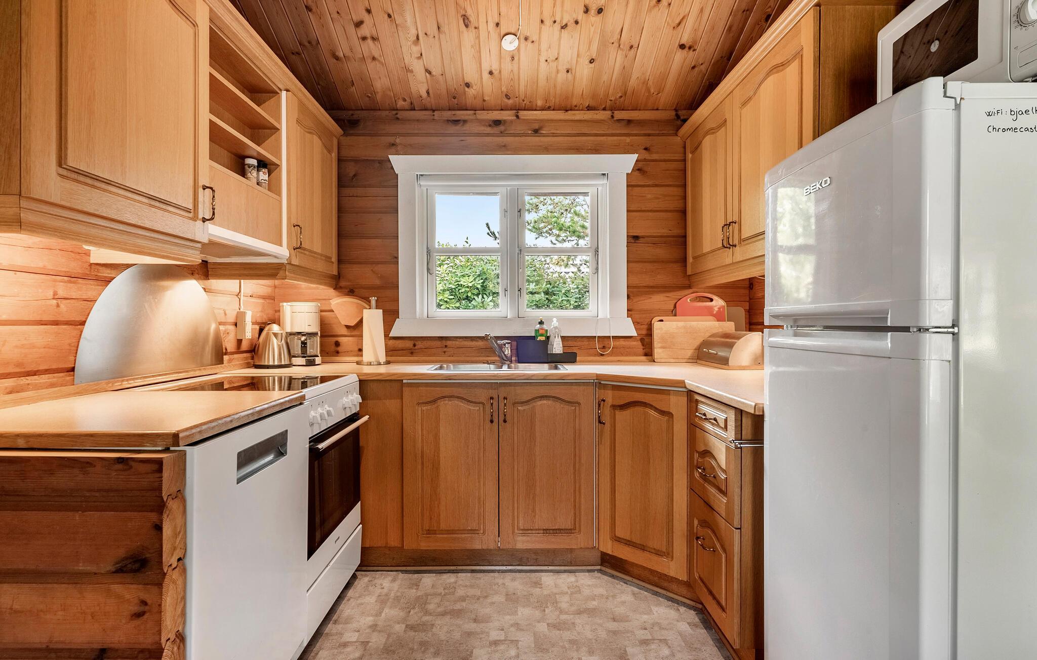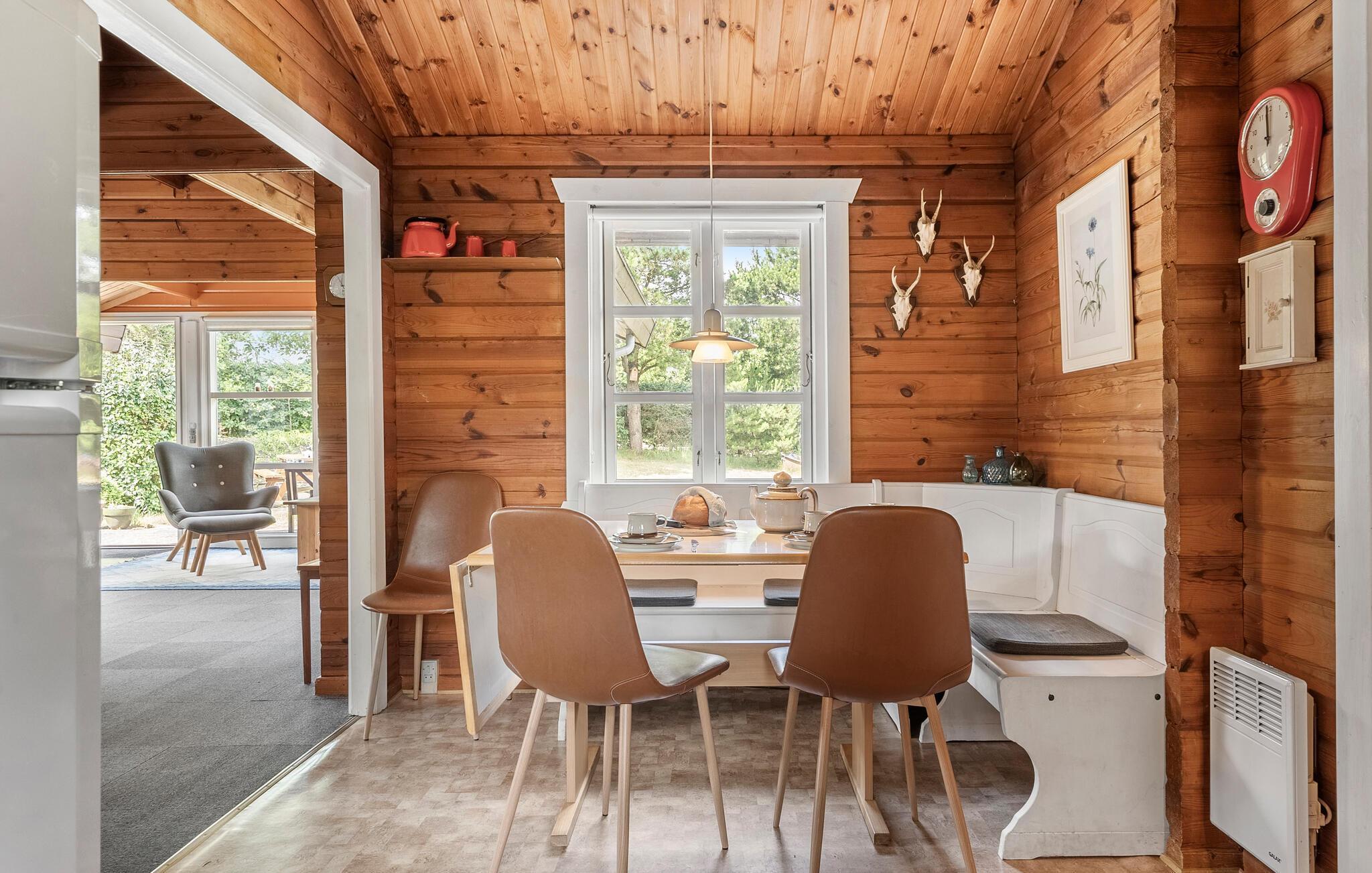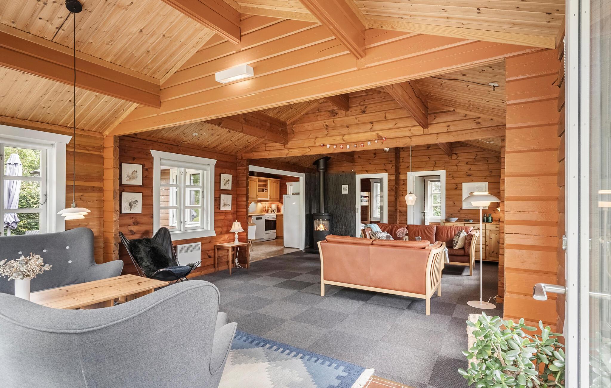 Das Innere dieses Hauses zeichnet sich durch Rustikalität und Wärme aus. Eine naturfarbene Holzvertäfelung, gemütliche Sofas und ein Kaminofen sorgen für eine Atmosphäre, in der Sie sich wohlfühlen und schnell entspannen können. Hören Sie Ihre Lieblingsmusik, einen interessanten Podcast oder genießen Sie einfach nur das Nichtstun. Die moderne Küche lädt dazu ein, gemeinsam zu kochen und ausgiebig zu tafeln.