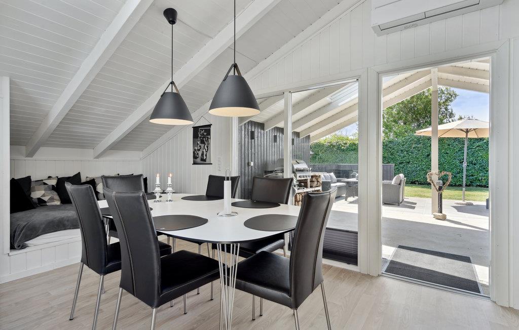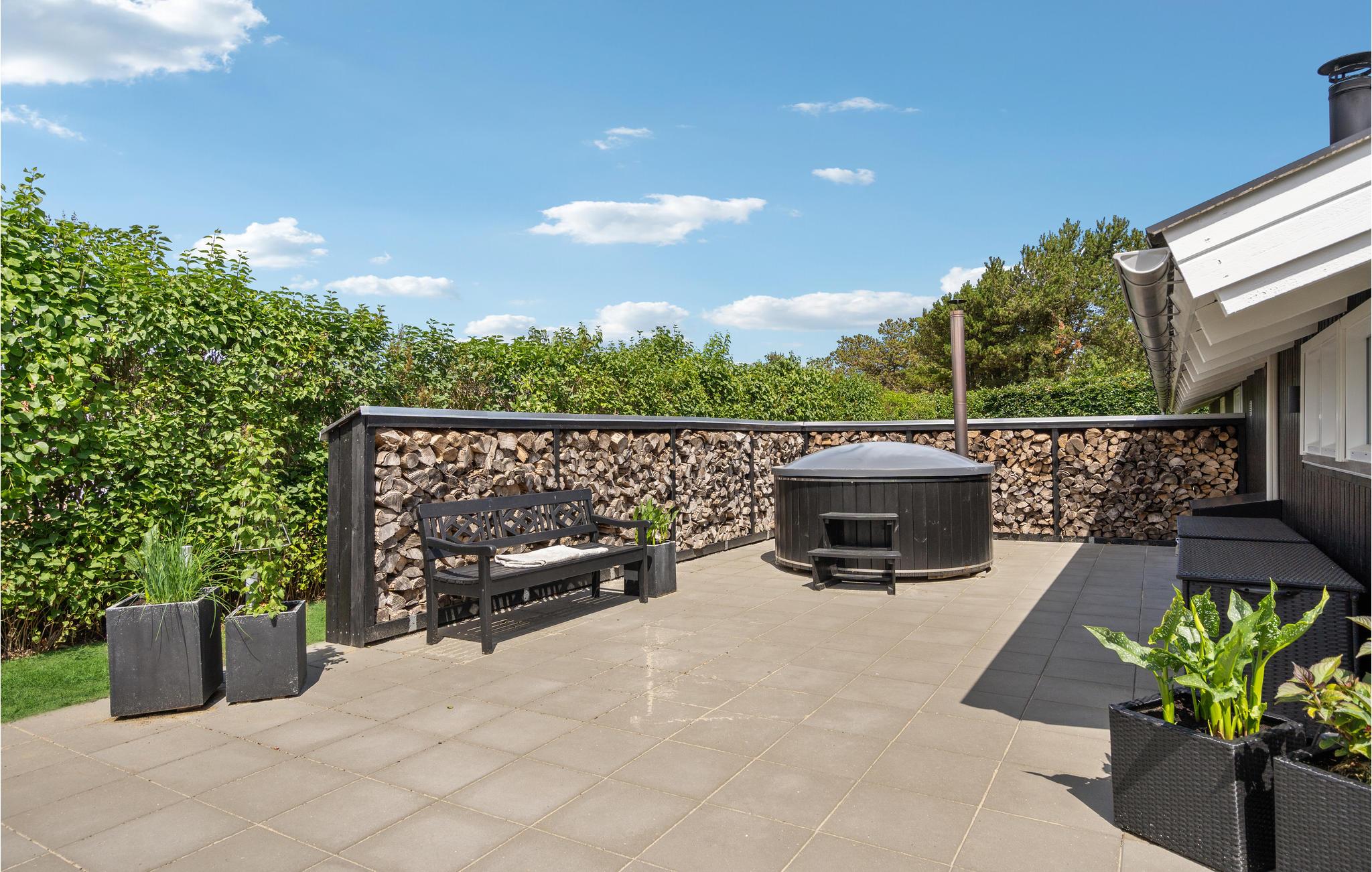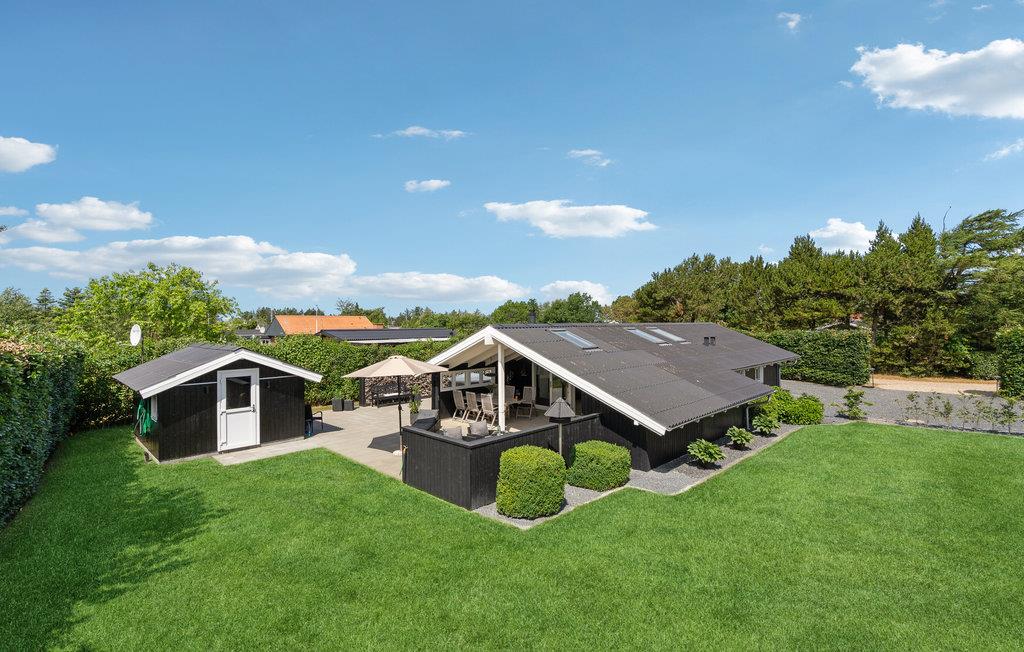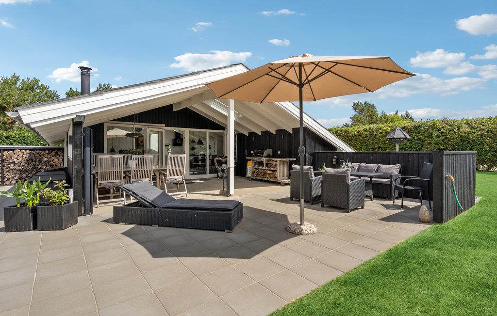Modernes Ferienhaus mit Kamin und finnischem Holzbad nahe kinderfreundlichem Strand in Skaven Strand, Dänemark.