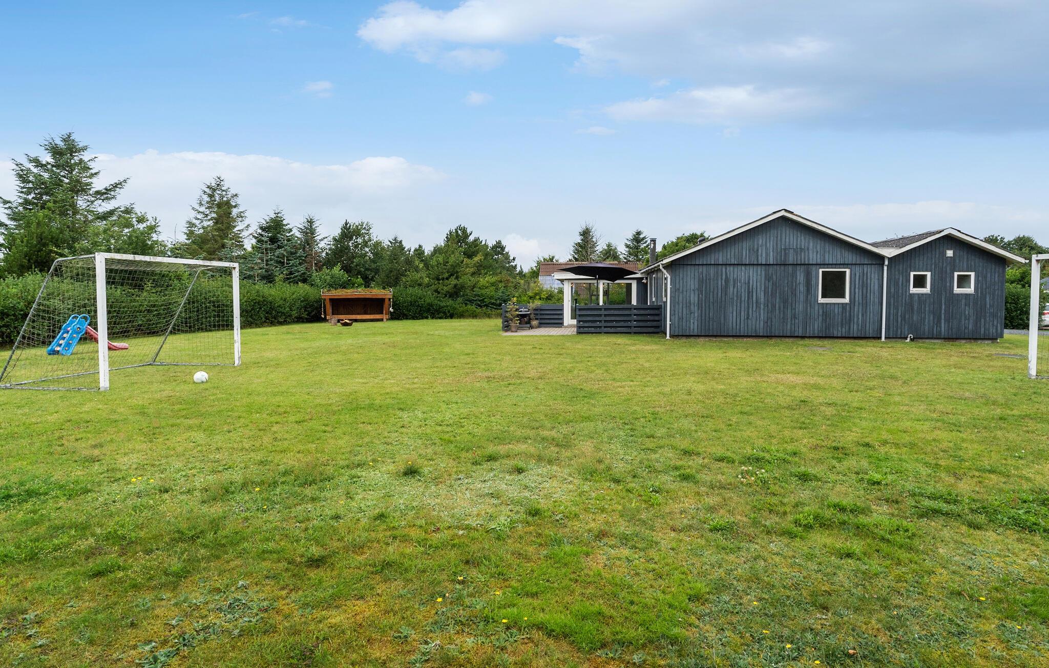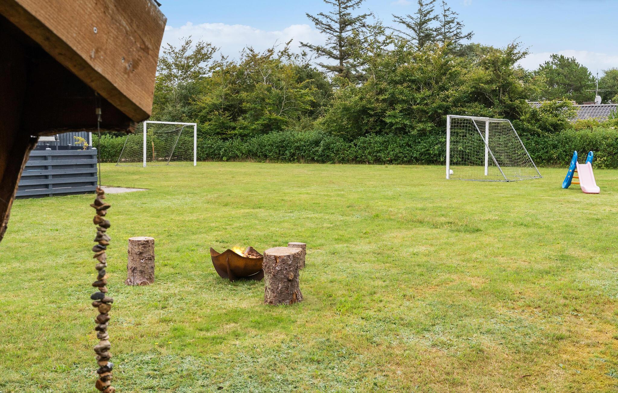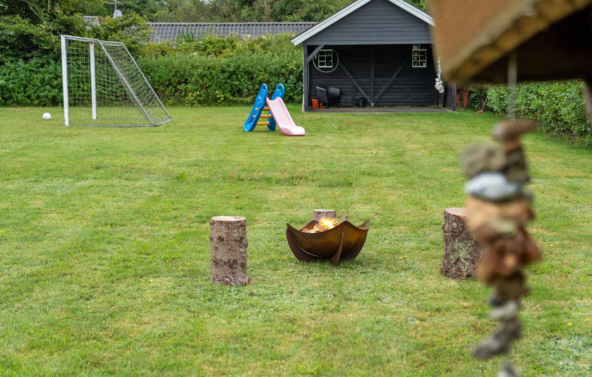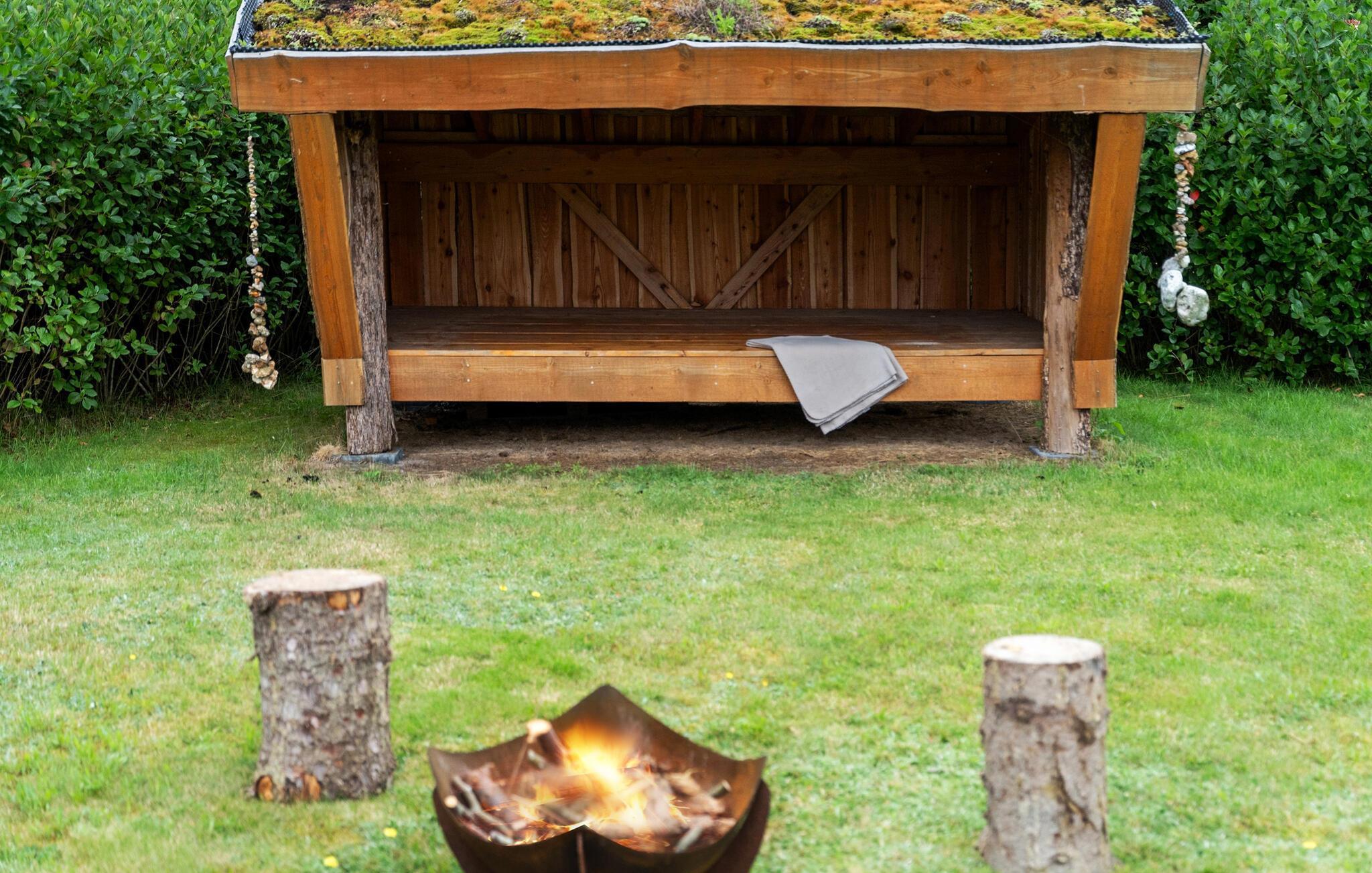 Verlegen Sie das Urlaubsleben nach draußen auf die Terrasse. Die weitläufige Rasenfläche lädt zum Ballspielen ein, während die Shelterhütte ein schöner Rückzugsort ist. Abends kommt die ganze Familie an der kleinen Feuerstelle zusammen.