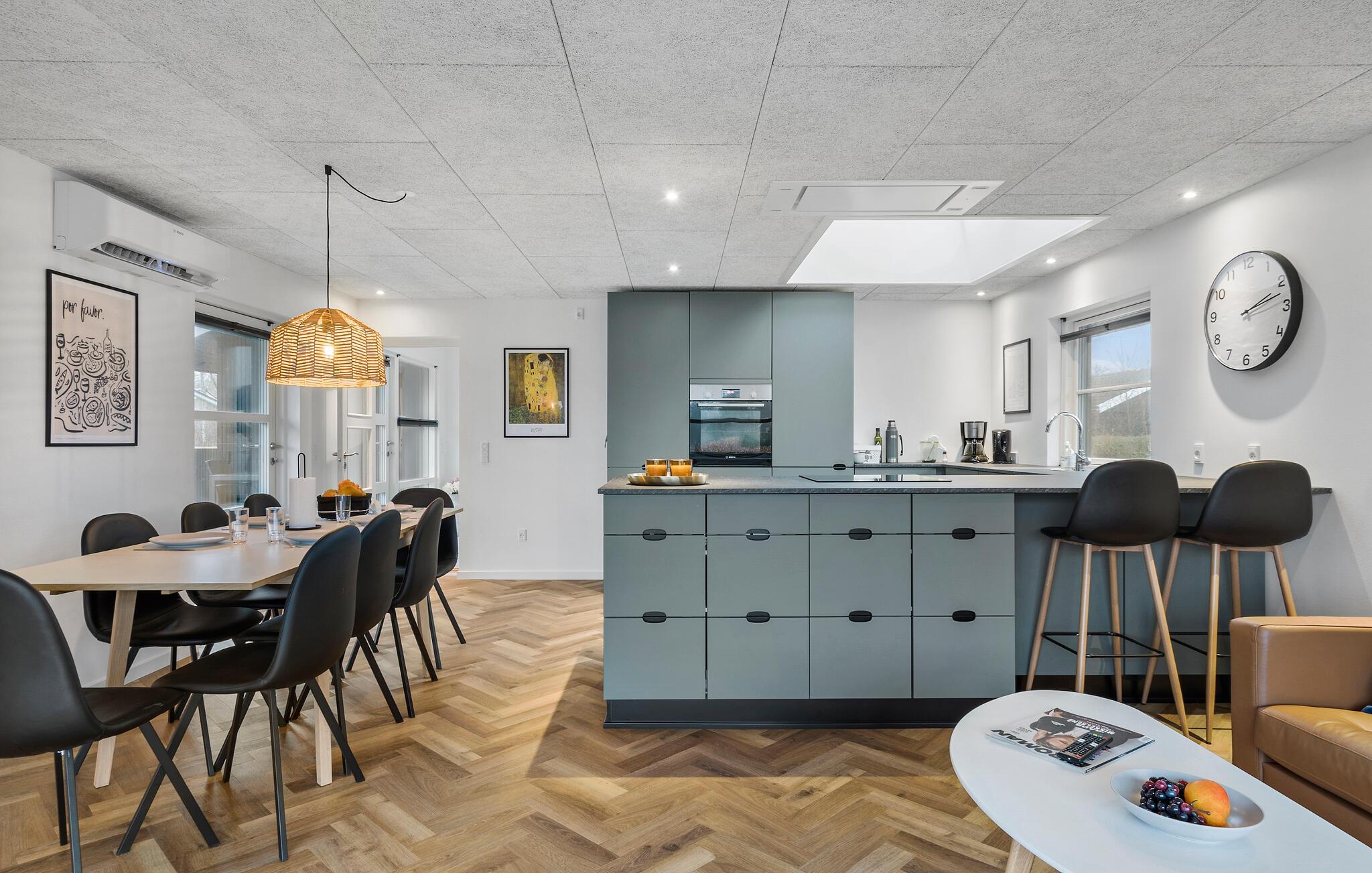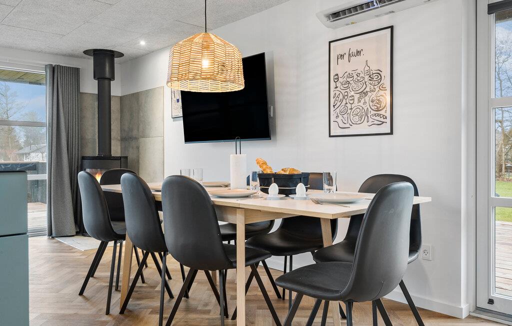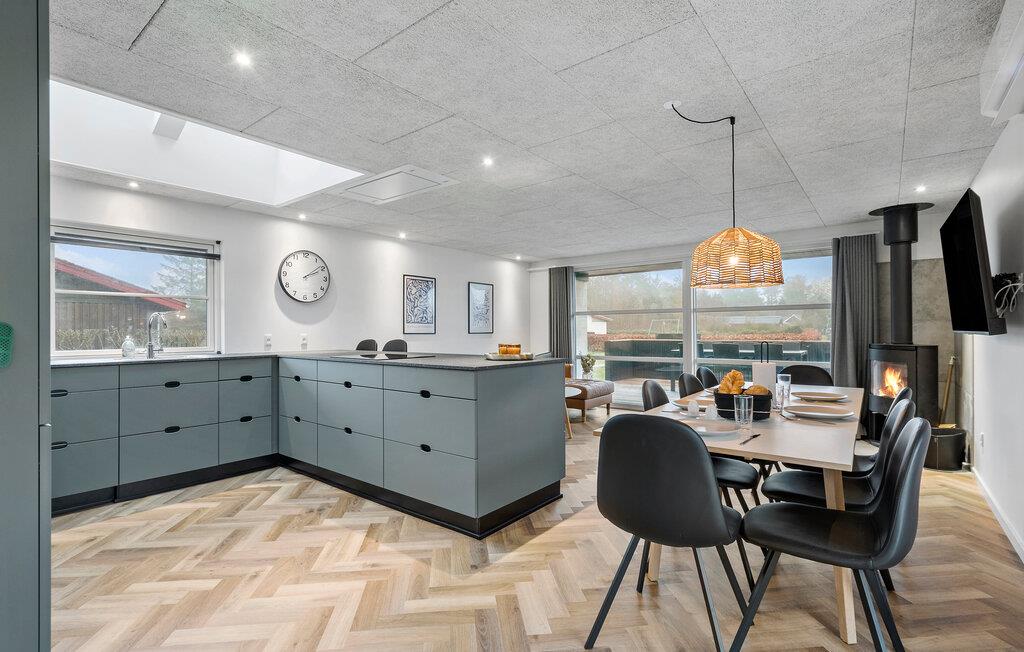Der offene Wohnraum verbindet harmonisch die moderne, voll ausgestattete Küche mit dem gemütlichen Ess- und Wohnbereich. Hier können Sie sich am knisternden Holzofen entspannen oder gesellige Abende bei gemeinsamen Mahlzeiten verbringen. Die stilvolle Dekoration schafft eine warme Atmosphäre, in der Sie sich sofort wohlfühlen.