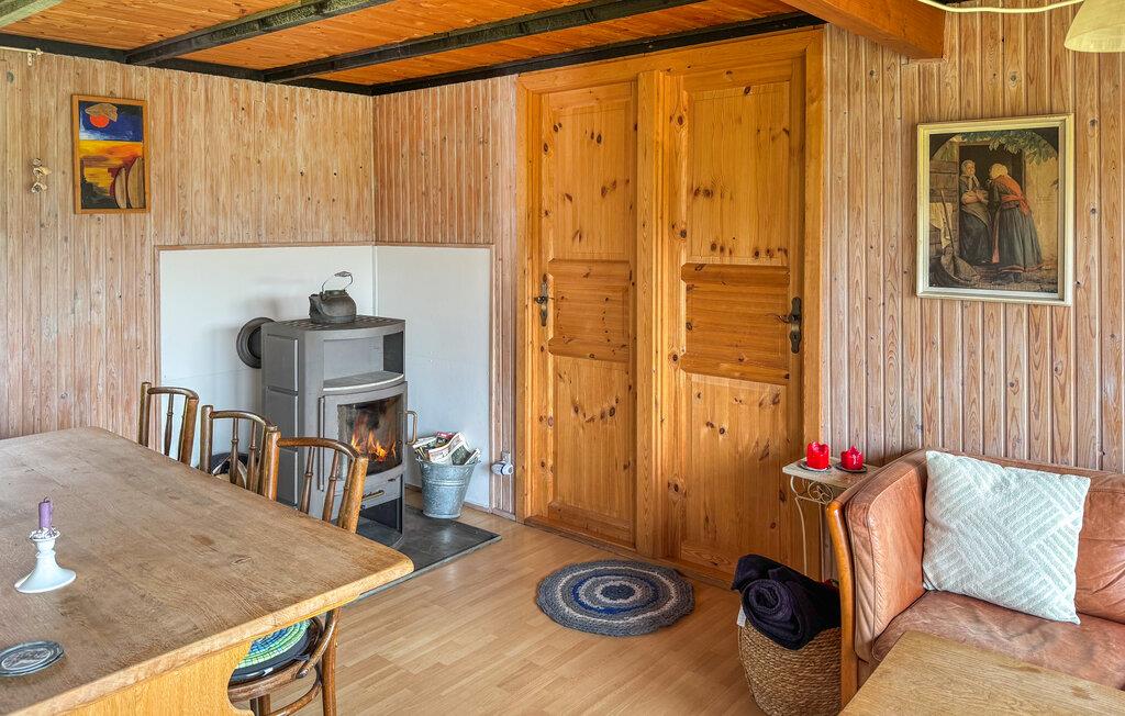 Erleben Sie in diesem Haus Ruhe, Natur und nordische Gemütlichkeit. Im Innenbereich erwartet Sie ein gemütliches Ambiente mit Sofa, Esstisch und einer schönen Aussicht aus den großen Fenstern.