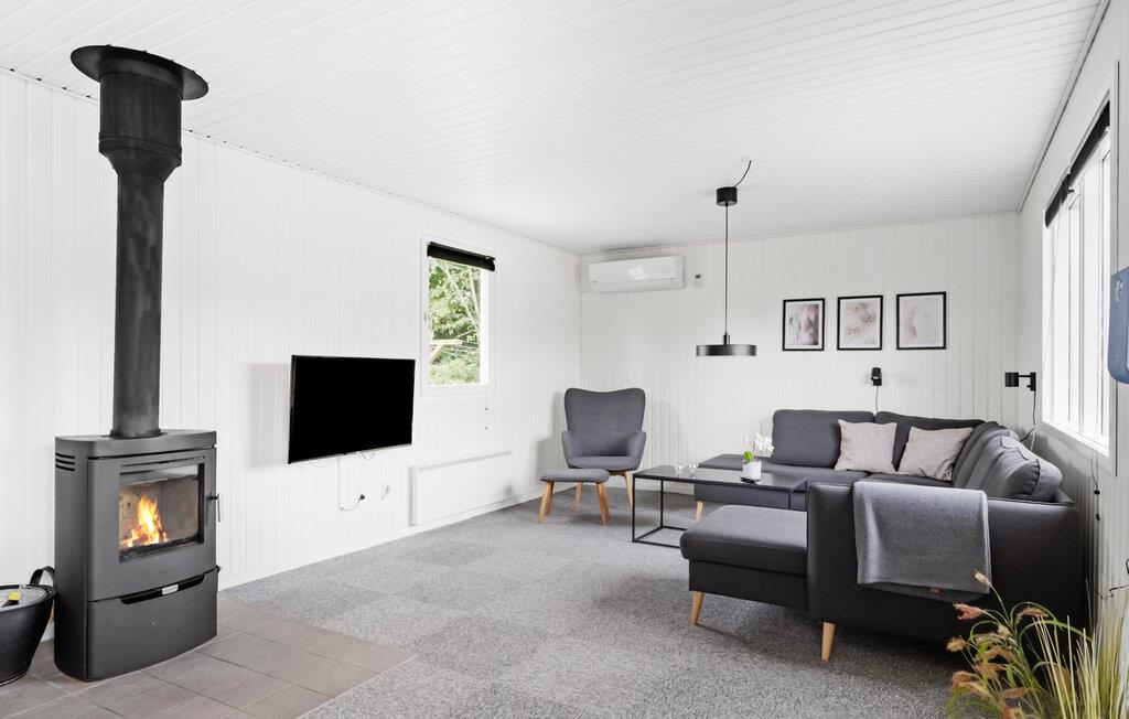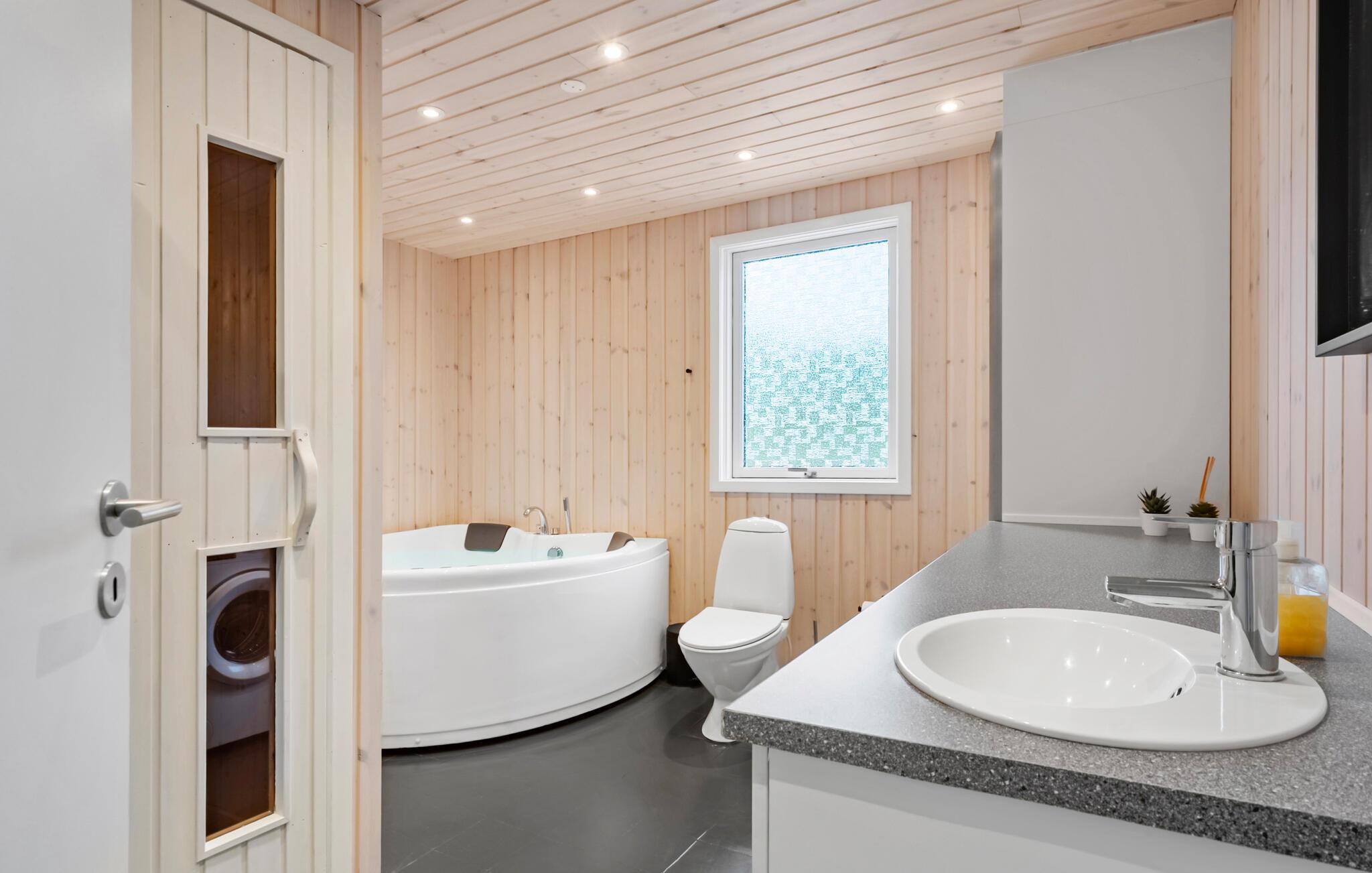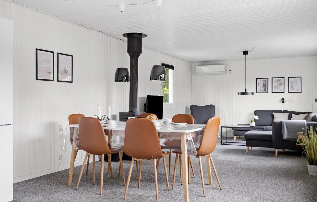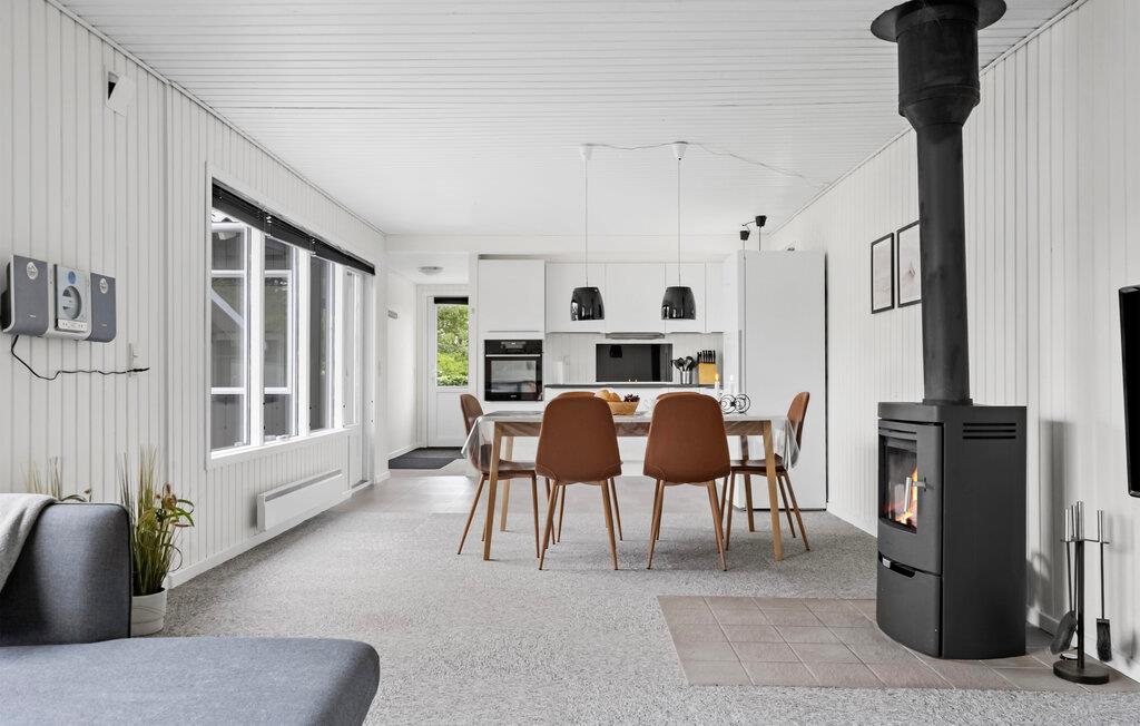 Dieses Haus vereint schlichte Eleganz mit Gemütlichkeit zu einem harmonischen Ambiente. Großzügige Räume, die mit hellem Holz vertäfelt sind, schaffen eine angenehme Atmosphäre, in der Sie schnell zur Ruhe kommen können. Entspannen Sie sich an kühlen Tagen in der Sauna und machen Sie es sich nach einem erlebnisreichen Tag am Kaminofen gemütlich.