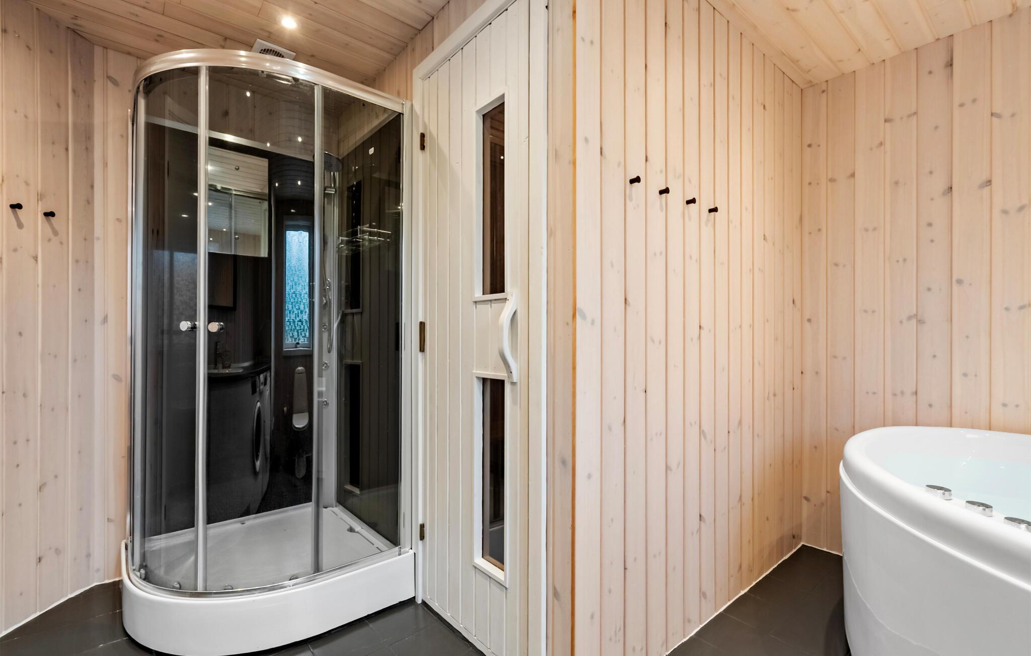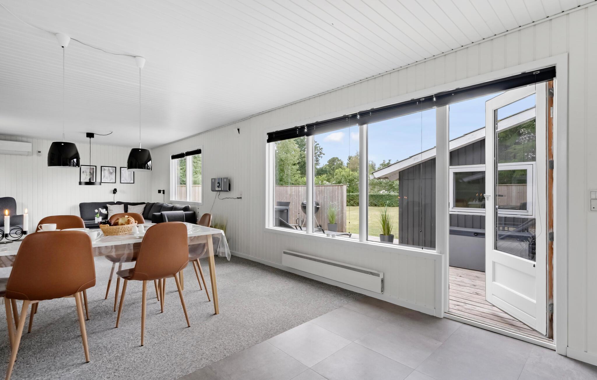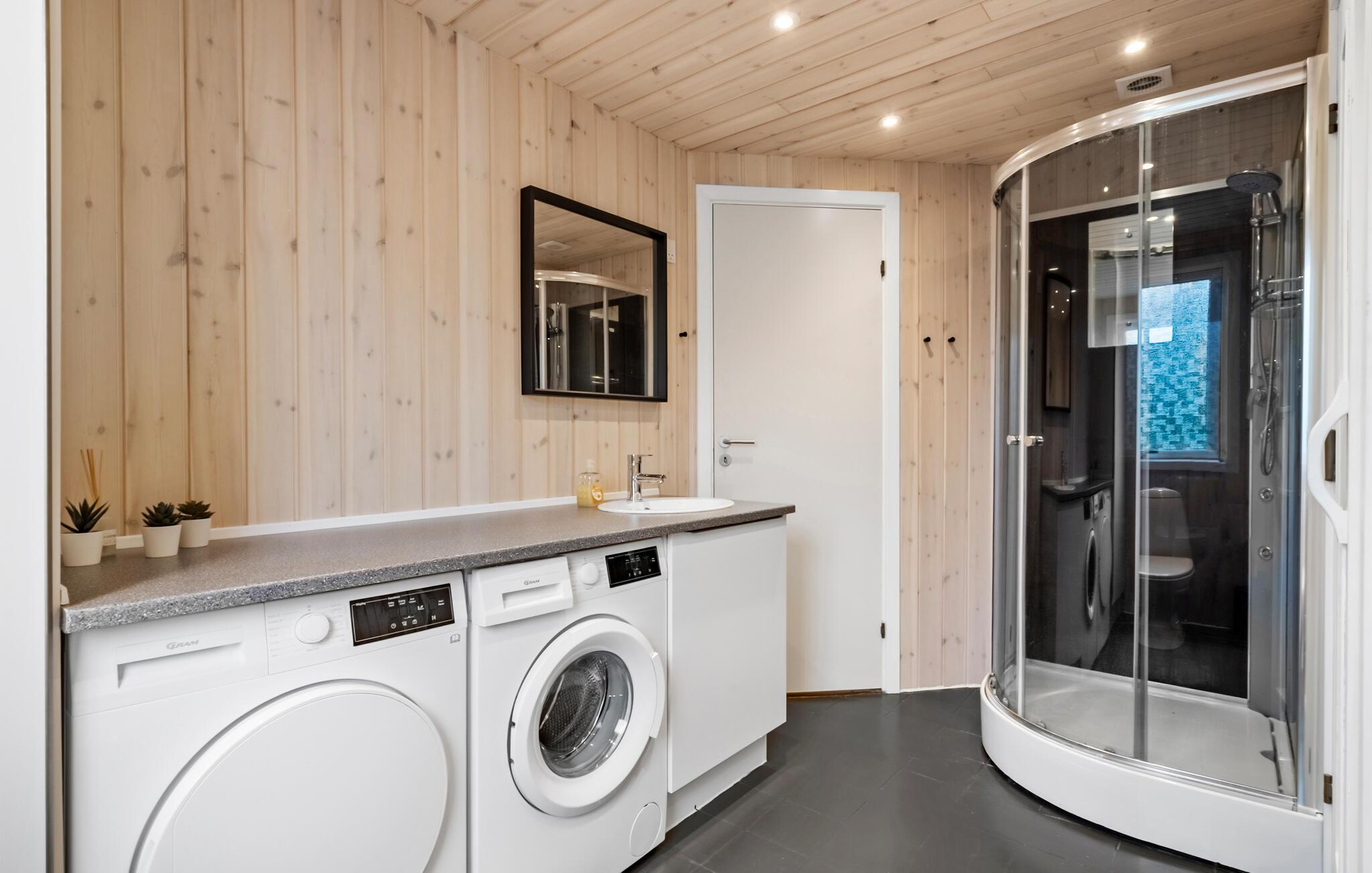 Dieses Haus vereint schlichte Eleganz mit Gemütlichkeit zu einem harmonischen Ambiente. Großzügige Räume, die mit hellem Holz vertäfelt sind, schaffen eine angenehme Atmosphäre, in der Sie schnell zur Ruhe kommen können. Entspannen Sie sich an kühlen Tagen in der Sauna und machen Sie es sich nach einem erlebnisreichen Tag am Kaminofen gemütlich.