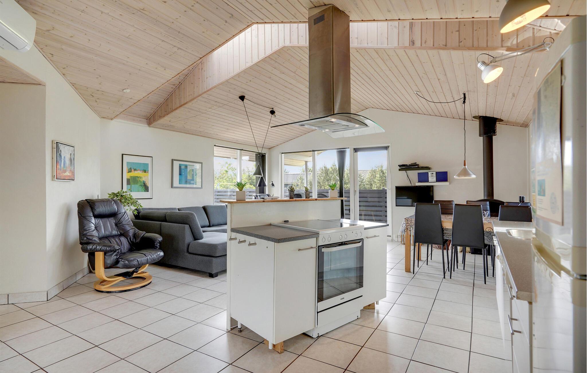 In grüner Umgebung erwartet Sie dieses charmante Ferienhaus, das mit einer wohnlichen Einrichtung und angenehme Wohlfühlatmosphäre überzeugt. Die offene Küche mit Essbereich ist der perfekte Ort für gemeinsames Kochen und gemütliche Mahlzeiten. Der Holzofen im Wohnzimmer sorgt für wohlige Wärme bei Filmabenden mit der Familie. Ein Highlight ist das Badezimmer mit Whirlpool und Sauna, das für Entspannung sorgt.