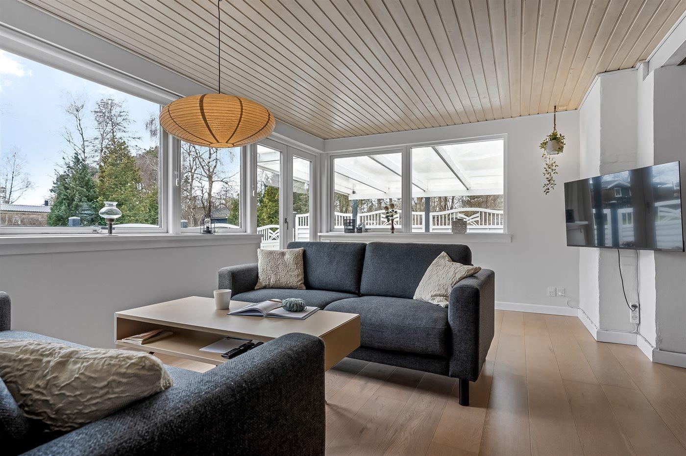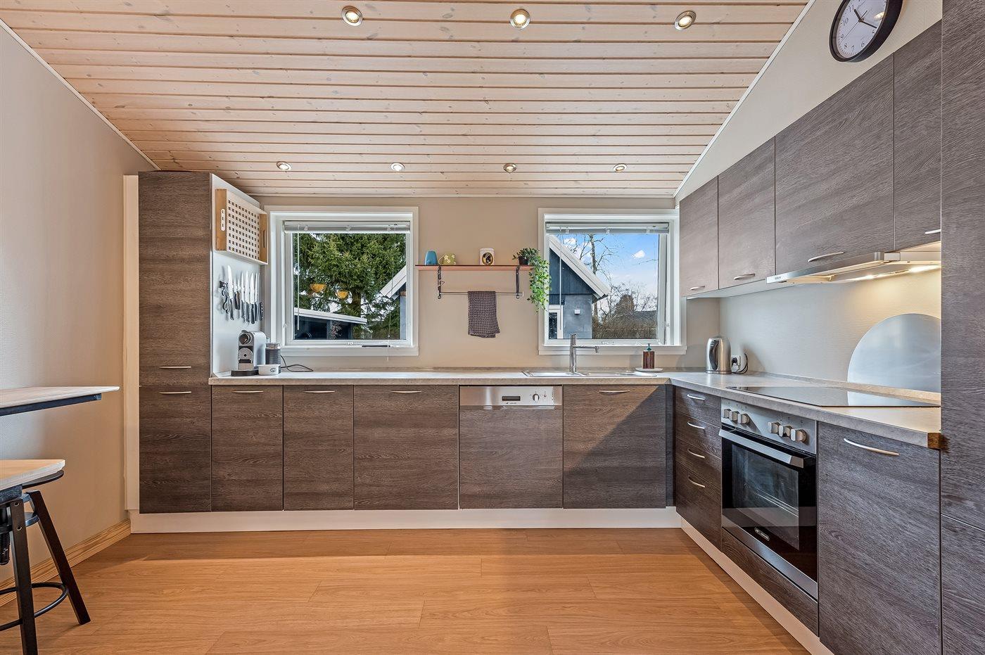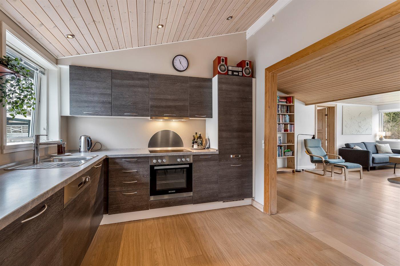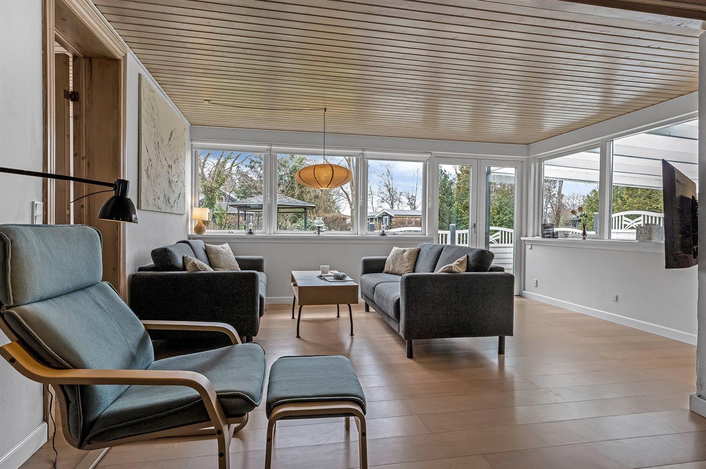 Das Haus verfügt unter anderem über eine große, offene Küche, ein geräumiges Wohnzimmer mit Essecke sowie drei schöne Schlafzimmer, alle mit Doppelbett (es gibt keine Kleiderschränke in den Schlafzimmern). Vom Wohnzimmer aus gelangst du auf die überdachte Terrasse, wo du das Abendessen auf dem Grill zubereiten kannst. Im Garten gibt es viel Platz für Ballspiele und andere Aktivtäten im Freien.