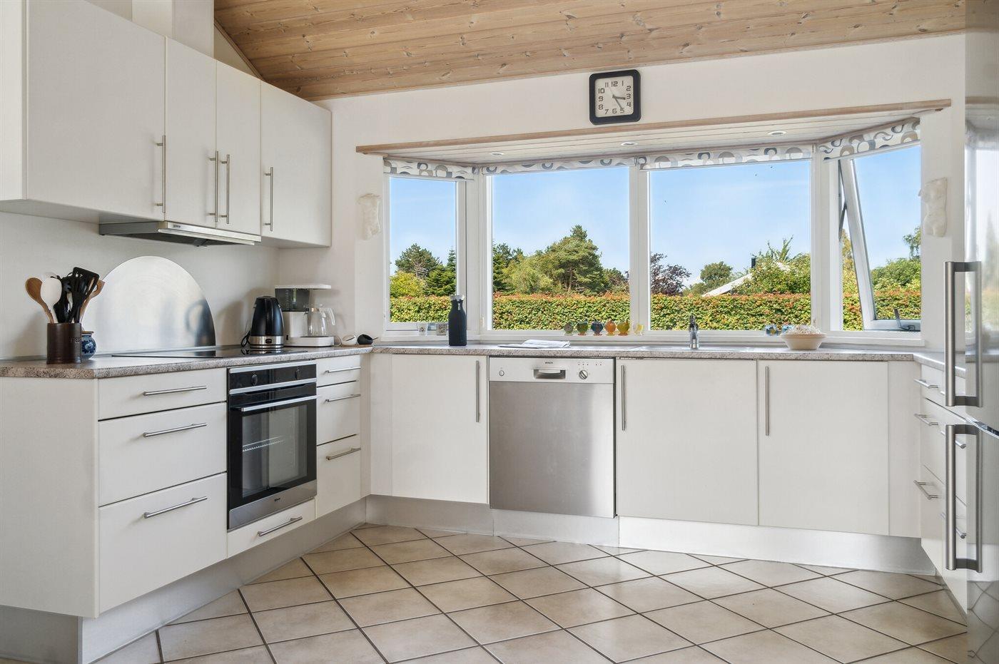 Die Küche ist mit Kühlschrank ausgestattet. Außerdem gibt es 4 Keramik-Kochfelder, Umluftofen, Mikrowelle sowie Geschirrspüler. Fußbodenheizung in der Küche.
