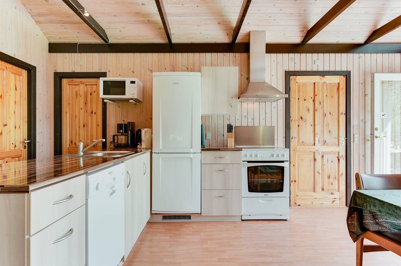 Die Küche ist mit Kühlschrank ausgestattet. Außerdem gibt es 4 Keramik-Kochfelder, Umluftofen sowie Geschirrspüler.