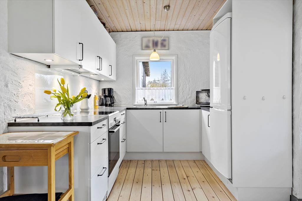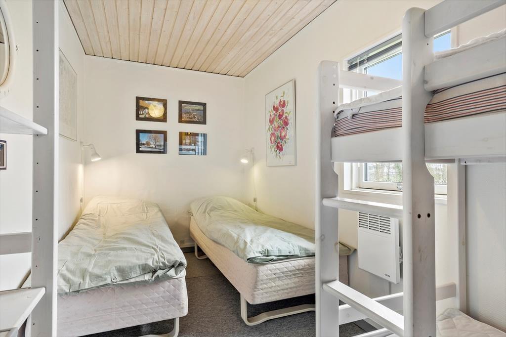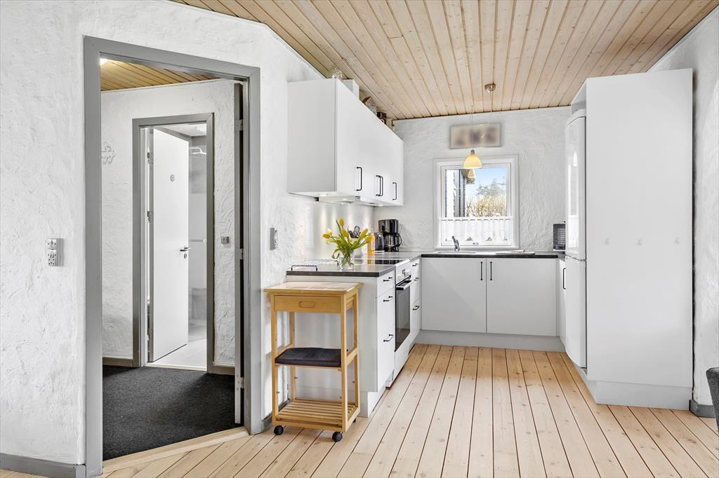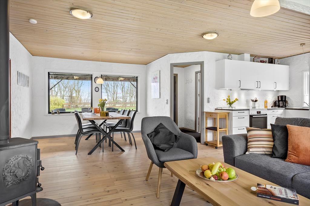 Die 80 m² große Wohnfläche dieses Urlaubsdomizils beherbergt ohne weiteres bis zu sechs übernachtende Urlaubsgäste. Ihnen stehen zwei Schlafräume zur Verfügung. Einer der Schlafräume ist mit einem Doppelbett ausgestattet, der andere mit zwei Einzelbetten und einem Etagenbett. Zusätzlich besteht die Möglichkeit, das Sofa im Wohnbereich in ein Schlafsofa zu verwandeln. Neben der komfortablen Polstergarnitur erwarten Sie im Wohnraum ein Essplatz und ein Kamin. Die Küche des Hauses ist ebenfalls offen in den Wohnbereich integriert. Der wunderbare Lichteinfall sorgt im Wohnbereich für ein wunderschönes Wohnambiente. Durch die nach Nordosten gerichteten Fenster blicken Sie bis auf den Fjord. Selbstverständlich beinhaltet dieses Objekt auch ein Badezimmer. Beachten Sie bitte, das Ihnen zusätzlich die Waschmaschine und der Wäschetrockner des Campingplatzes zur Verfügung stehen.