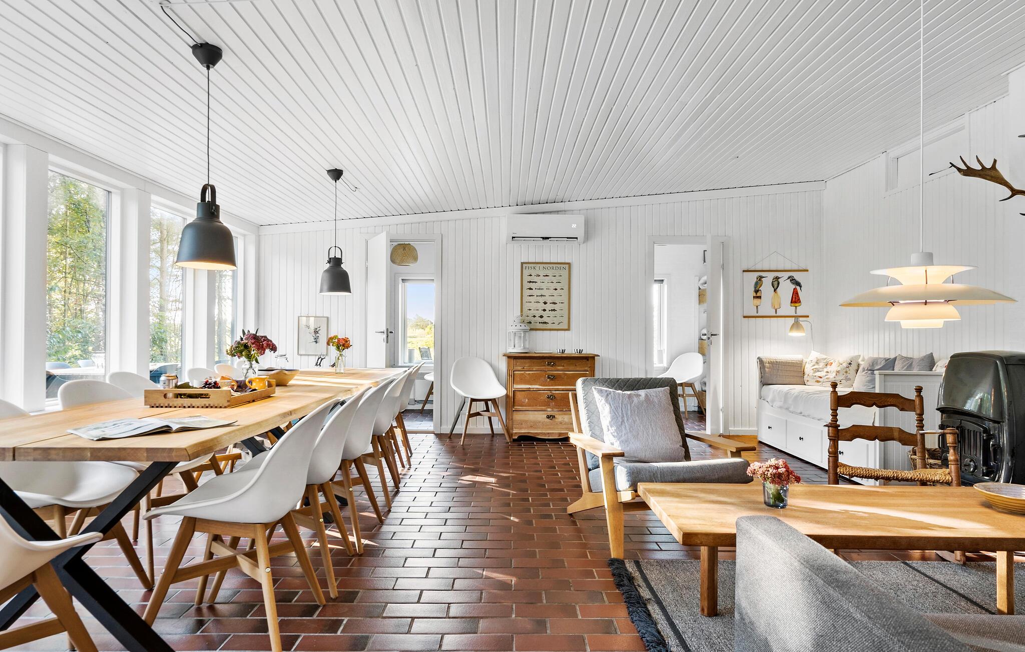 Inmitten von Ruhe, Frieden und Idylle erwartet Sie dieses herrliche, solide Ferienhaus als perfekte Basis für Ihren Urlaub. Das Innere des Hauses bietet Ihnen eine warme, offene und einladende Atmosphäre mit hellen Holzvertäfelungen und schönen Fliesenböden. Genießen Sie gemeinsame Stunden am Esstisch, während Sie den Blick in den Garten schweifen lassen und das Knistern des Kamins eine wohlige Stimmung schafft.