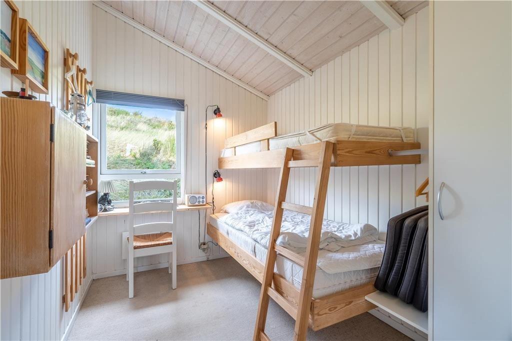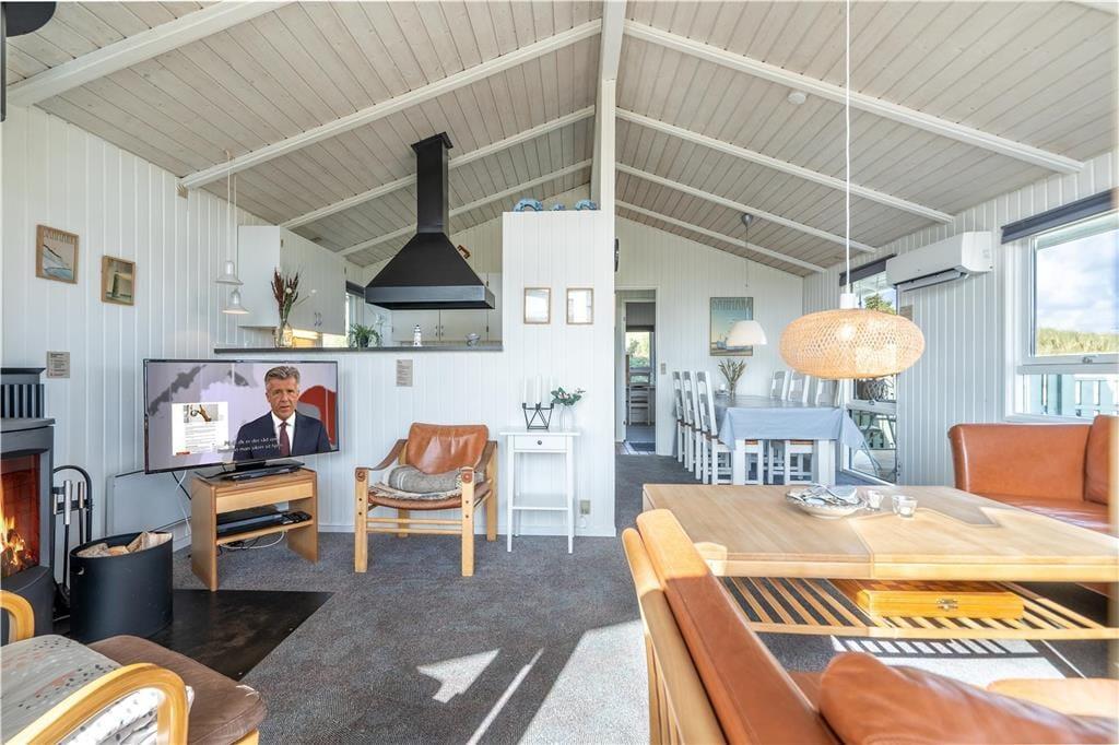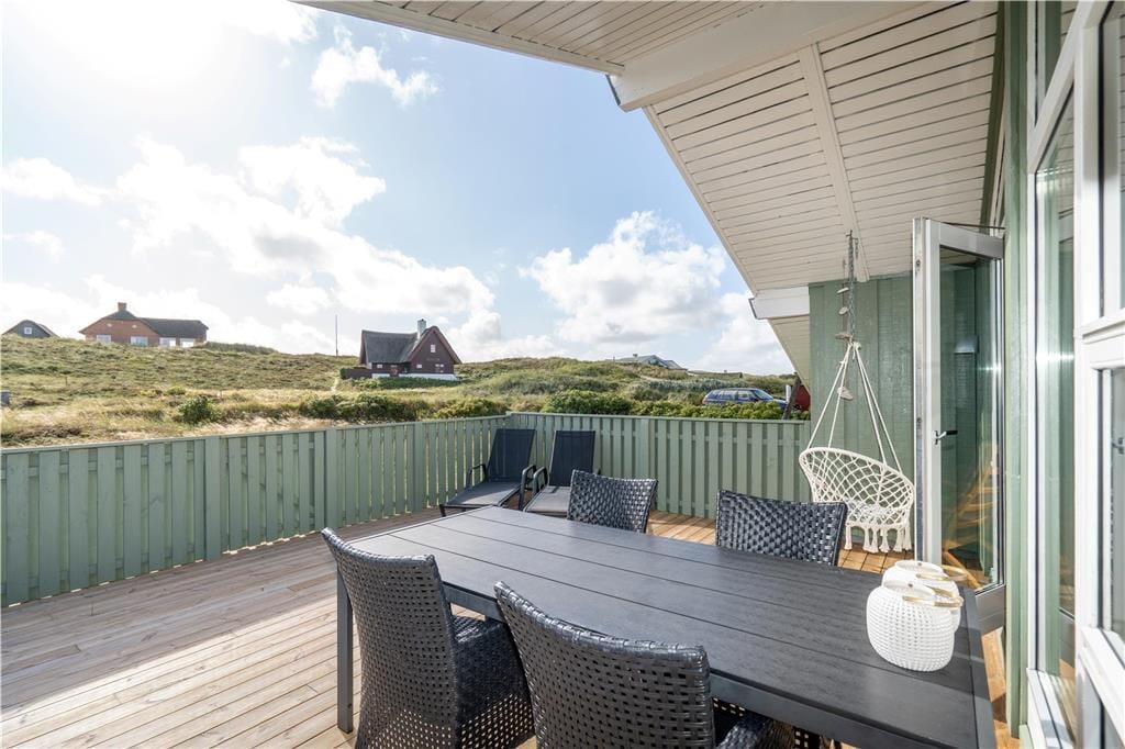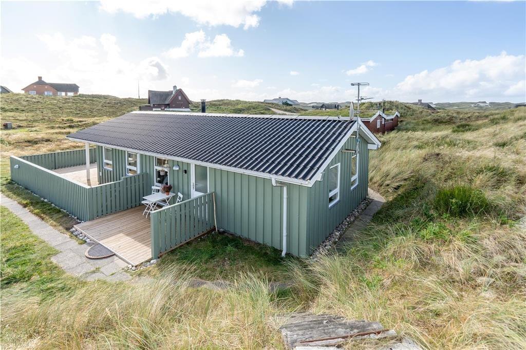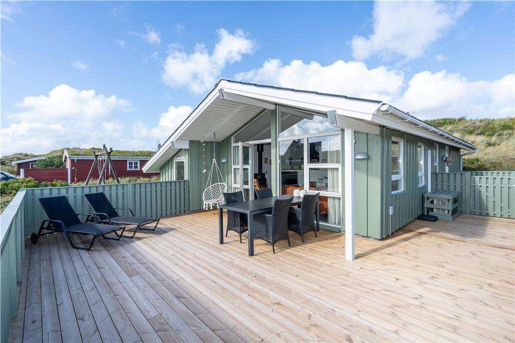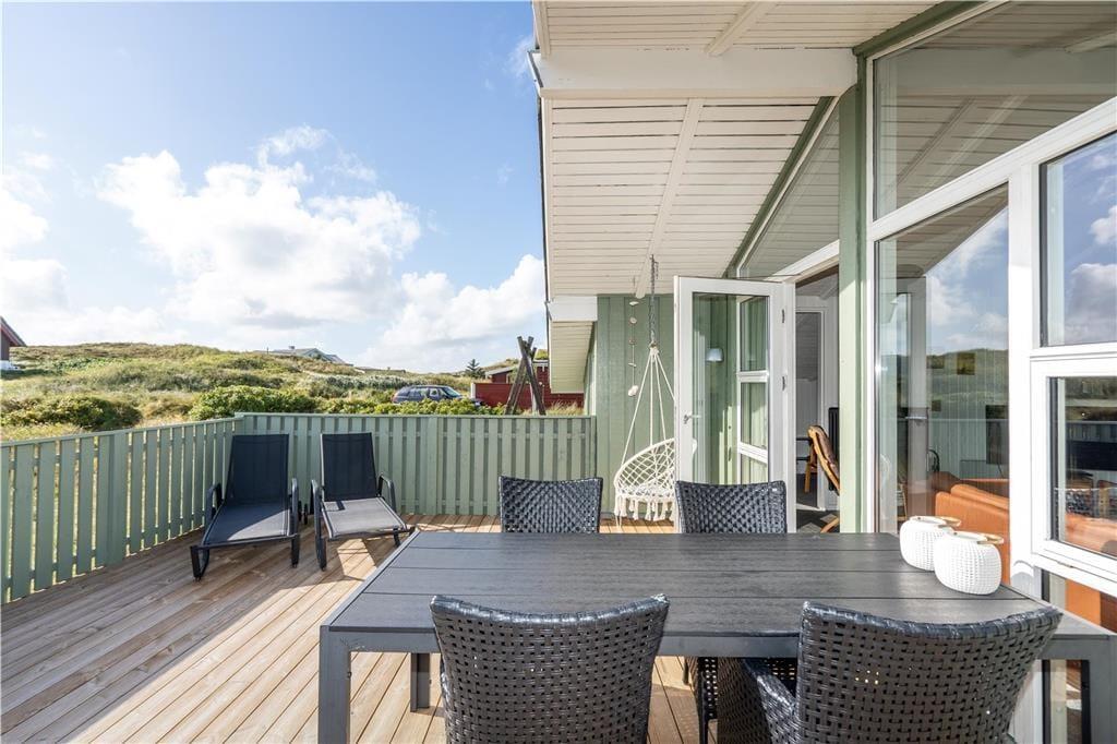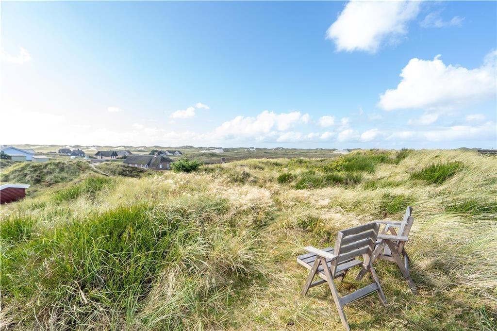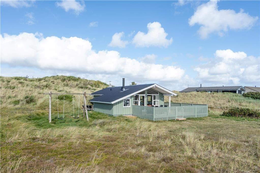 Gen Süden, Osten und Westen schmiegen sich gemütliche Terrassen an das Mietobjekt. Im Laufe des Tages werden Sie daher stets ein sonniges Plätzchen unter freiem Himmel finden. Sonnenliegen und ein Grill laden zu entspannten und geselligen Momenten ein. Eine Düne bietet dem Haus guten Windschutz. Oben auf der Düne offenbart sich Ihnen ein reizvoller Ausblick über die mit Heide bedeckte Dünenlandschaft und das Wasser des Fjords. Für die jüngsten Urlauber stehen auf dem Naturgrundstück eine Schaukel und eine Sandkiste bereit. Parkplätze für mehrere Pkw sind vorhanden.