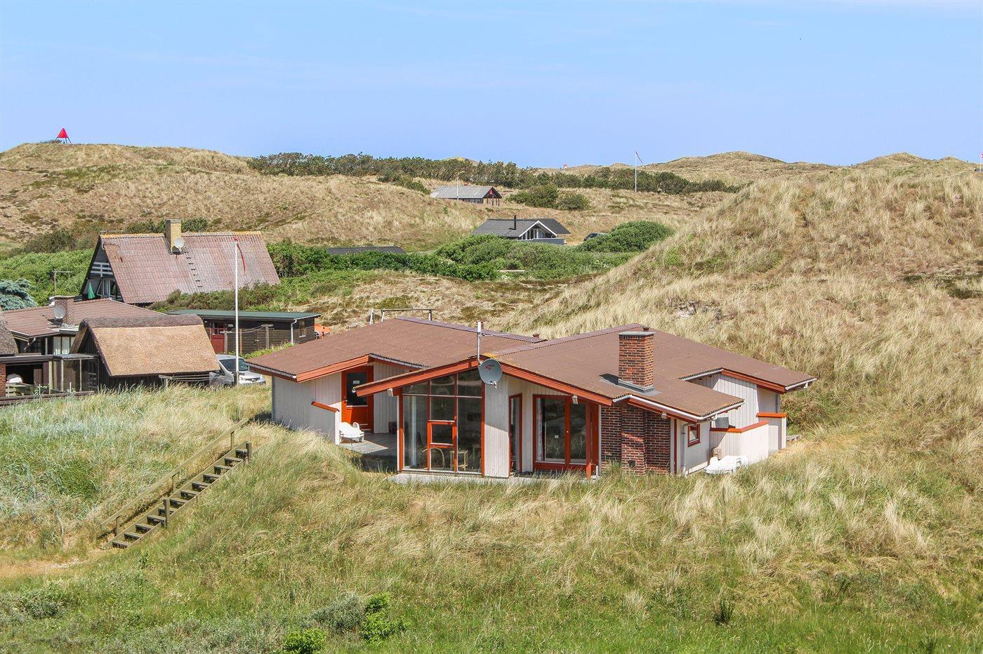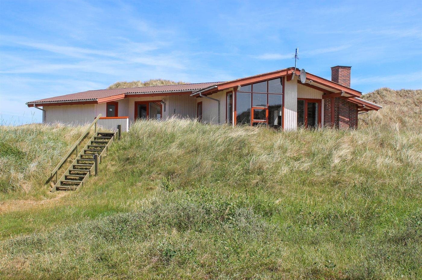 Ein schönes Ferienhaus mit toller Lage auf einem sehr großen und hügeligen Grundstück erwartet dich hier. Von der höchsten Stelle des Grundstücks hast du einen fantastischen Blick über das Dünengebiet, das Meer und den Fjord. Zum Haus führen ein paar Treppenstufen hinauf.