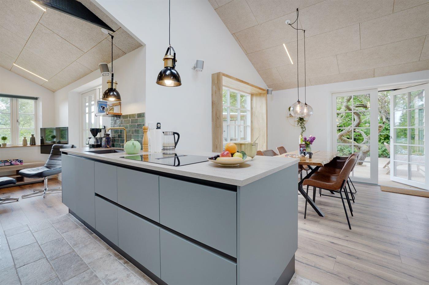 Die Küche ist mit Kühlschrank ausgestattet. Außerdem gibt es 4 Induktions-Kochzonen, Umluftofen, Airfryer sowie Geschirrspüler.