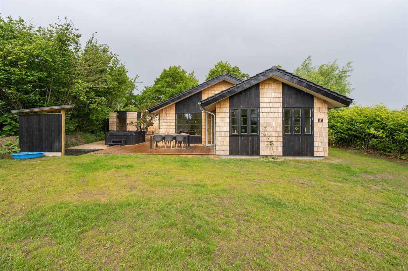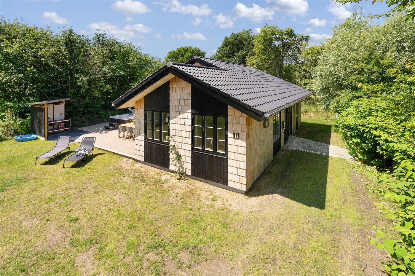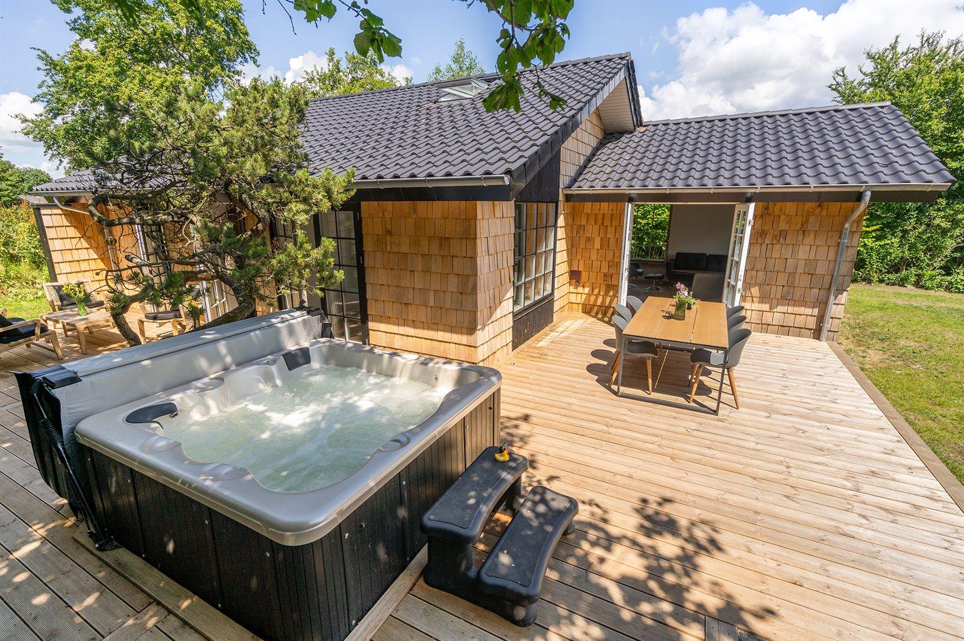 In dem gemütlichen Feriengebiet Skovmose und nahe am guten Badestrand liegt dieses besonders schöne und neu erbaute Ferienhaus. Zum Haus gehört eine Terrasse mit u. a. 6-Pers.-Außenwhirlpool, der das ganze Jahr hindurch benutzt werden kann. Das Haus ist behindertengerecht mit einem wandmontierten Duschstuhl in der Dusche, einem Badehocker am Waschbecken, viel Platz an den Eingangstüren und einer Terrasse mit Zugang über Rampen vom Garten aus.