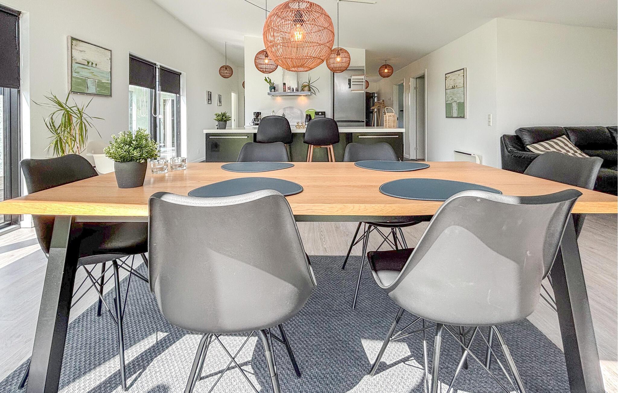 Dieses stilvoll eingerichtete Domizil heißt Sie in einer schönen Lage in der attraktiven Ferienhaussiedlung von Skovmose willkommen. Große Fensterfronten sorgen für viel natürliches Tageslicht und geben den Blick in den grünen Garten frei. Freuen Sie sich auf geselliges Kochen in der modernen Küche und harmonische Mahlzeiten am Kaminofen. Gönnen Sie sich nach langen Spaziergängen an der frischen Luft wohlige Momente in der Sauna oder im Whirlpool und machen Sie es sich für gemeinsame Filmabende auf dem Sofa gemütlich.