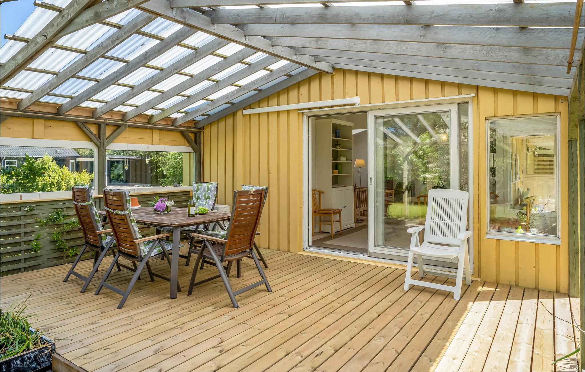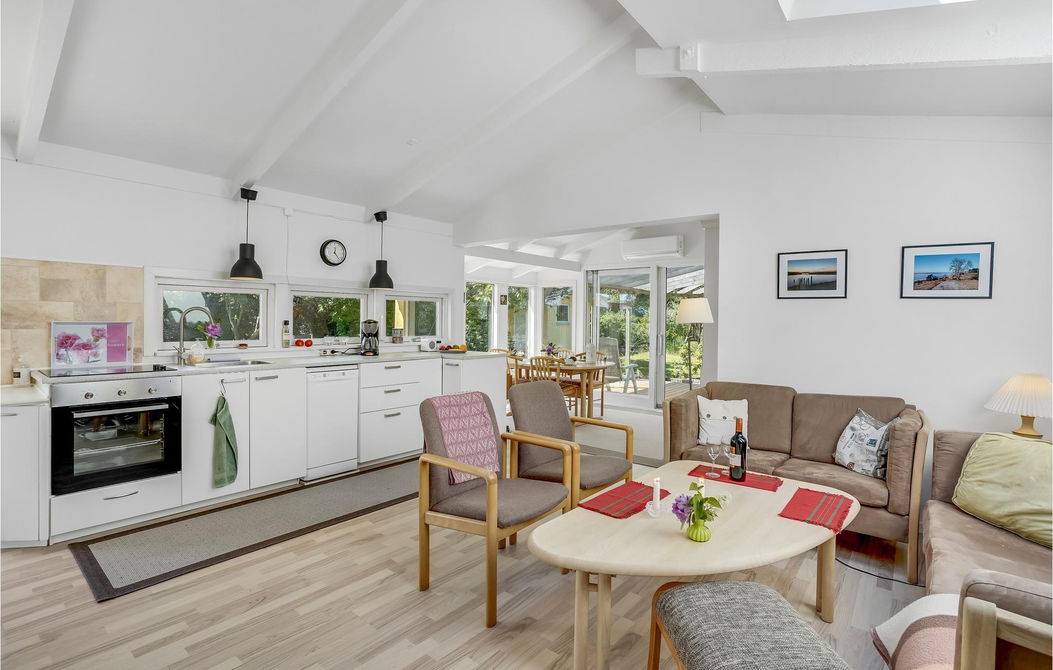 Willkommen in diesem einladenden Cottage, in dem die Dachfenster und die gedämpften Farbtöne für ein schönes natürliches Licht sorgen. Am Esstisch, von dem aus Sie durch die großen Fenster einen herrlichen Blick ins Grüne haben, können Sie zusammensitzen und Ferienmahlzeiten genießen oder Brettspiele spielen. Machen Sie es sich gemeinsam in der gemütlichen Sitzecke bequem und heizen Sie abends den Holzofen an, wo ein knisterndes Feuer für eine behagliche Atmosphäre sorgt. Genießen Sie Ihren Morgenkaffee auf der Terrasse, während Sie die Aktivitäten des Tages planen. Später können Sie die lauen Sommerabende auf der überdachten Terrasse bei einem leckeren Grillabend ausklingen lassen. Das Nebengebäude bietet zusätzlichen Platz und Privatsphäre, und hier finden Sie eine weitere schöne Terrasse.
