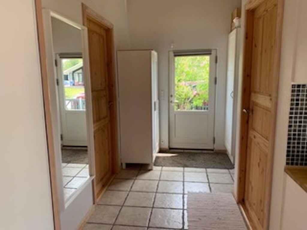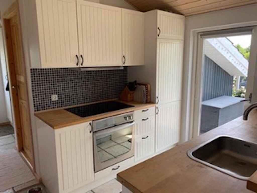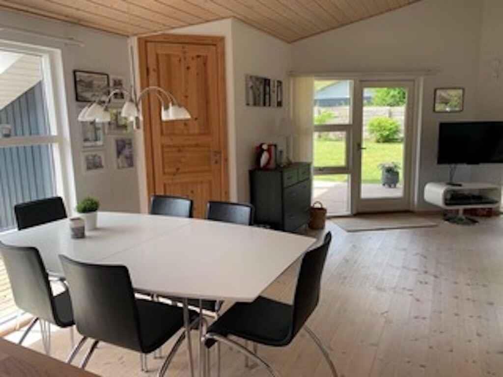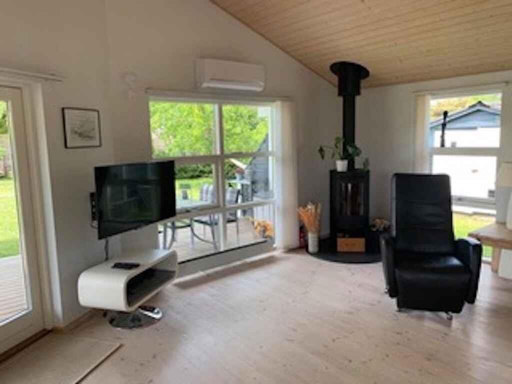 Schönes Ferienhaus, geschlossener Garten, ganzjährig nutzbar, Internet, 400 Meter bis zum Wasser, Kaminofen, Wärmepumpe, Zugang von der Küche zu einer geschützten Terrasse.