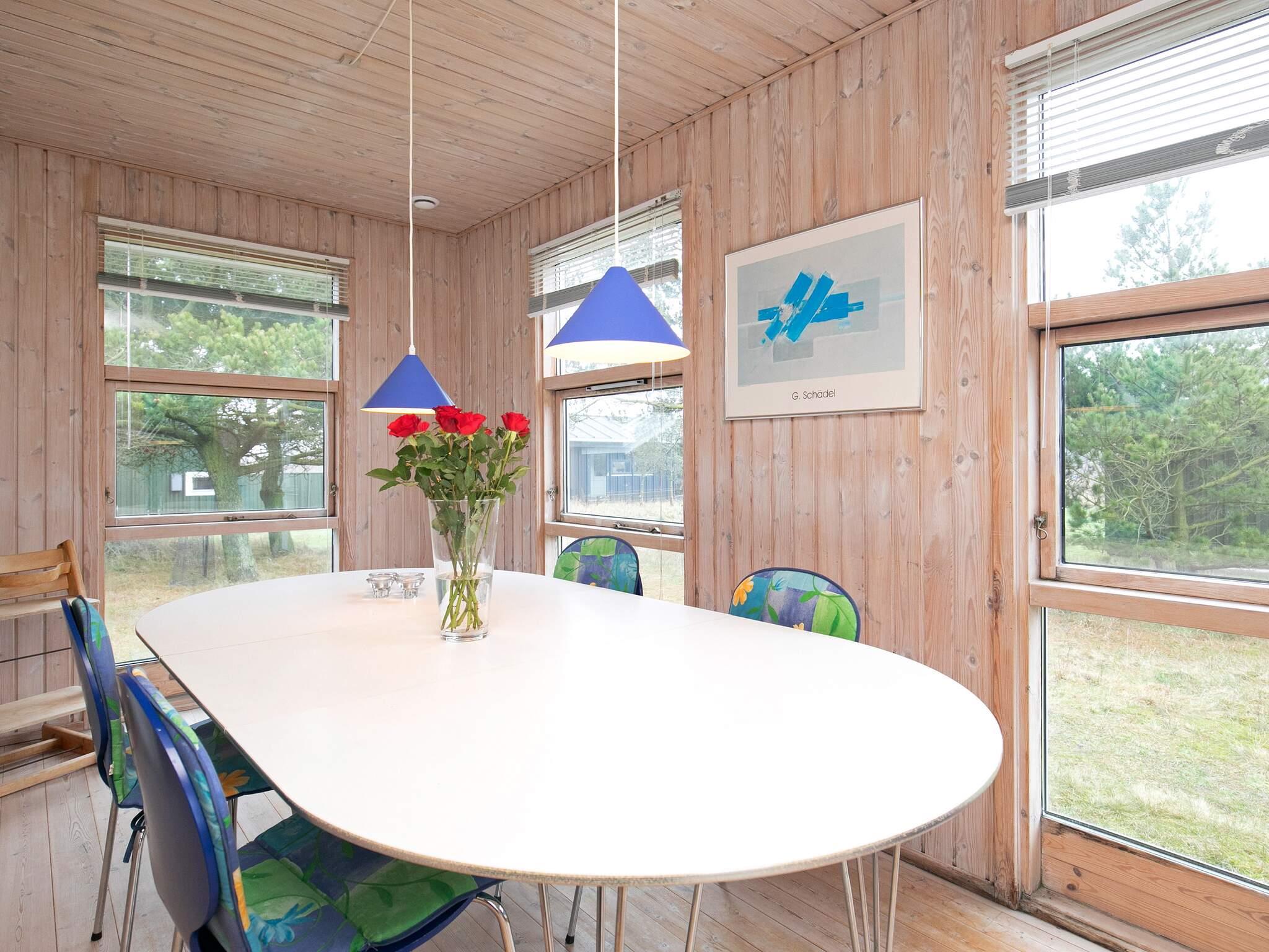 Auf dem gut 1.200 m2 großen Naturgrundstück mit Bäumen und Rasenfläche gibt es viel Platz für spielende Kinder und eine Schaukel für die Kleinen. Es stehen zwei Terrassenflächen zur Verfügung. Das Haus ligt in einem ruhigen Ferienhausgebiet bei Slettestrand, nicht weit von der Nordsee.