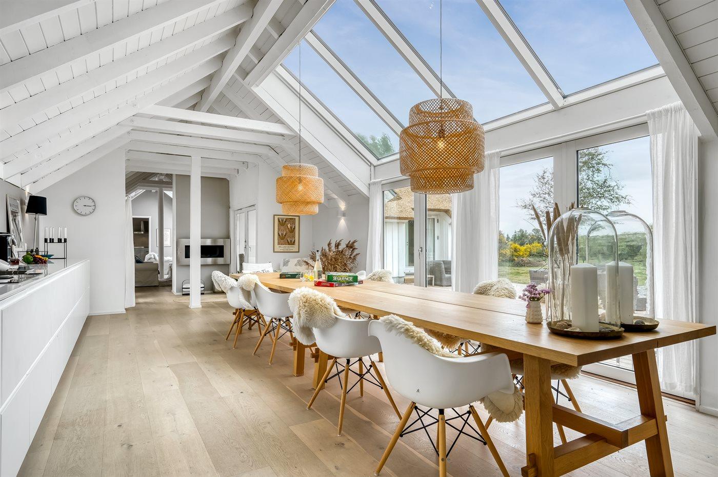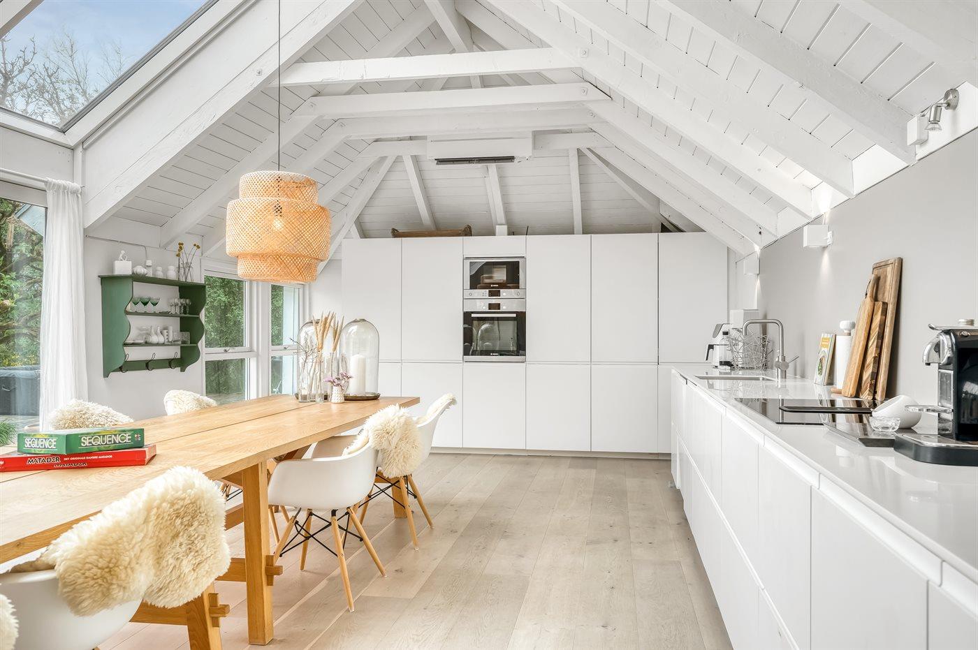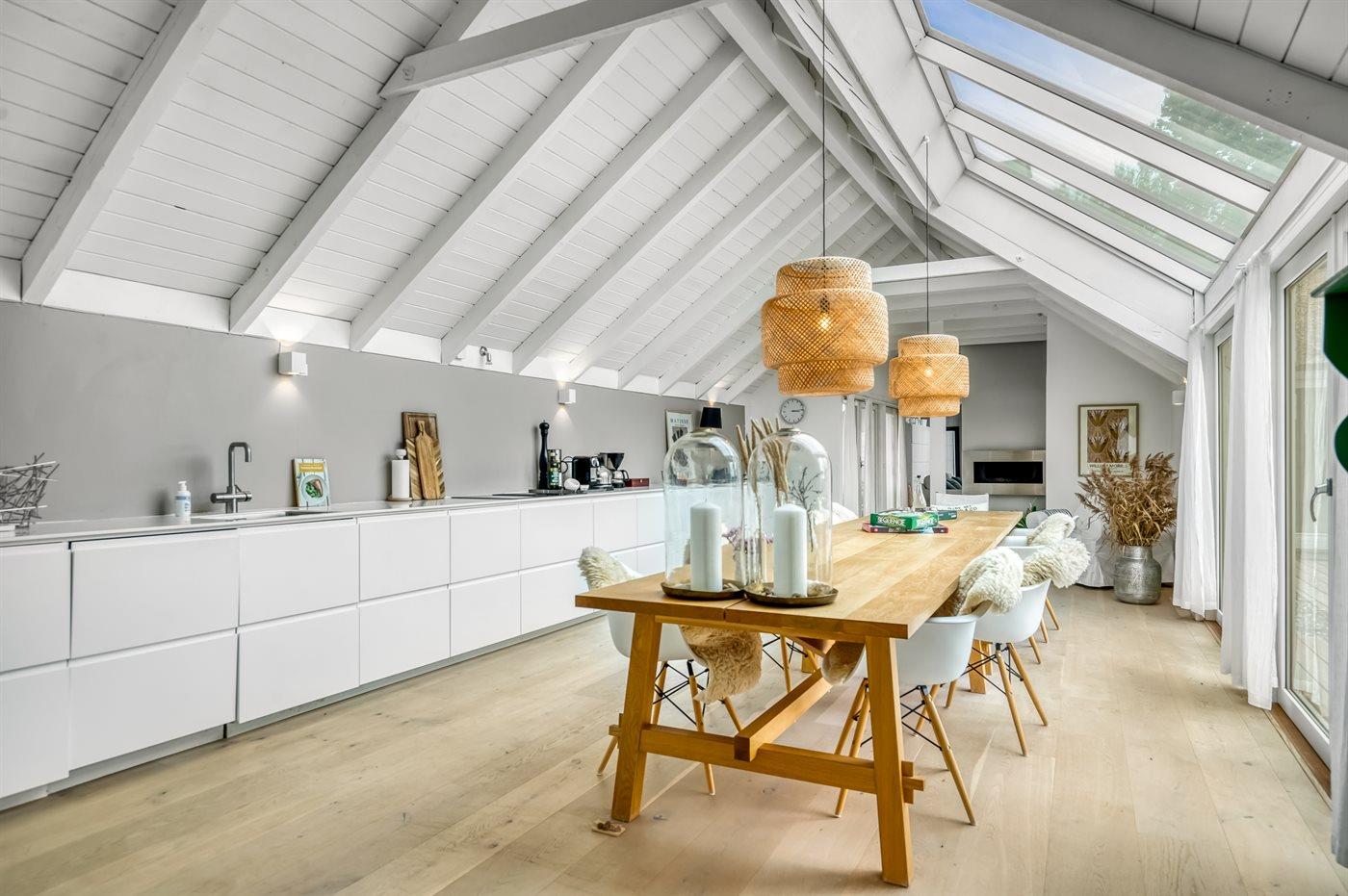 Das Haus ist unter anderem mit einer großen Wohnküche eingerichtet, wo genügend Platz zum Kochen und für gemütliche Spieleabende rund um den Esstisch vorhanden ist. Eine große Fensterfront, die sich fast bis zum Dachfirst erstreckt, sorgt für einen guten Lichteinfall.