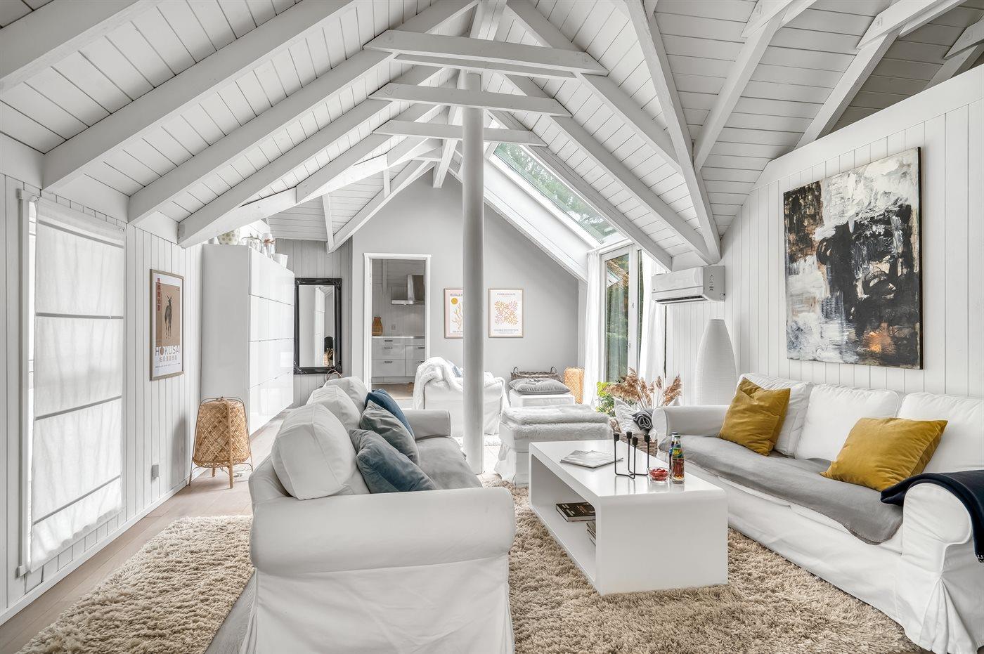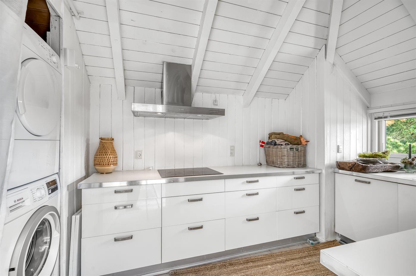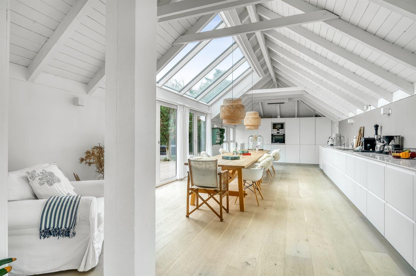 Das Haus ist unter anderem mit einer großen Wohnküche eingerichtet, wo genügend Platz zum Kochen und für gemütliche Spieleabende rund um den Esstisch vorhanden ist. Eine große Fensterfront, die sich fast bis zum Dachfirst erstreckt, sorgt für einen guten Lichteinfall.