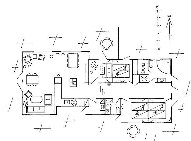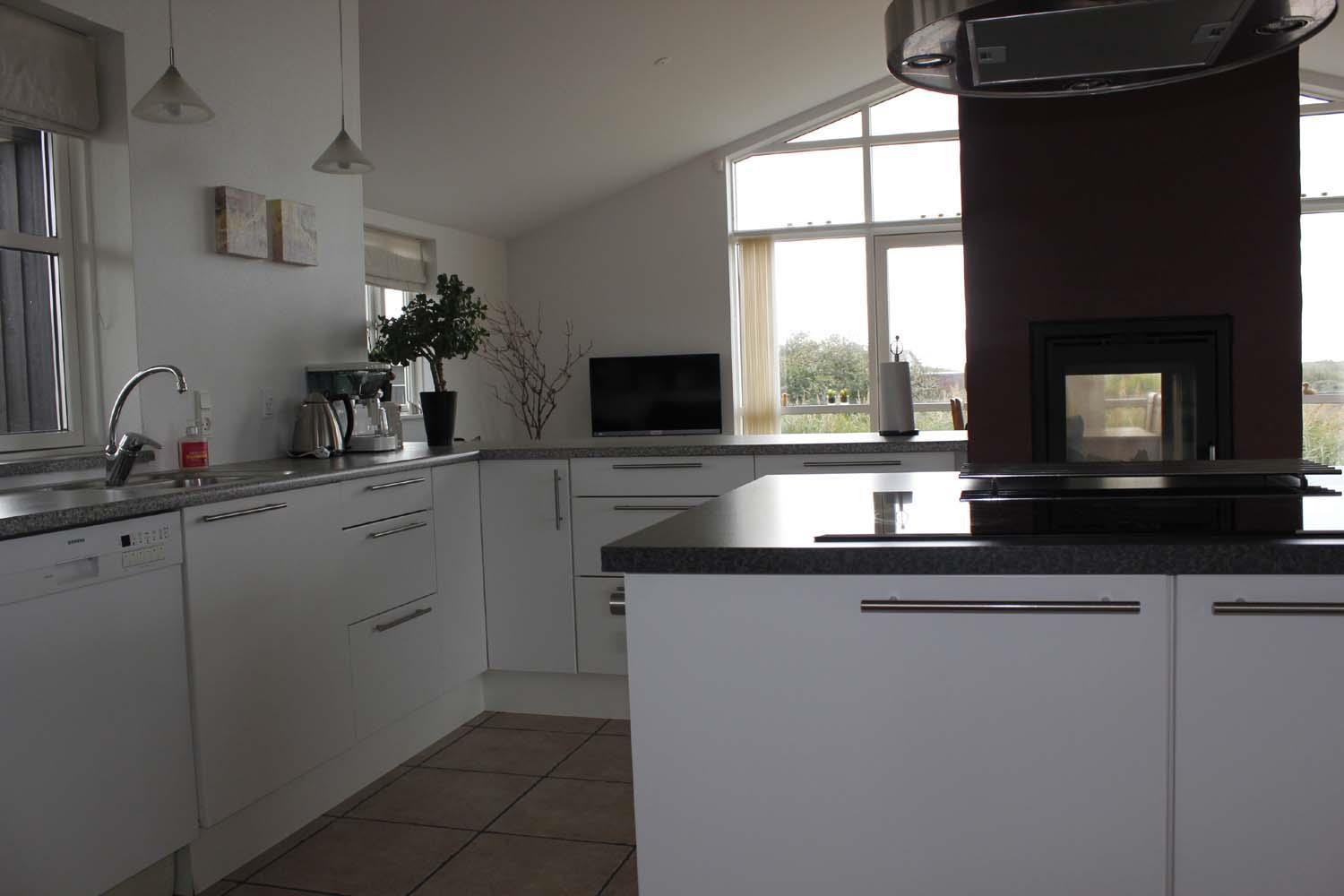Das Haus ist schön gross, so dass die ganze Familie genügend Platz findet, um zu entspannen. Wenn man das Haus betritt, kommt man zuerst in den Eingangsbereich, in dem sich eine Waschmaschine und ein Wäschetrockner befinden. Geht man weiter, trifft man auf einen grossen und hellen Küchen - und Wohnraum, der in der Höhe bis unter das Dach reicht. In der Küche ist Platz für viele "Köche", die sich in der Mitte um die Kochinsel herum versammeln können. Diese Küche hier hat wirklich alles, was eine Küche haben sollte, und sie verfügt über mehrere grosse Fenster, so dass man sich an der Natur draussen freuen kann, während man drinnen am Esstisch oder in einem der weicheren Möbel sitzt. Der Kern des Wohnbereichs ist der grosse Kaminofen, der von beiden Seiten geöffnet werden kann. Dieser Raum bietet vielen Menschen Platz, ohne dass man sich beengt fühlt. Das Haus hat zwei Badezimmer, von denen das eine zusätzlich mit einem Whirlpool und einer Sauna ausgestattet ist. Darüber hinaus hat es 3 Schlafzimmer, die alle mit Doppelbetten eingerichtet sind.