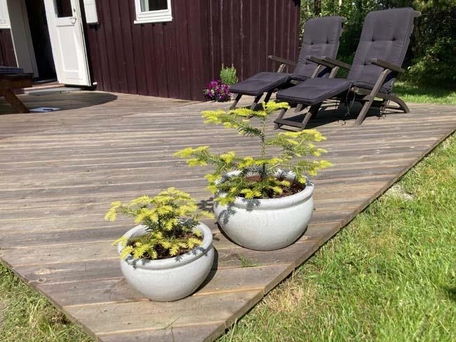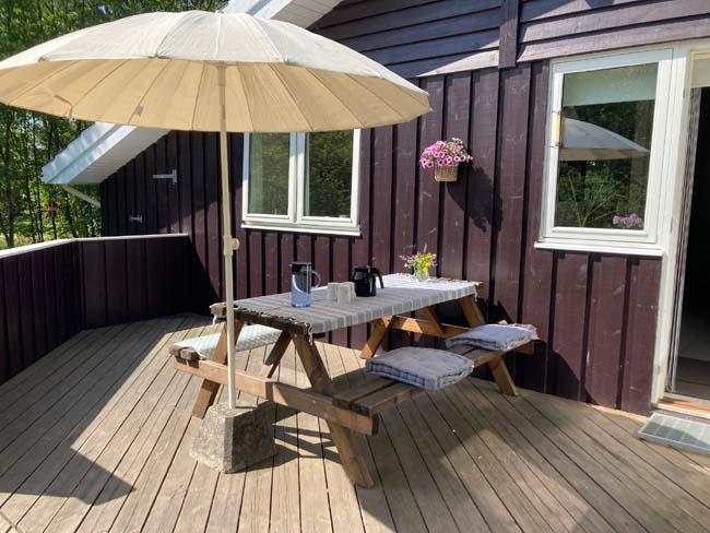 The house is placed on a little sweet ground surrounded by trees. Here you can at the grass or at one of the two terraces enjoy bird songs and sunshine, on a warm summer day. The first terrace is in connection with the front door and the other terrace is on the opposite side of the house, also with a door into the house.