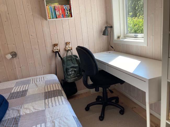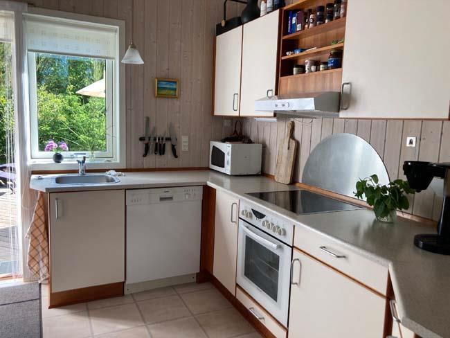 The centre of the house is an open-plan kitchen and living room, where you step into the kitchen from the front door. This kitchen has everything a holiday cottage kitchen needs. Further in this room there is a large dining table and a smart leather sofa set with a big coffee table, where the whole family can be gathered with a game of cards or enjoy a cup of cacao and watch a good family movie at the TV. In the open-plan kitchen and living room there also is a wood burner for the cold summer nights or to get the warm back in the body after a cold swim in the ocean.