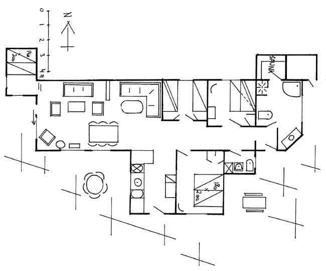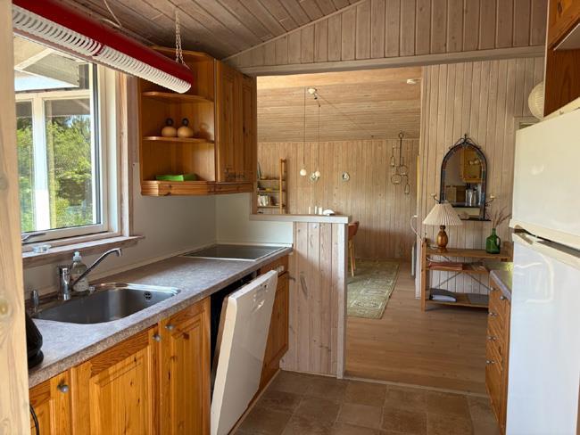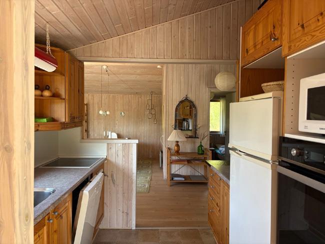 The holiday cottage itself is lovely big with many sleeping places and the roomy living room. There are three bedrooms, where one of them has a double bed, the other has a double bed and an over bunk, and third has a single bed and a bunkbed. Furthermore the house also has an alcove, which can be used for extra sleeping spaces, as cosy corner for the reader or as a play corner for the youngest. The house has two bathrooms with toilet and shower. The biggest has spa bath and sauna.