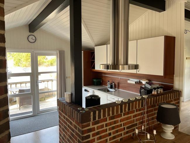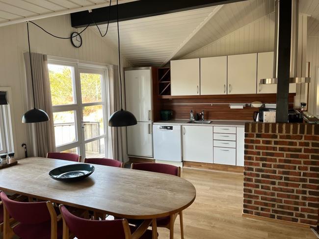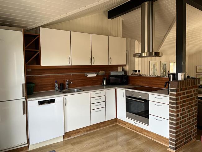 The rest of the house is deigned quiet unique, because you have to take two steps up, to get to the large kitchen. This kitchen is really nice and has good table space, so the family can be together preparing the dinners. In this kitchen there is a little round table that you can sit enjoy your meal at, if you only are a few people for dinner. From the kitchen you can over the dwarf wall look down to the living room and see through the glass doors to the large living room.