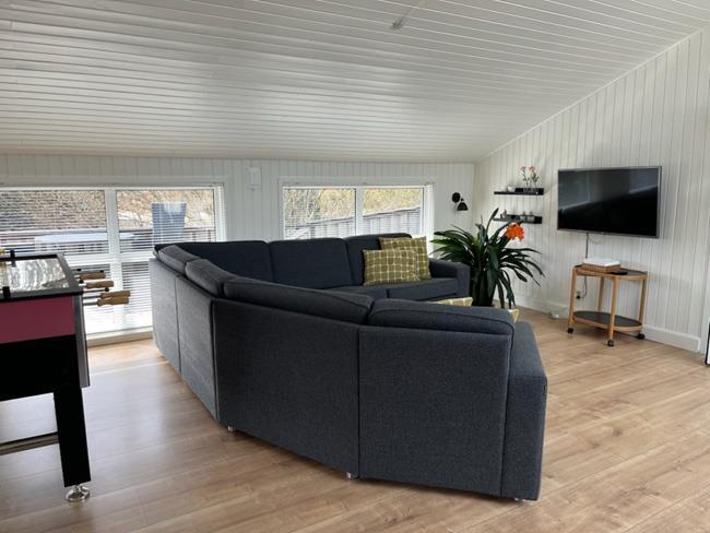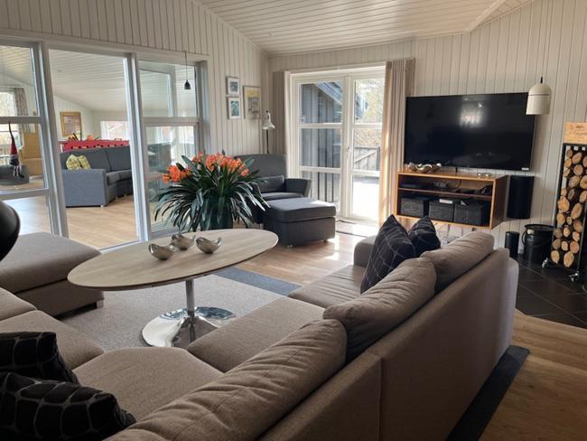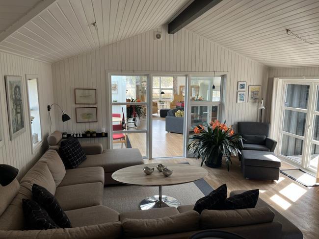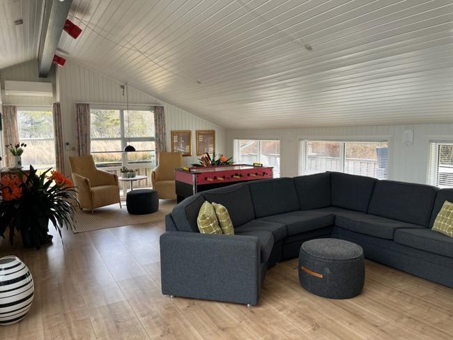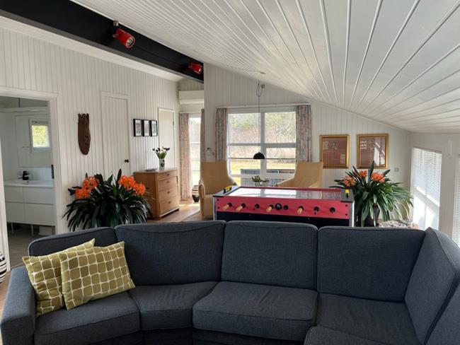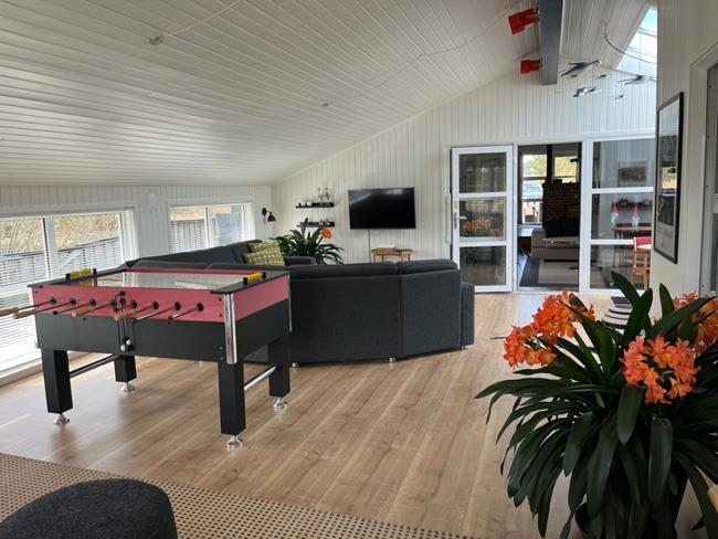 The living room you step down to from the kitchen has a soft corner sofa, where the family can get together watching TV, play a game of cards or just having fun talking with each other, while enjoying the warm from the wood burner. If you want more space or have invited extra guests, you just simply open the doors into the large living room. Here you also have a corner sofa and a TV, where the family and friends can be together. Furthermore, there is a large dining table also with plenty of space. Here you can have a party, because there are room for dancing or the children to play all over the room. For the children and childish adults there is a table football game, which probably will creates some competitions between the family members or friends.