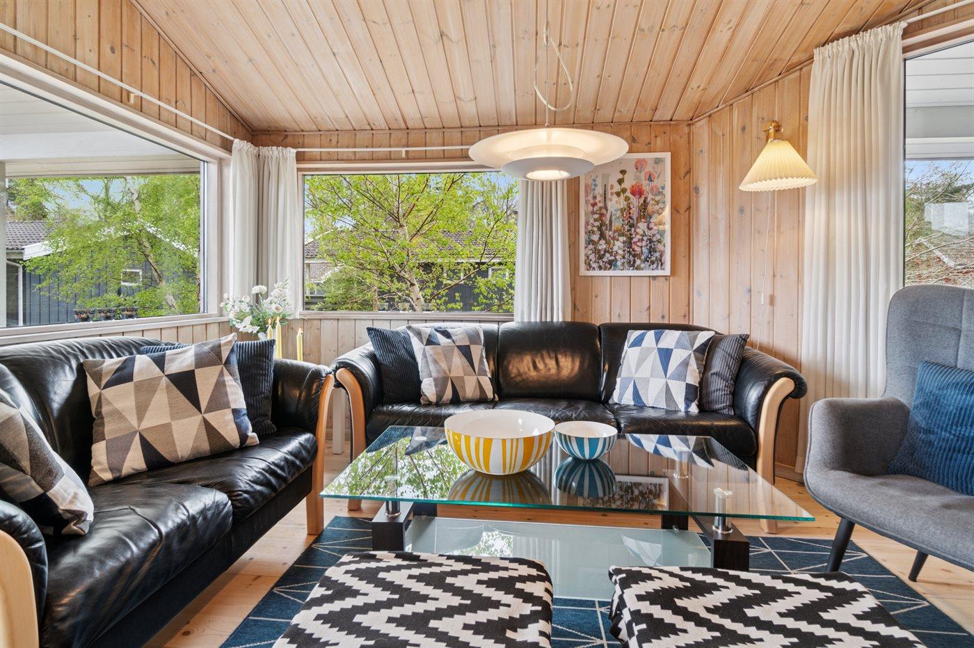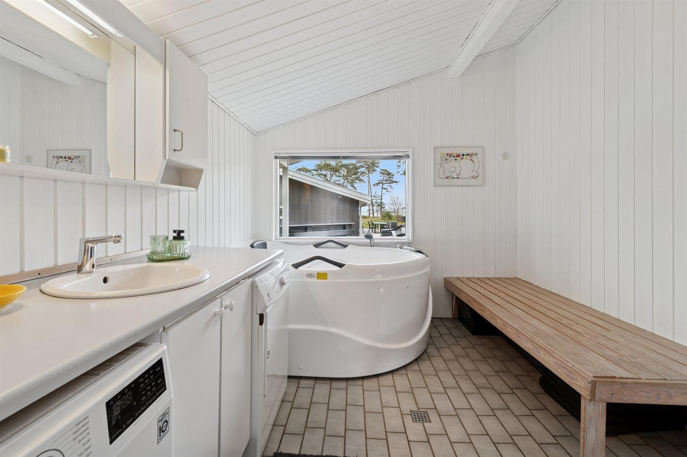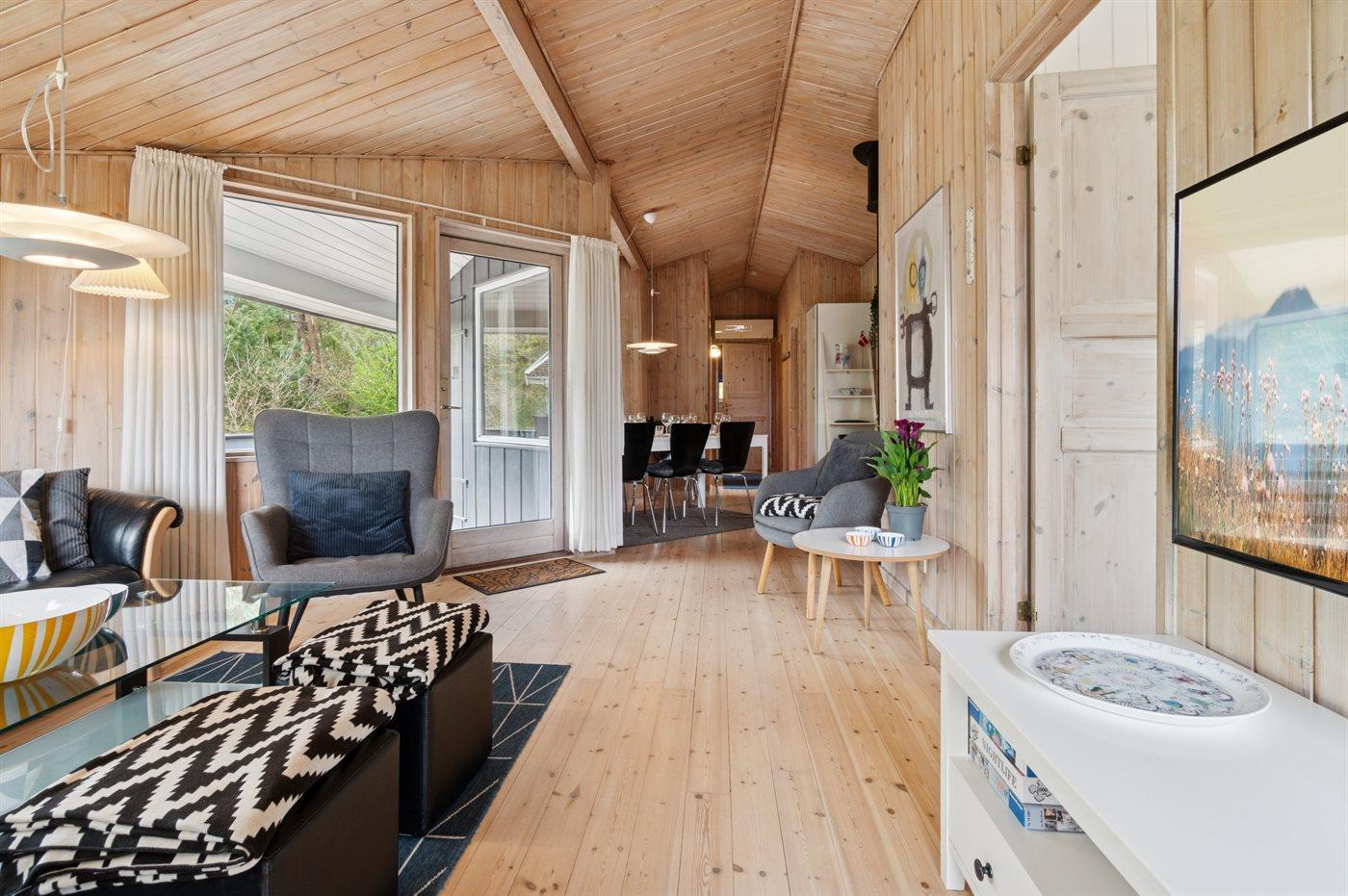 Die Einrichtung entspricht der der anderen Ferienhäuser in der Strandbo-Siedlung – mit Platz für 8 Personen. Wohn- und Essbereich sind mit der offenen Küche kombiniert, die alles bietet, was du brauchst, um für die ganze Familie zu kochen. Im großen Badezimmer findest du sowohl eine Sauna als auch einen Whirlpool.