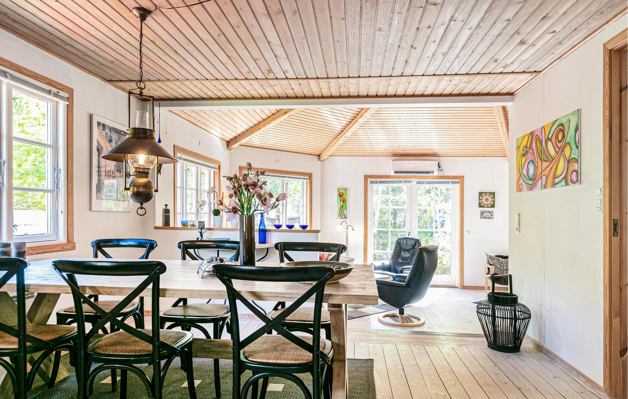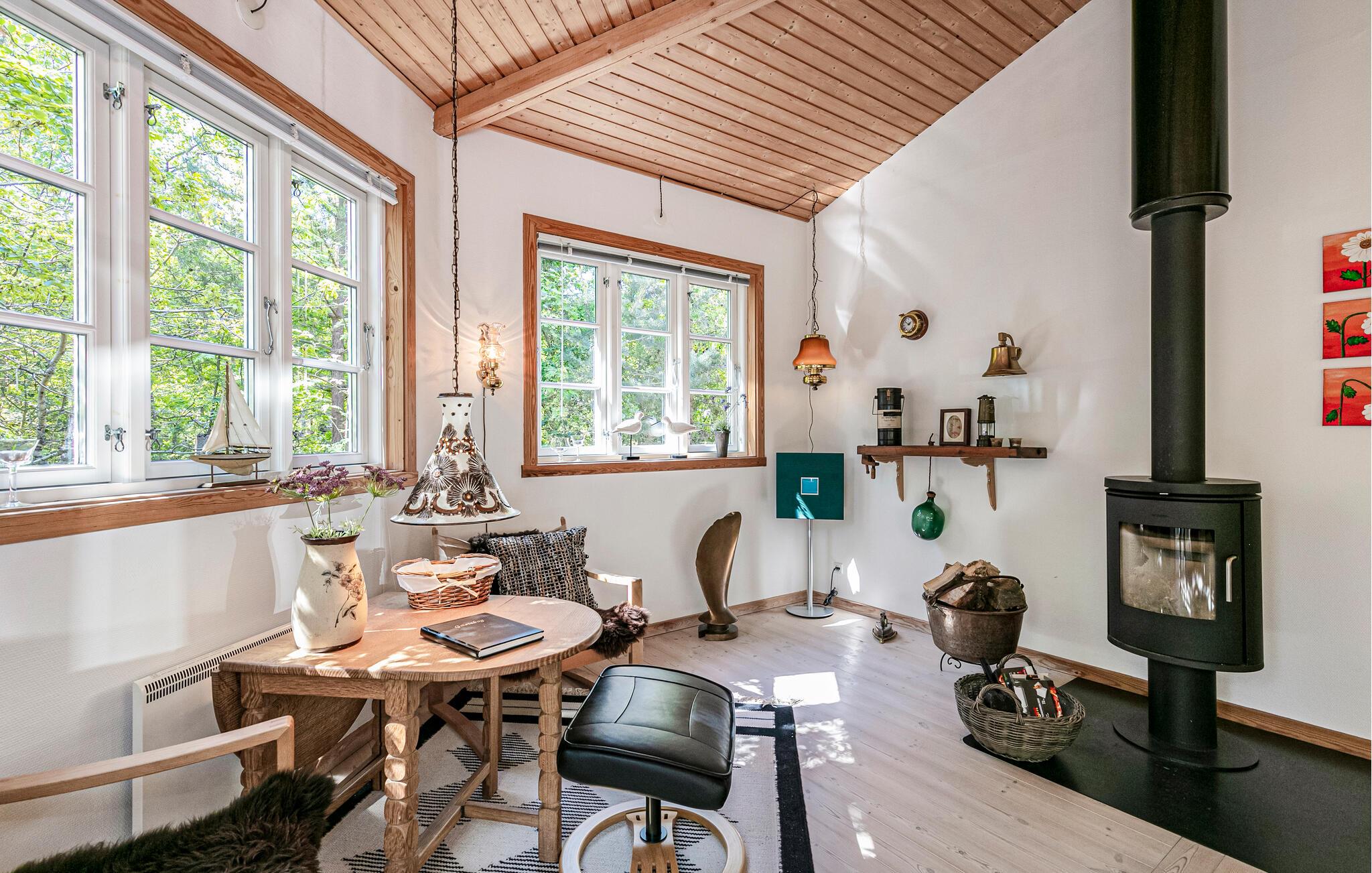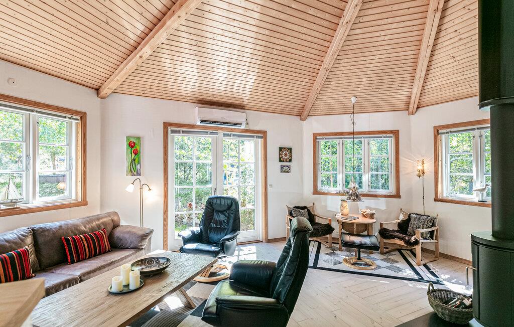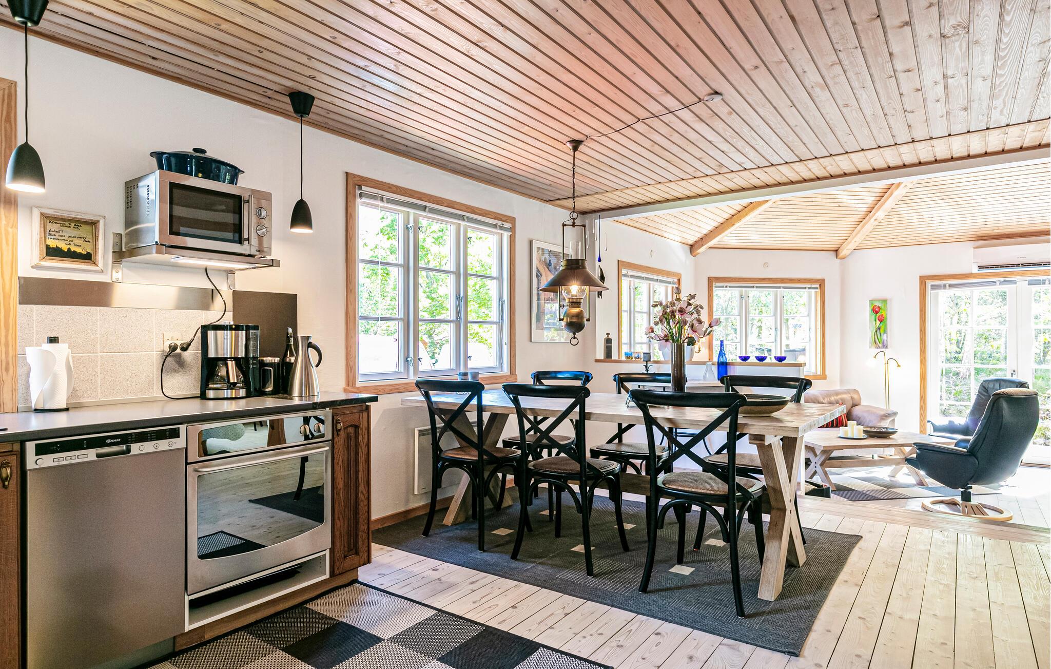Umgeben von Bäumen und Sträucher heißt Sie dieses schöne Ferienhaus willkommen. Gemeinsam mit Ihren Lieben können Sie diese Oase der Ruhe und die Nähe zur Natur genießen. Im Inneren bieten Ihnen der angenehme Komfort und die behagliche Stimmung die passenden Voraussetzungen für einen entspannten Familienurlaub. Zaubern Sie leckere Mahlzeiten in der Küche oder lassen sich mit einem Buch in den Sesseln beim Holzofen nieder, während Sie Ihren Kindern beim Malen oder Spielen am Esstisch zuschauen.