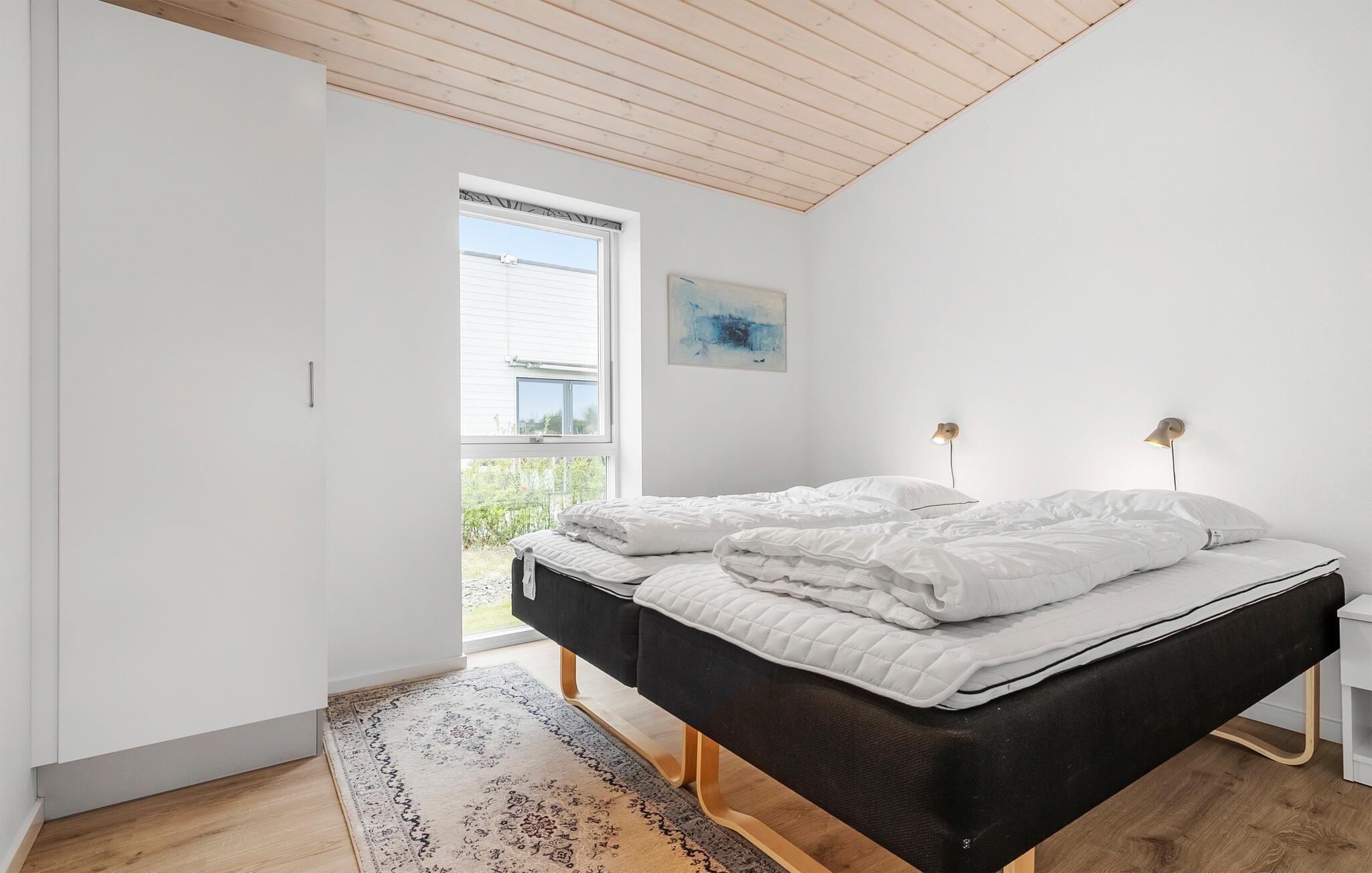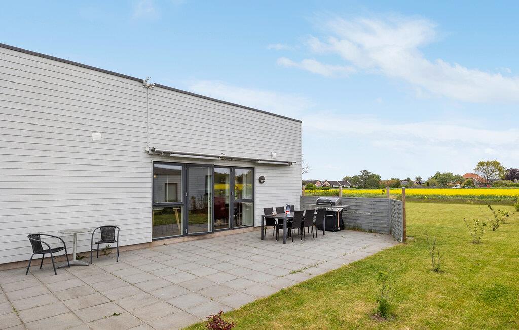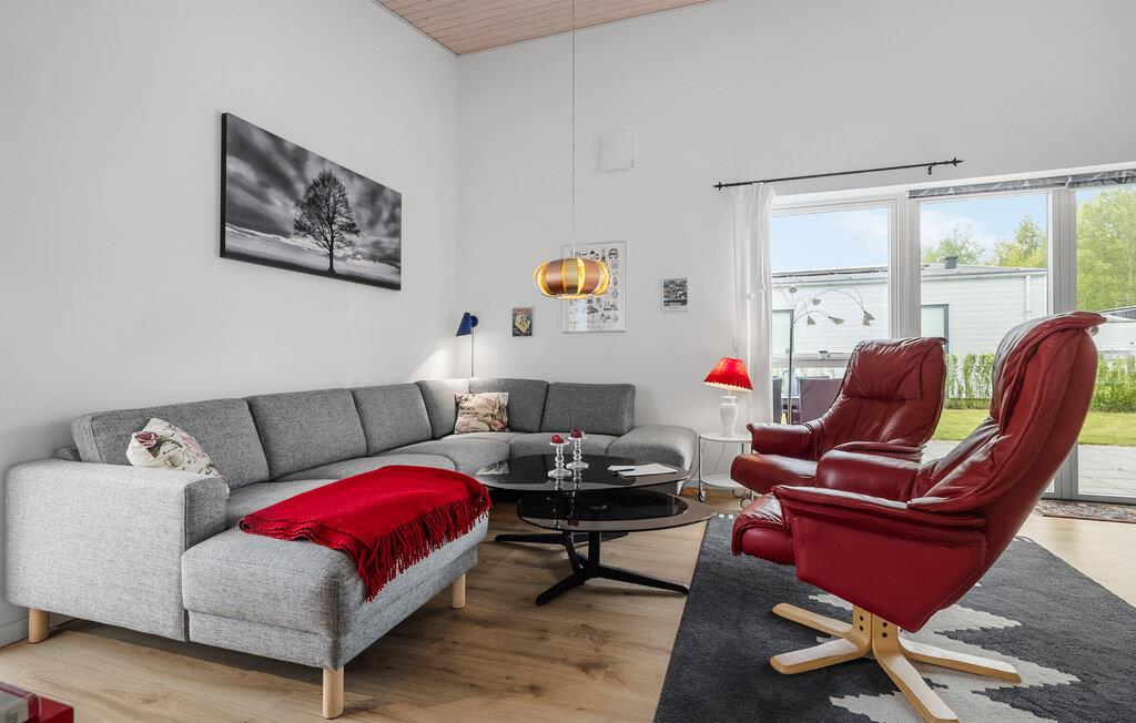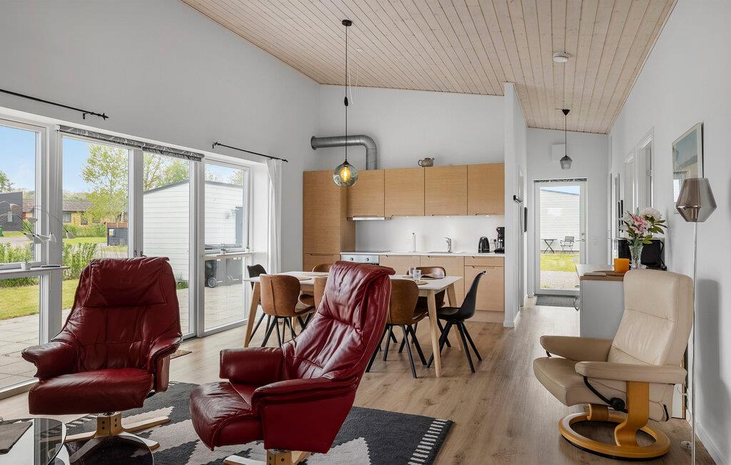 Dieses komfortable Ferienhaus auf Bornholm bietet die ideale Basis für entspannte Ferientage mit der Familie oder Freunden. Freuen Sie sich auf moderne Architektur, helle Räume und eine ruhige Lage nahe Strand und Natur. Treten Sie ein in den schönen Wohnbereich mit hohen Decken und großen Fensterfronten, die viel Licht hereinlassen. Entspannen Sie sich auf dem gemütlichen Ecksofa oder in den bequemen Sesseln. Nehmen Sie gemeinsam am Esstisch Platz und genießen Sie die freundliche Atmosphäre. Durch die Terrassentür gelangen Sie direkt ins Freie,– ideal für das Frühstück in der Morgensonne oder ein Abendessen im Grünen.