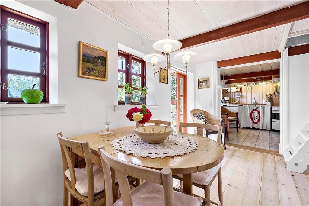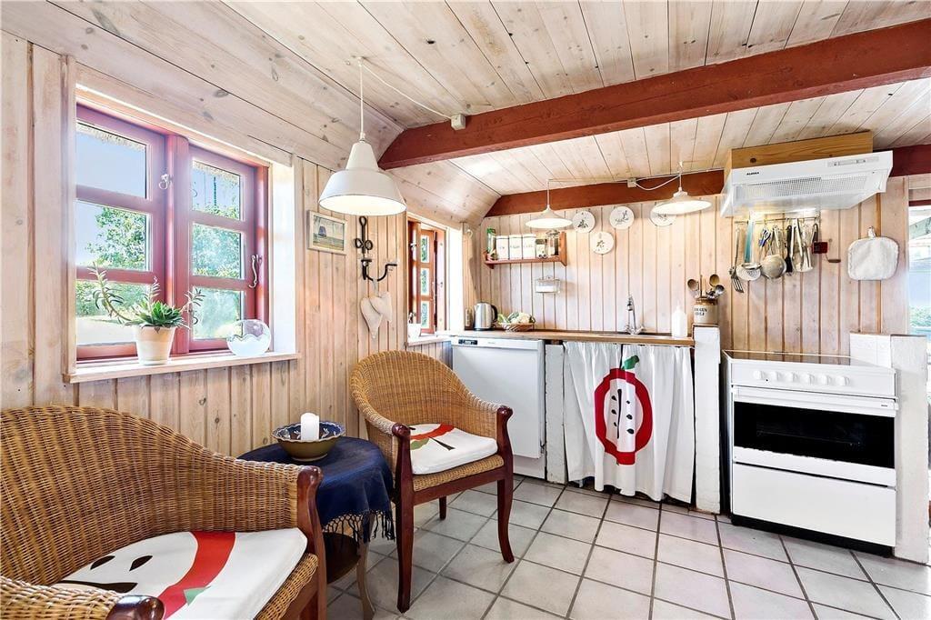 In fantastischer Lage auf Helgenæs, ganz in der Nähe des Leuchtturms Sletterhage Fyr, begrüßt dich dieses idyllische Reetdachhaus mit zwei Etagen. Im Haus spürst du das Flair längst vergangener Tage und fühlst dich vom ersten Moment an heimisch und wohl. Der reizende Wohnraum besticht mit einer entspannten Wohnatmosphäre und großen Fenstern, die einen hübschen Tageslichteinfall gewähren. In diesem Raum wird deine Familie stimmungsvolle, urgemütliche Abende vor dem Kaminofen verbringen und in vergnügter Runde die Mahlzeiten am Esstisch genießen. Die Küche ist voll ausgestattet, sodass du dich bei der Vorbereitung der Mahlzeiten und beim Kochen frei entfalten kannst. Die komfortablen Schlafräume sichern dir und deinen Lieben erholsame Nächte. Bitte beachte, dass die Deckenhöhe dieses Ferienhauses ein wenig niedriger als gewöhnlich ist.