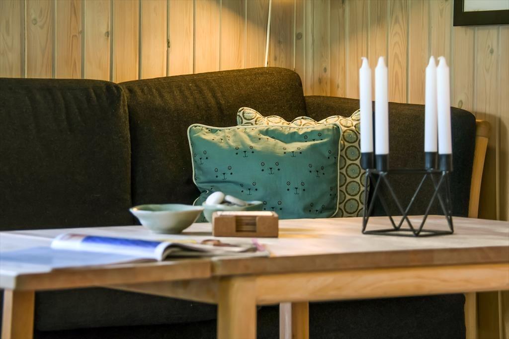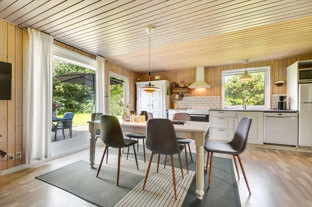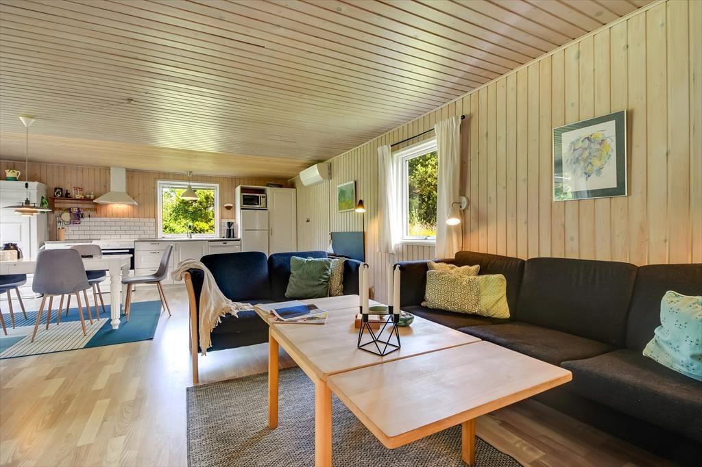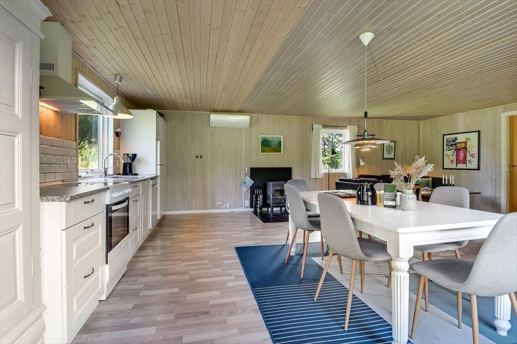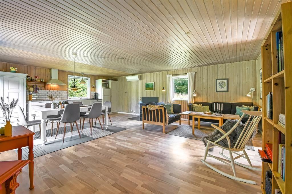 Im Inneren empfängt dich eine schlichte und unkomplizierte Einrichtung, die perfekt zum Ferienleben passt. Das Herz des Ferienhauses ist der großzügige Wohnbereich, in dem Wohnzimmer und Küchenbereich ineinander übergehen und viel Platz für gemeinsames Beisammensein bieten. Hier könnt ihr euch zu langen Mahlzeiten am Esstisch versammeln, Brettspiele auf dem Sofa spielen oder einfach mit einer Tasse Kaffee die Ruhe genießen, während das Tageslicht hereinströmt. Die offene Raumgestaltung macht es leicht, zusammen zu sein – auch wenn einige kochen, während andere entspannen. Die Atmosphäre ist locker, und hier ist Platz für Urlaub, so wie Urlaub nun einmal sein soll. Wenn der Tag sich dem Ende zuneigt, könnt ihr euch zurückziehen und die Stille einkehren lassen – nach einem weiteren Tag voller kleiner Erlebnisse am Fjord und in der westjütländischen Landschaft.
