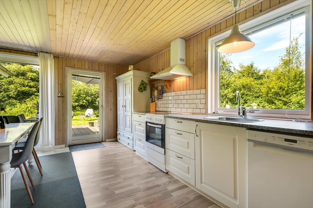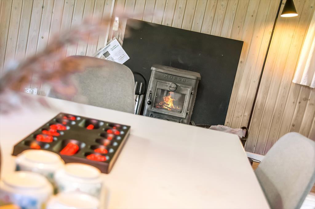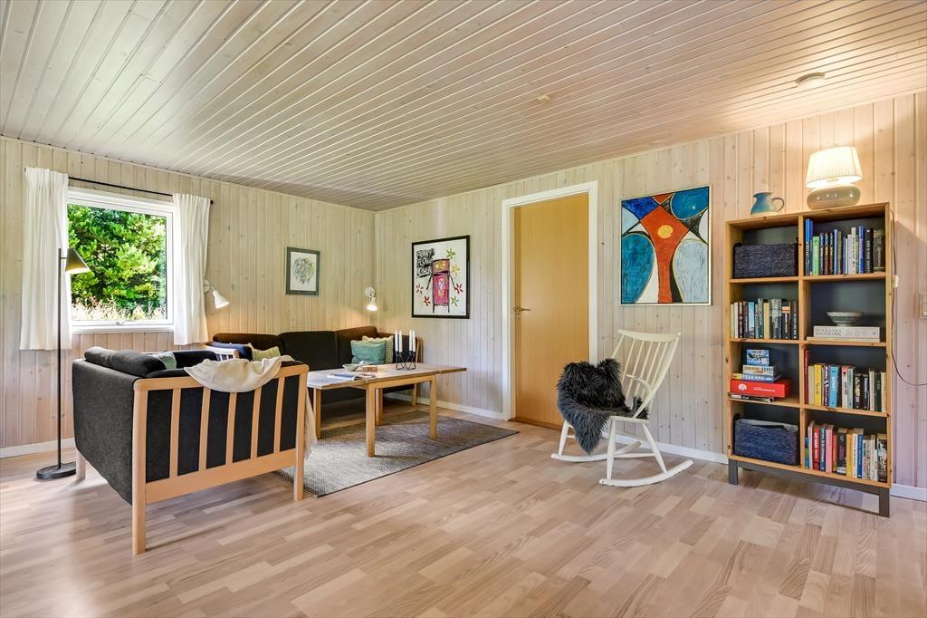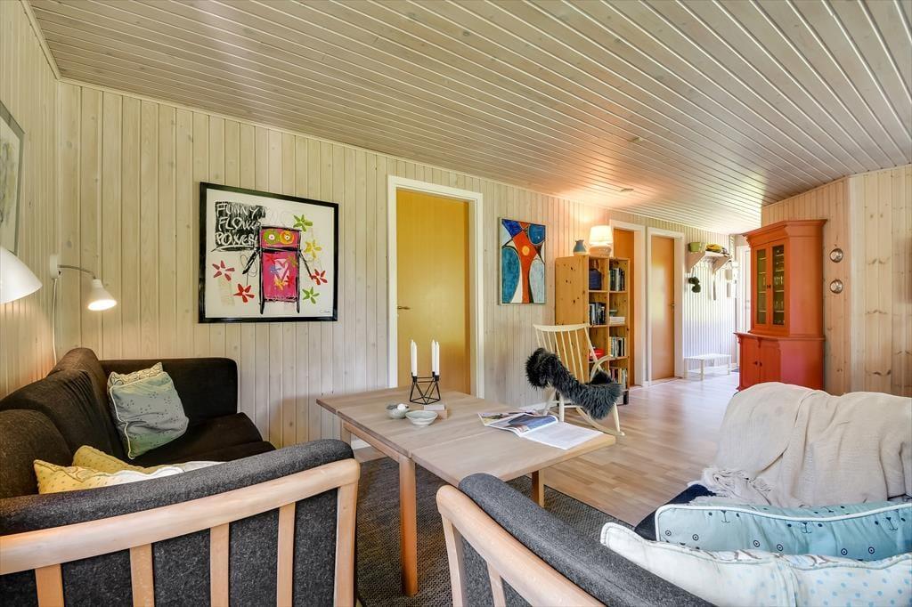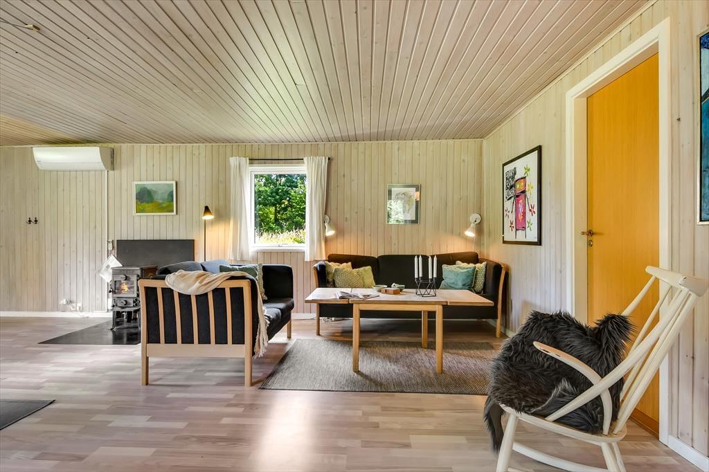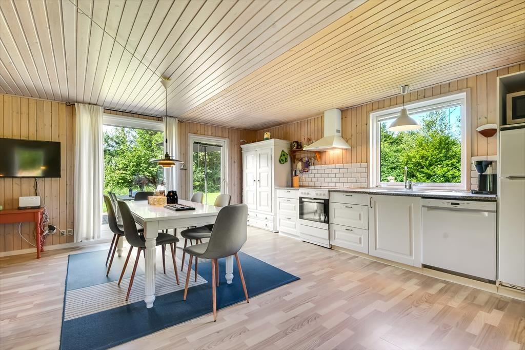 Im Inneren empfängt dich eine schlichte und unkomplizierte Einrichtung, die perfekt zum Ferienleben passt. Das Herz des Ferienhauses ist der großzügige Wohnbereich, in dem Wohnzimmer und Küchenbereich ineinander übergehen und viel Platz für gemeinsames Beisammensein bieten. Hier könnt ihr euch zu langen Mahlzeiten am Esstisch versammeln, Brettspiele auf dem Sofa spielen oder einfach mit einer Tasse Kaffee die Ruhe genießen, während das Tageslicht hereinströmt. Die offene Raumgestaltung macht es leicht, zusammen zu sein – auch wenn einige kochen, während andere entspannen. Die Atmosphäre ist locker, und hier ist Platz für Urlaub, so wie Urlaub nun einmal sein soll. Wenn der Tag sich dem Ende zuneigt, könnt ihr euch zurückziehen und die Stille einkehren lassen – nach einem weiteren Tag voller kleiner Erlebnisse am Fjord und in der westjütländischen Landschaft.