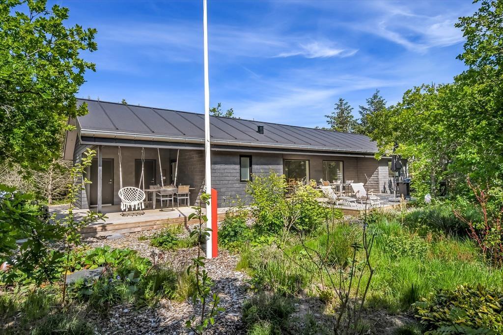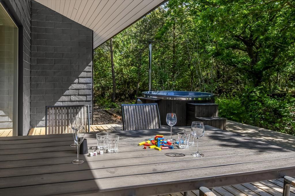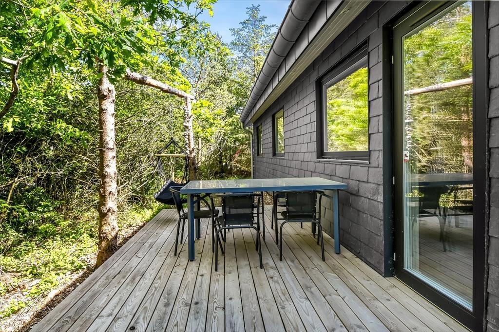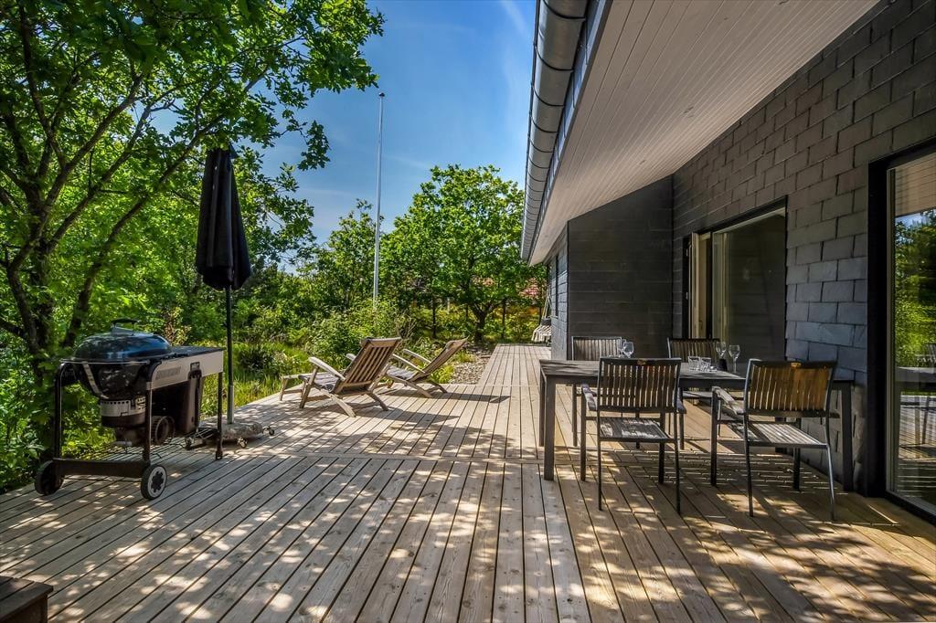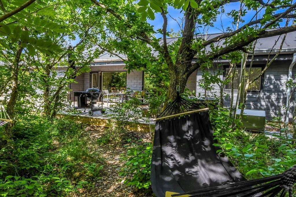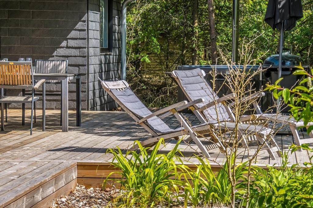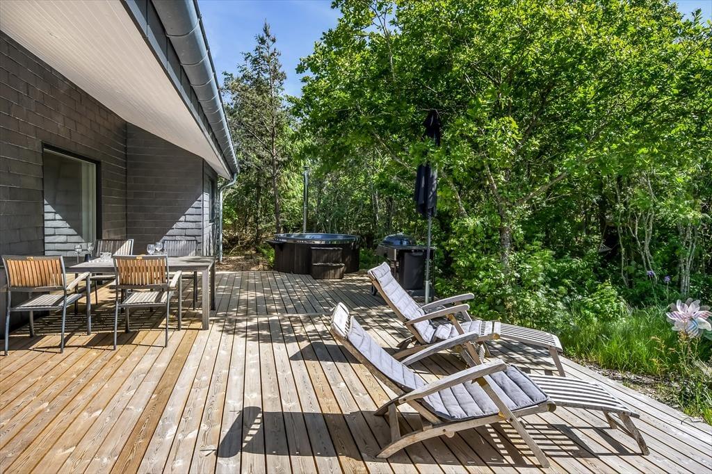 Auf dem 1.193 m großen Naturgrundstück schirmt die Bepflanzung das Haus und die Terrasse angenehm ab und bietet einen üppig grünen Rahmen für Urlaubstunden unter freiem Himmel. Eine teilweise überdachte, schön große Holzterrasse schmiegt sich gen Süden an das Haus. Auf der anderen Seite liegt eine kleinere Terrasse, wodurch Sie zwischen verschiedenen Aufenthaltsplätzen wählen können. Falls Sie sich nicht gerade auf der Terrasse sonnen, entspannen oder grillen möchten, können Sie mit den Kindern zwischen den Bäumen verstecken spielen, sich zu geselligen Runden rund um die Feuerstelle versammeln oder ein Nickerchen in der Hängematte genießen.