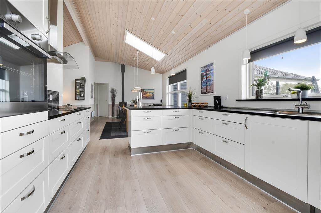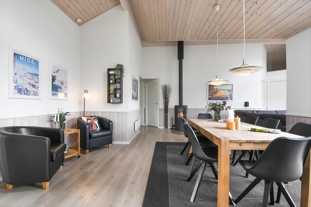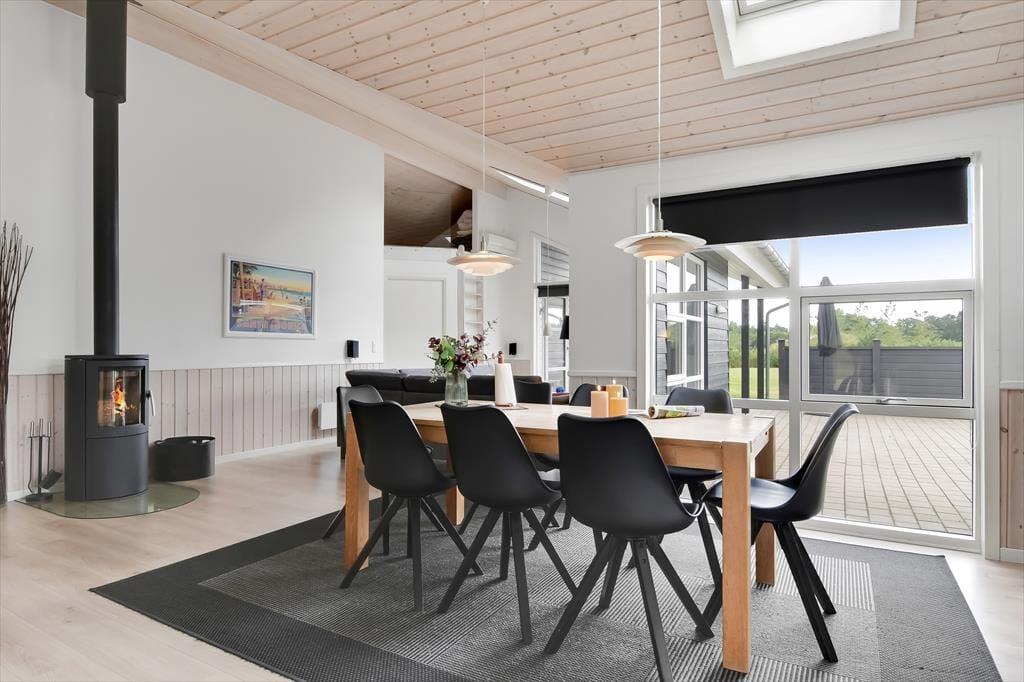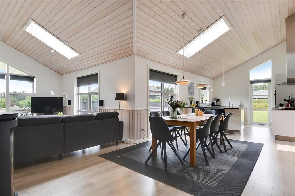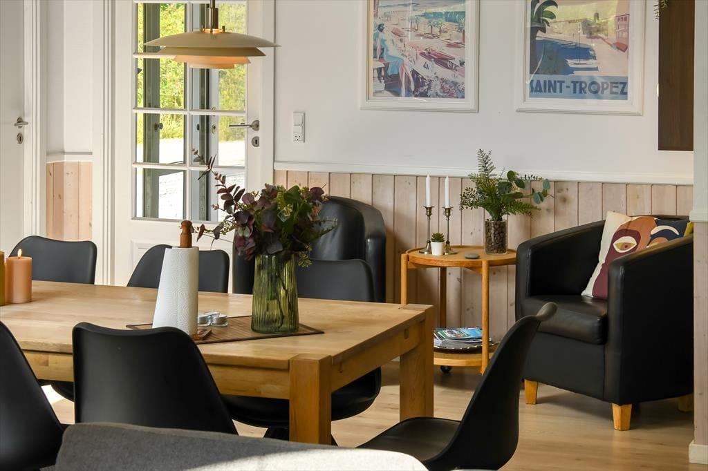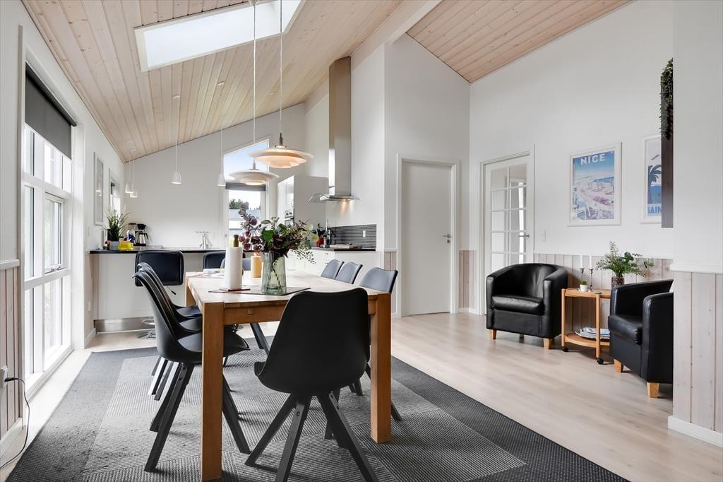 Schon von außen sieht man, dass hier im Rørkrogen 10 alles in bester Ordnung ist. Das Ferienhaus präsentiert sich mit einer eleganten dunklen Fassade mit weißen Details. Es herrscht eine helle Atmosphäre im Haus. Im Wohnzimmer gibt es eine offene Decke bis zum Giebel mit Dachfenstern und großen Fenstern, die eine schöne Verbindung zu den Außenbereichen schaffen. Die offene Küche bietet viel Platz, sodass mehrere Personen problemlos gemeinsam kochen können. Oder du setzt dich einfach auf einen der Barhocker und leistest dem Koch Gesellschaft. Mit einem Kaminofen und einer komfortablen Sofaecke lädt der Wohnbereich zu gemütlichen Stunden ein. Wenn du dich komplett entspannen möchtest, kannst du die Sauna nutzen oder eine entspannte Pause im Whirlpool einlegen. Den Spabereich findest du im größeren der zwei zentral gelegenen Badezimmer. Es gibt vier Schlafzimmer, daher ist die Raumaufteilung ideal für acht Personen.