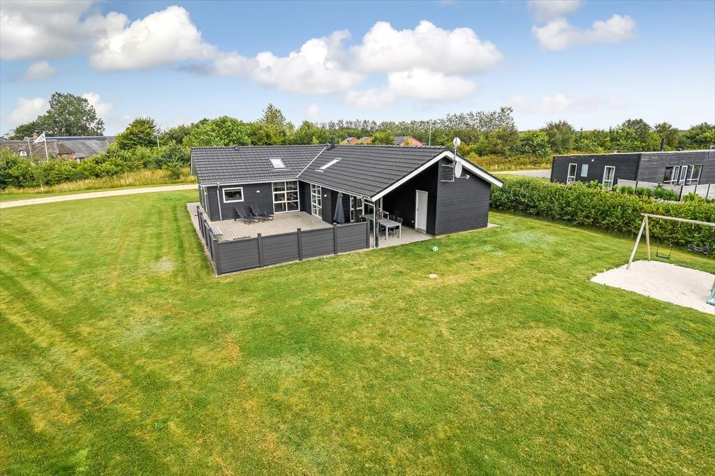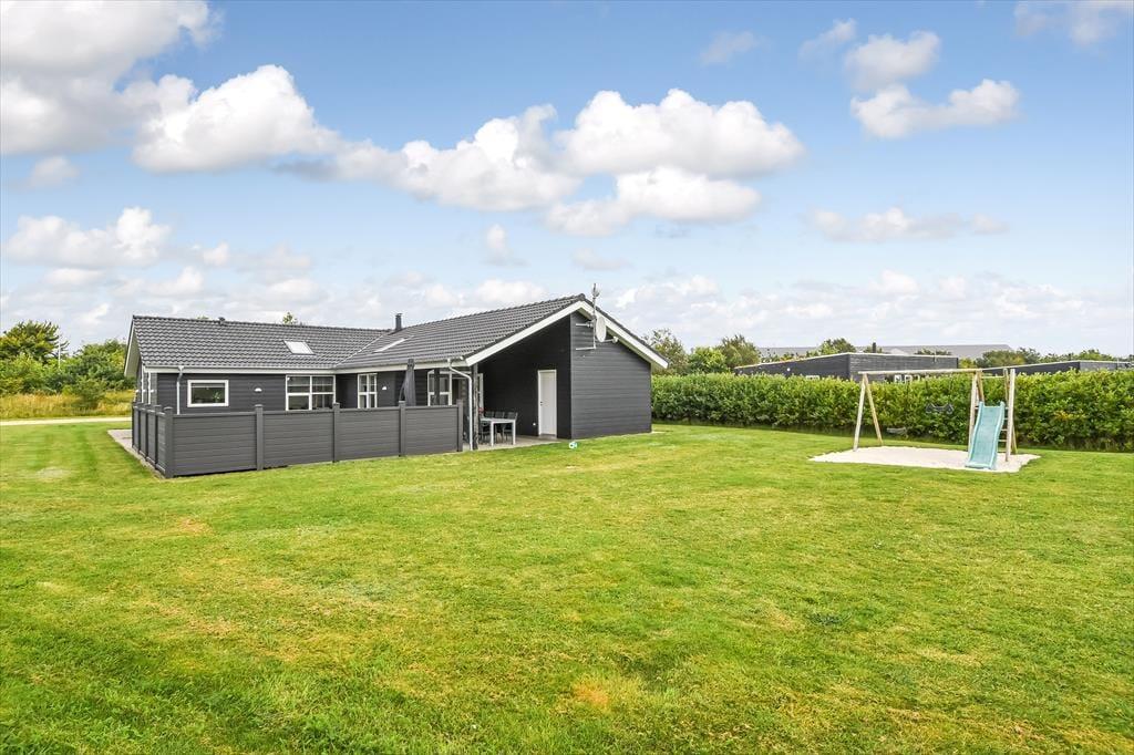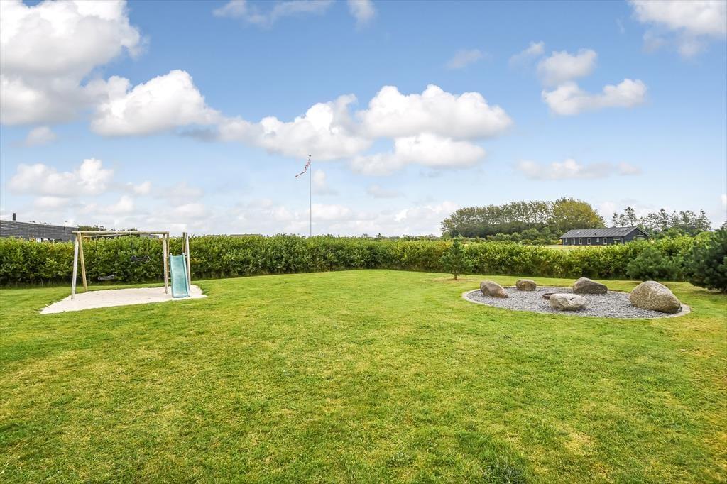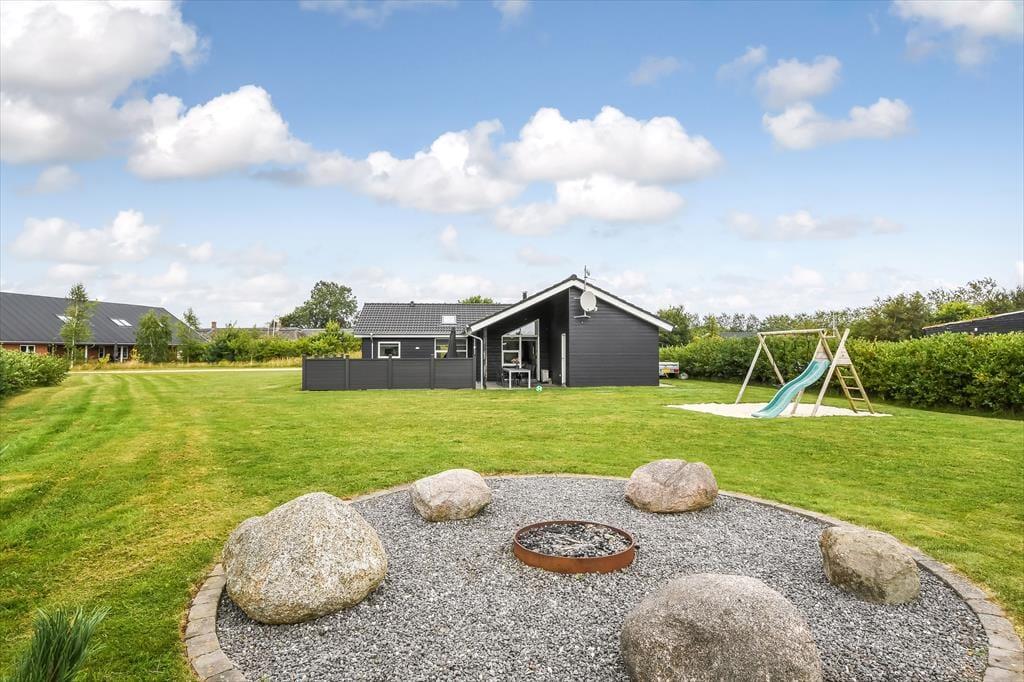 Das Ferienhaus liegt auf einem großen und gepflegten Grundstück mit einer grünen Rasenfläche und einer Hecke als Umrandung. Wenn du Kinder dabei hast, werden sie sicher sofort hinauslaufen wollen, um Ball oder Fangen zu spielen. Es gibt auch Schaukeln, eine Rutsche und eine Sandkiste, an denen sich die jüngsten Urlauber erfreuen können. Die Feuerstelle ist ein gemütlicher Ort, an dem sich die ganze Familie versammeln kann, um Stockbrot zu backen oder Marshmallows zu rösten – an einem klaren Herbsttag oder an einem ruhigen Sommerabend in der Dämmerung. Die große, teilweise überdachte Terrasse lädt ebenfalls zu vielen schönen Momenten ein, egal ob du dich mit einem kühlen Eiskaffee und einem guten Buch zurücklehnst oder für ein festliches Mittagessen mit deinen Lieben eindeckst.