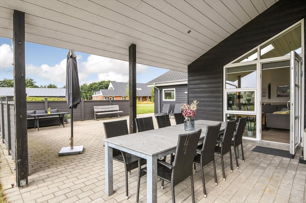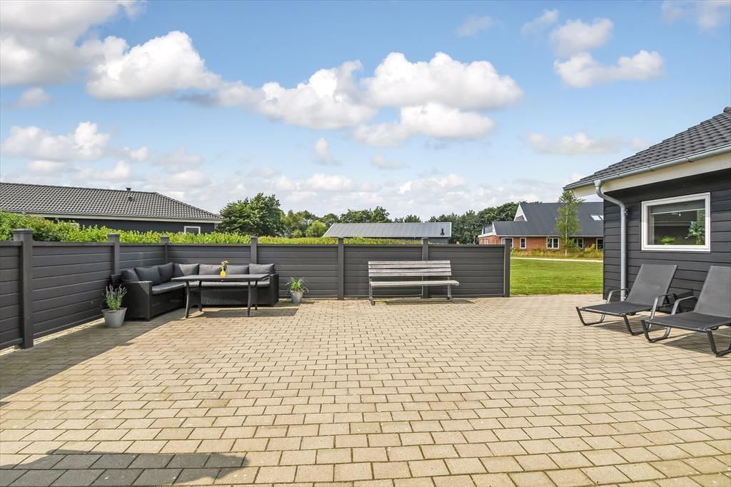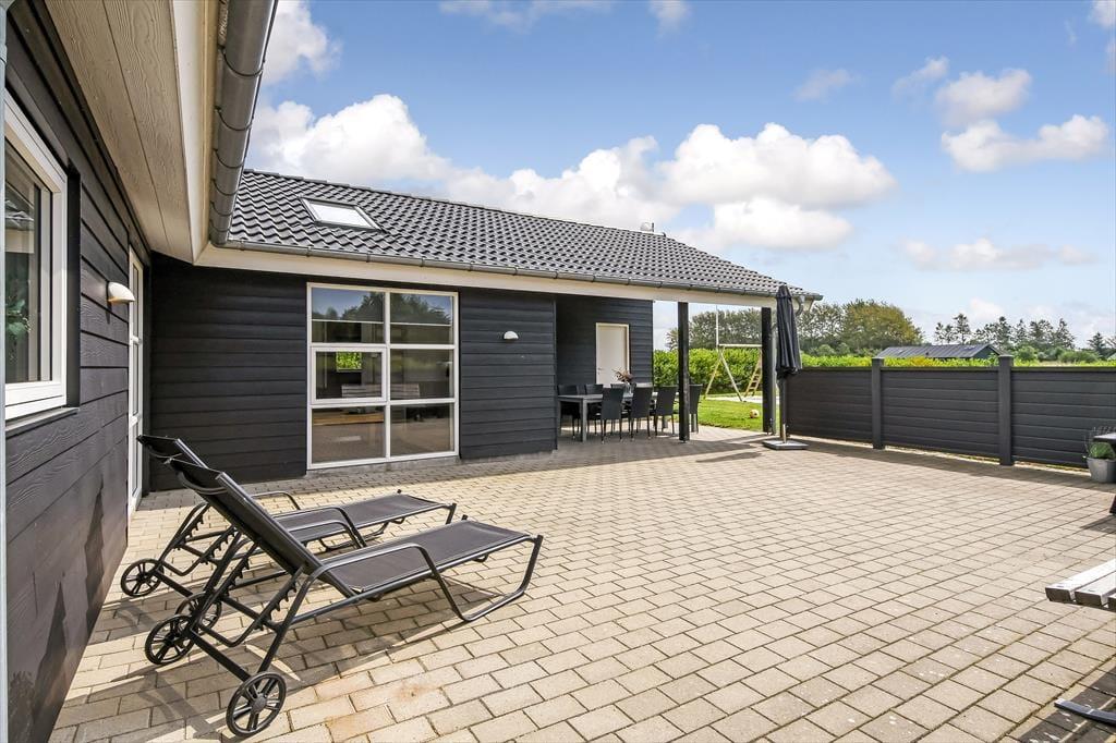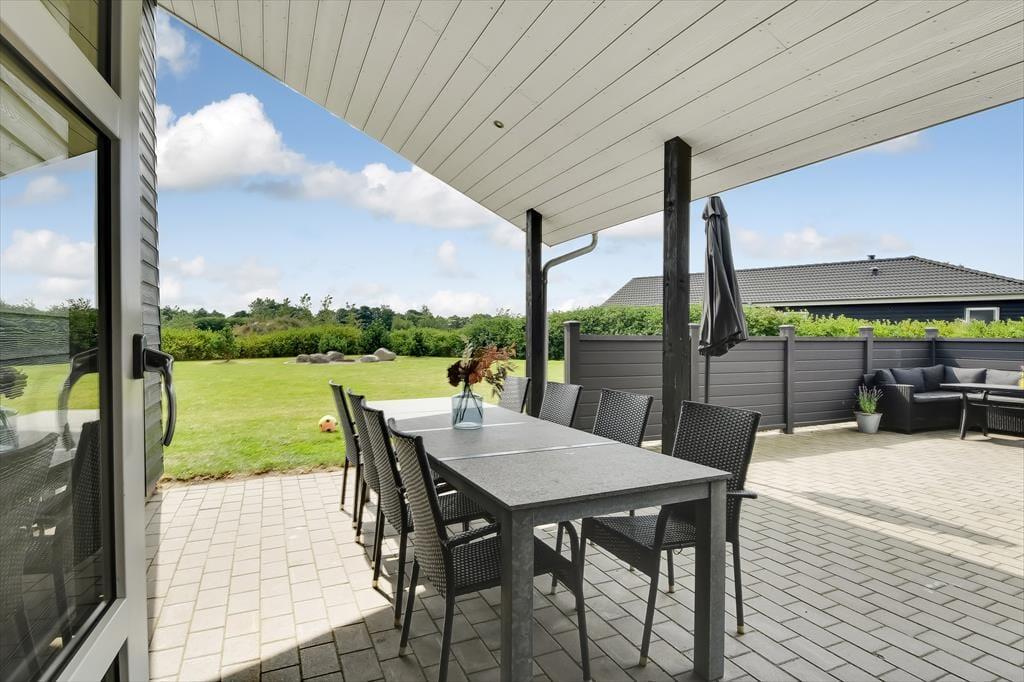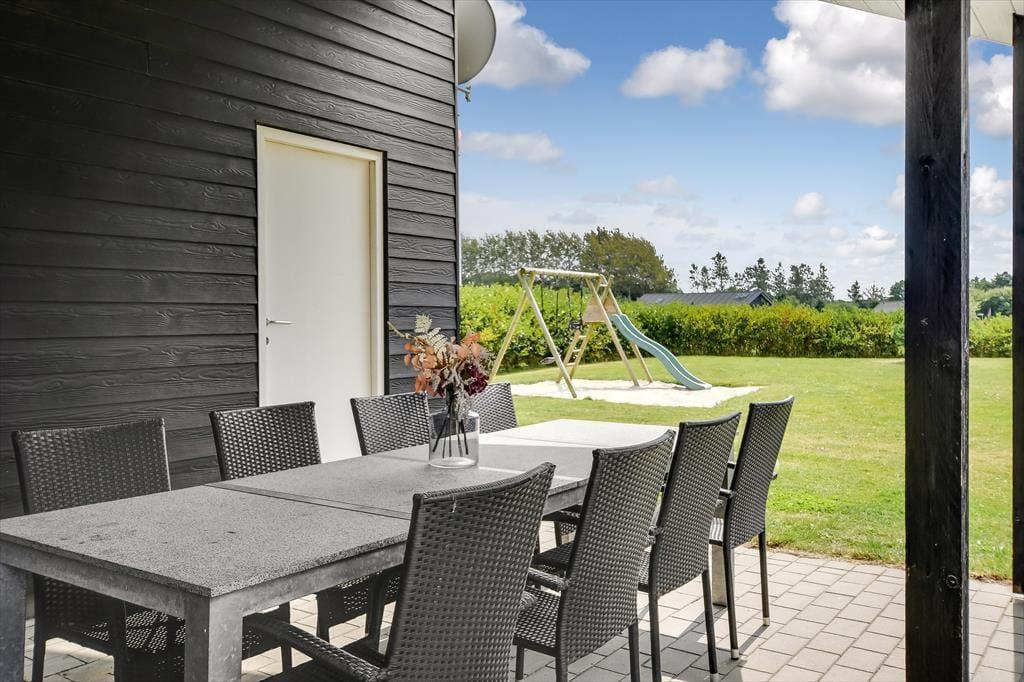 Das Ferienhaus liegt auf einem großen und gepflegten Grundstück mit einer grünen Rasenfläche und einer Hecke als Umrandung. Wenn du Kinder dabei hast, werden sie sicher sofort hinauslaufen wollen, um Ball oder Fangen zu spielen. Es gibt auch Schaukeln, eine Rutsche und eine Sandkiste, an denen sich die jüngsten Urlauber erfreuen können. Die Feuerstelle ist ein gemütlicher Ort, an dem sich die ganze Familie versammeln kann, um Stockbrot zu backen oder Marshmallows zu rösten – an einem klaren Herbsttag oder an einem ruhigen Sommerabend in der Dämmerung. Die große, teilweise überdachte Terrasse lädt ebenfalls zu vielen schönen Momenten ein, egal ob du dich mit einem kühlen Eiskaffee und einem guten Buch zurücklehnst oder für ein festliches Mittagessen mit deinen Lieben eindeckst.