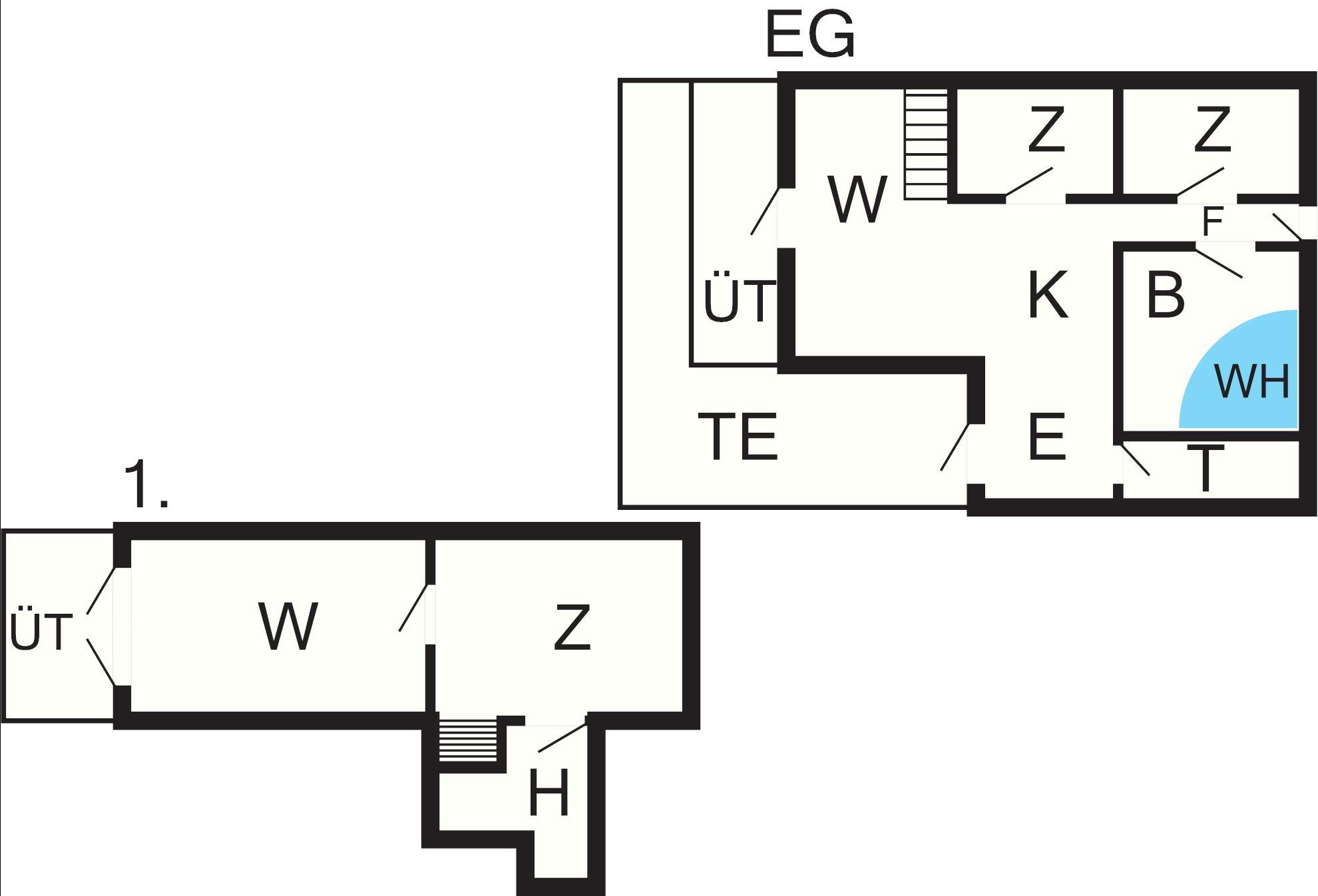 Bad: Waschm, Trockner, WC, Waschb., Dusche, Fußbodenheiz.