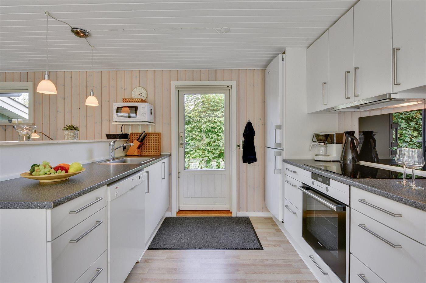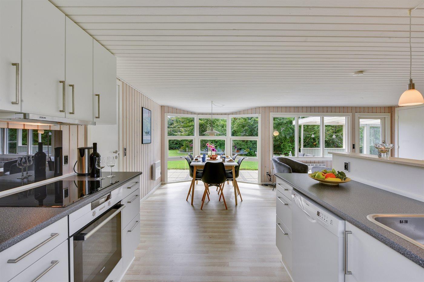 Die Küche ist mit Kühlschrank ausgestattet. Außerdem gibt es 4 Keramik-Kochfelder, Umluftofen, Mikrowelle sowie Geschirrspüler.