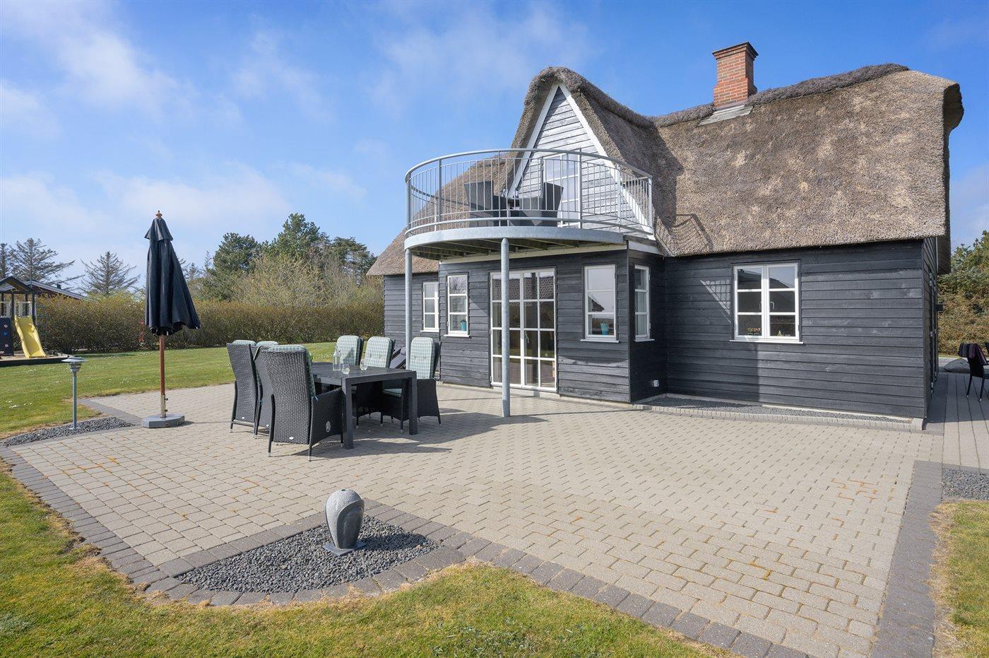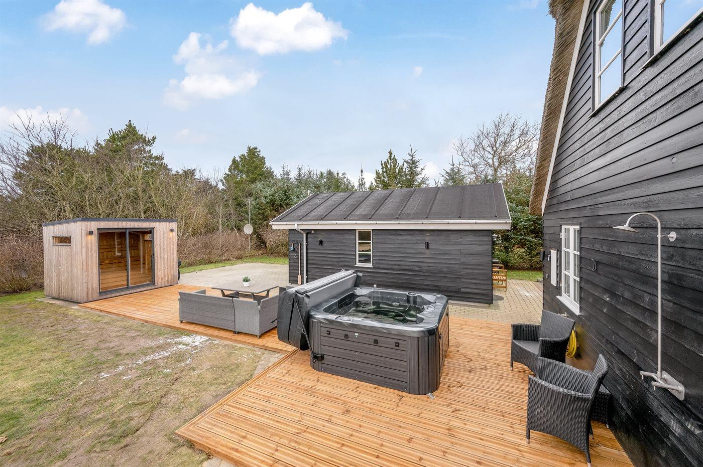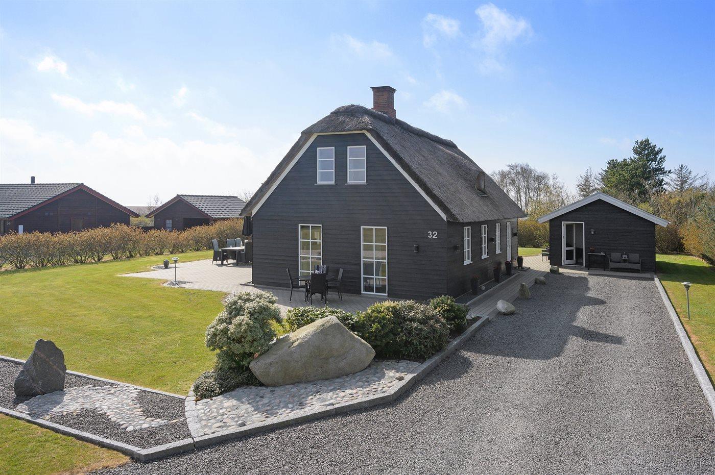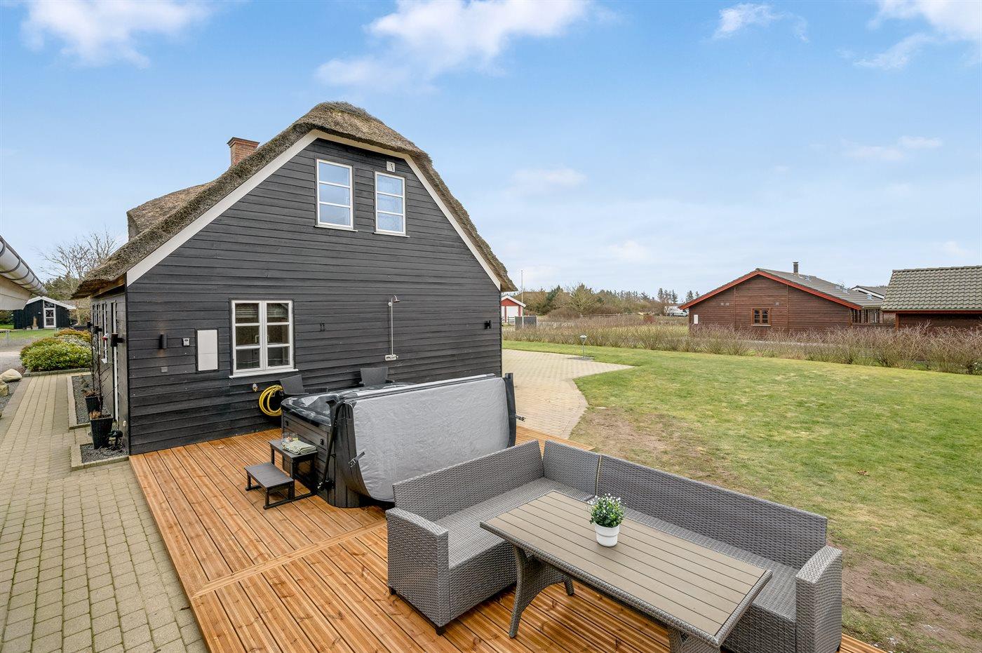 Nettes Luxusferienhaus in 2 Etagen gebaut und mit Aussicht über Ringkøbing Fjord vom Obergeschoss, auf einem schönen Naturgrundstück gelegen. Das Haus aus Holz und mit Reetdach ist 2008 gebaut. Zum Haus gehören sowohl offenes als überdachtes Terrassenareal mit diversen Gartenmöbeln und ein Balkon. Außerdem stehen eine Außensauna für 8 Personen sowie ein Außen-Whirlpool für 6 Personen zur Verfügung, die das ganze hindurch benutzt weden können.