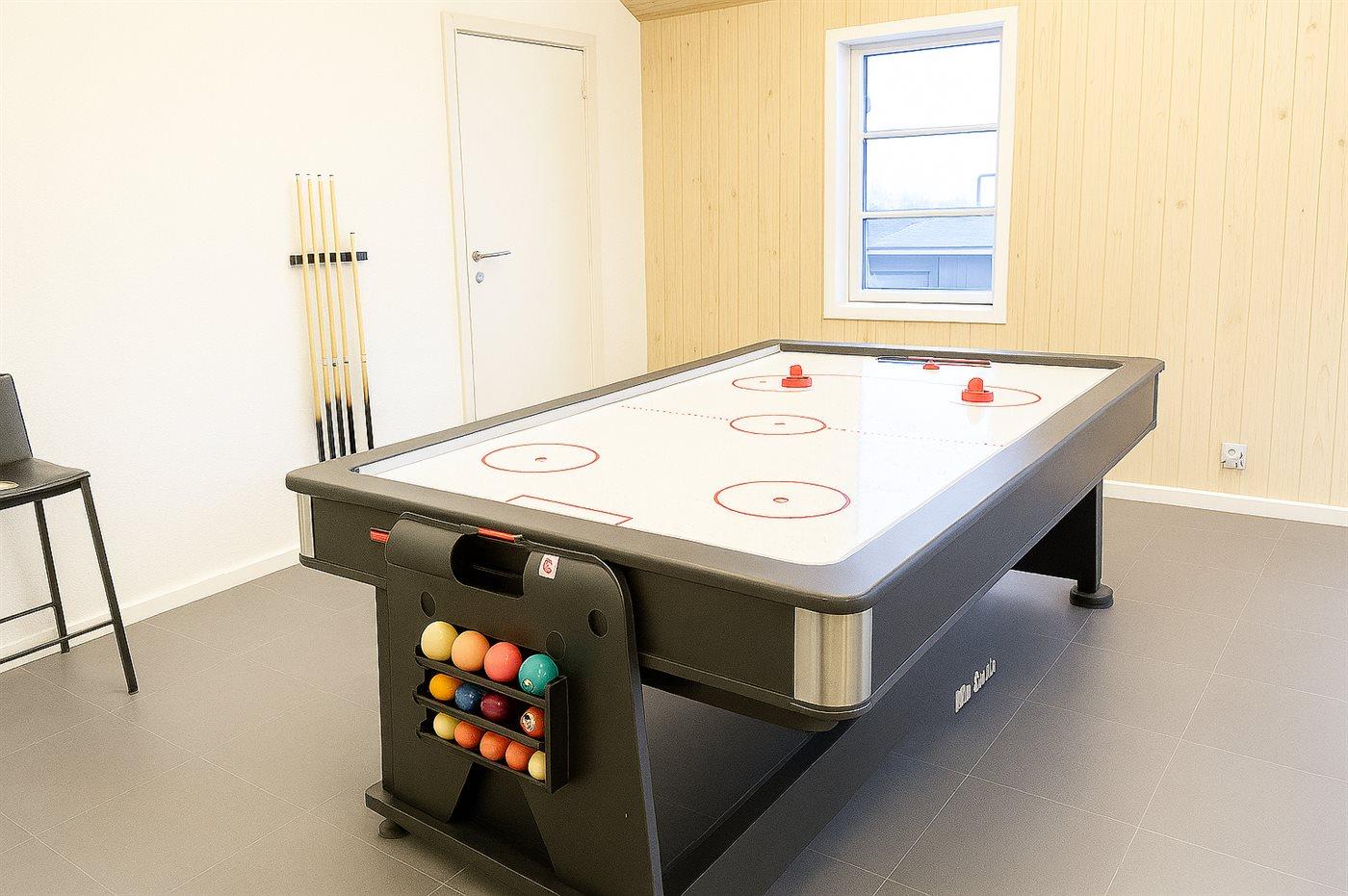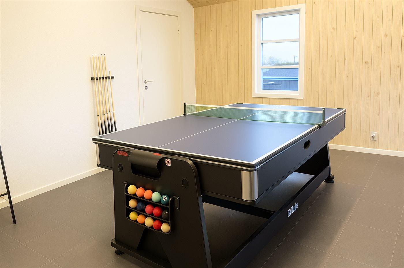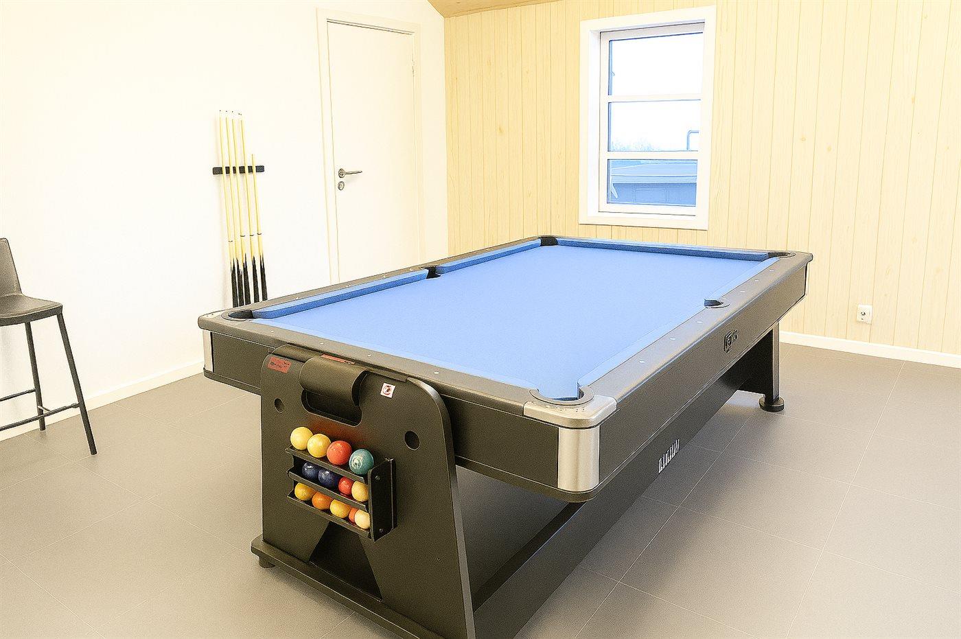 Zum Haus gehört ein Aktivitätenraum, der mit Pooltisch, Tischfußball, elektronischem Dartspiel und TV eingerichtet ist. Innen gibt es Holzböden überall, jedoch beheizbarer Klinkerboden im Flur und Teppichböden im Obergeschoss. 2 nette Badezimmer, beide mit Fußbodenheizung und Duschnische. Im großen Badezimmer im Erdgeschoss gibt es außerdem eine Badewanne.